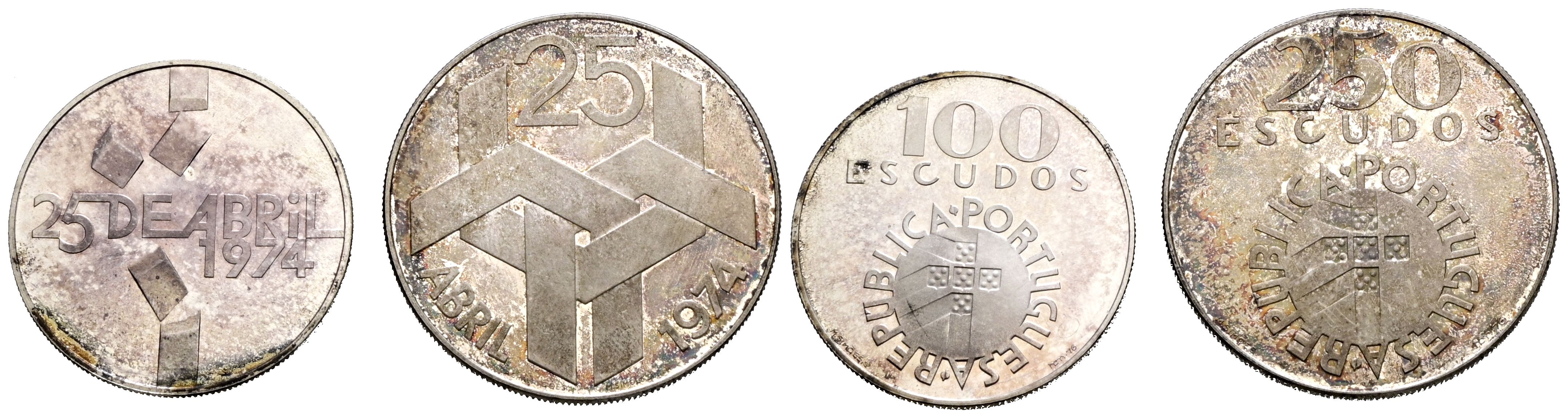 PORTUGAL. Pareja de monedas conmemorativas en plata de la Revolución de los Claveles. 1976. Módulos de 100 y 250 Escudos. Diferentes estados de conservación. A EXAMINAR.