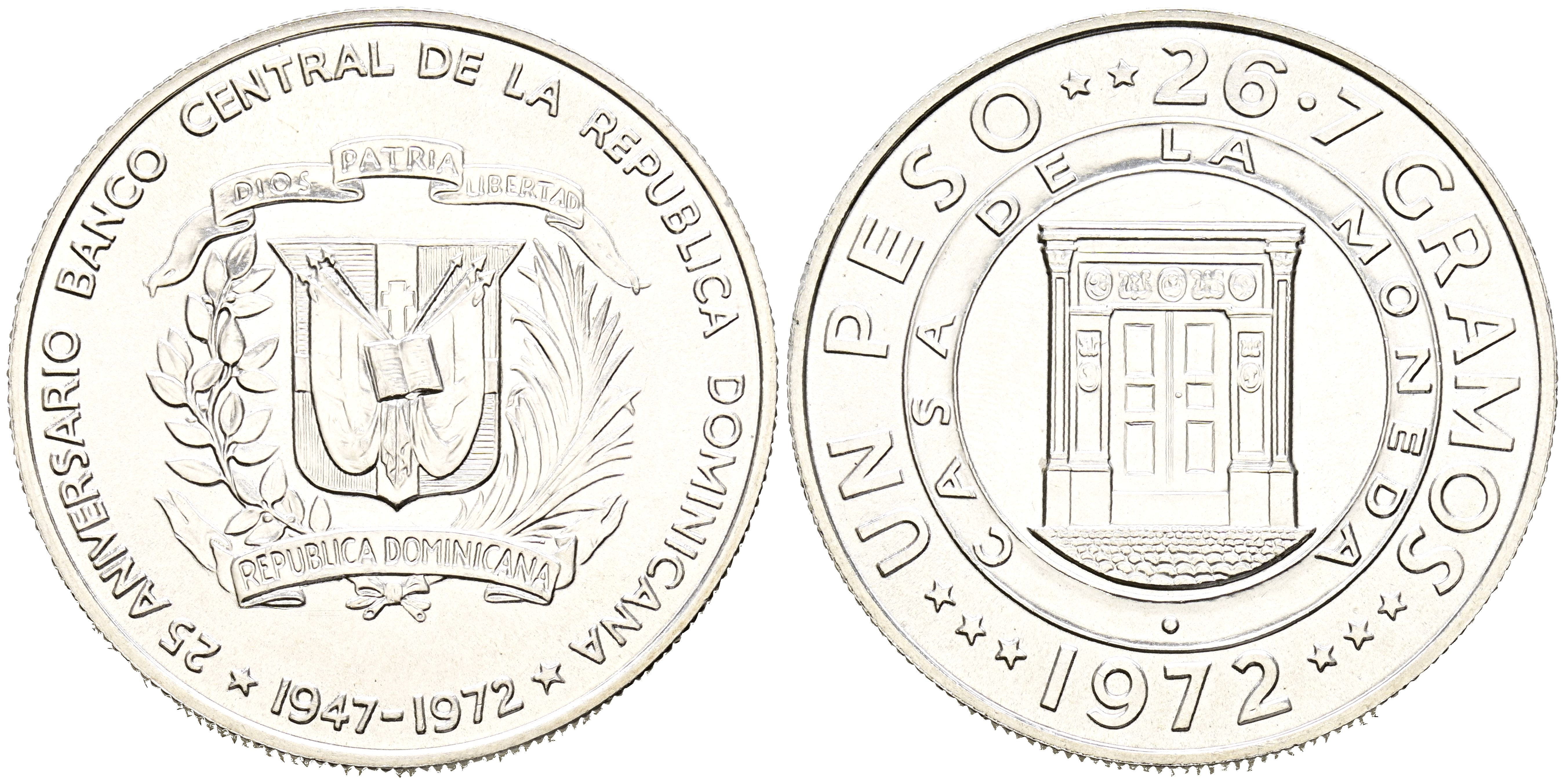 REPÚBLICA DOMINICANA. 1 Peso. (Ar. 26,85g/38mm). 1972. 25 Aniversario del Banco Central. (Km#34). SC.