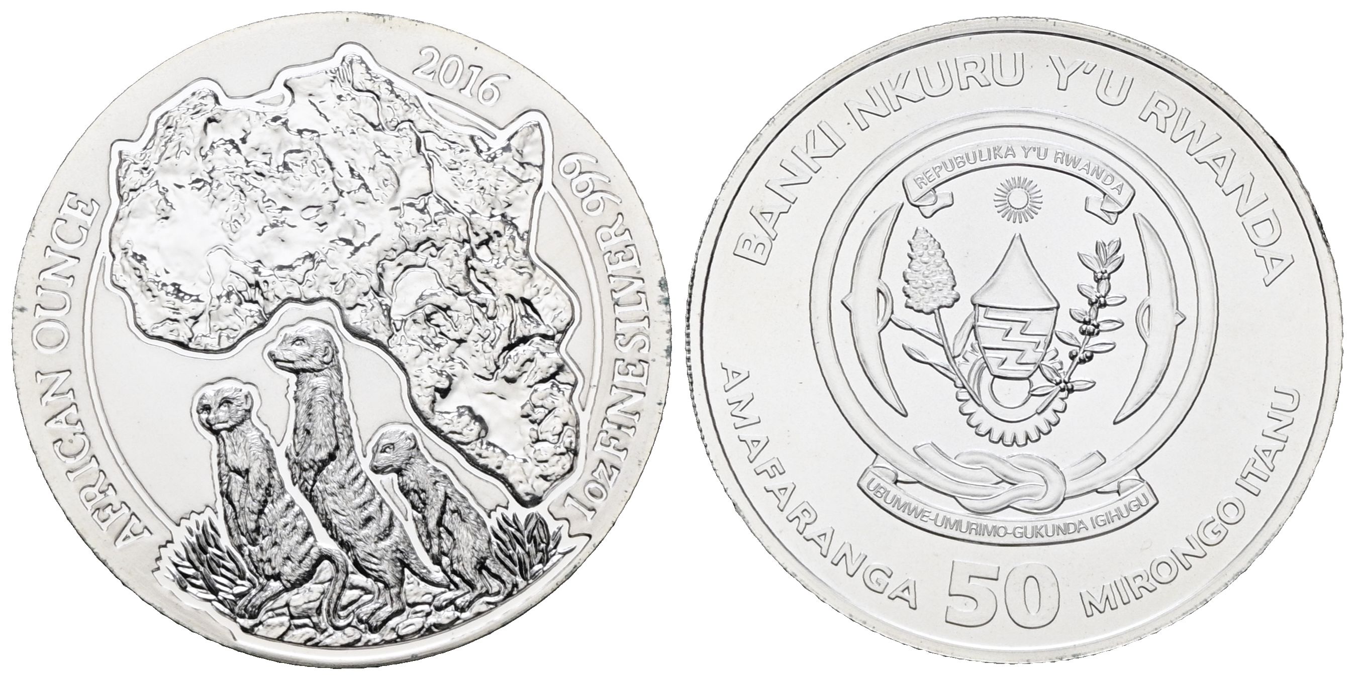 RUANDA. 50 Franc. (Ar. 31,10g/40mm). 2016. Fauna de Ruanda: Suricata. Plata de 0,999 milésimas. En blister original sin abrir.