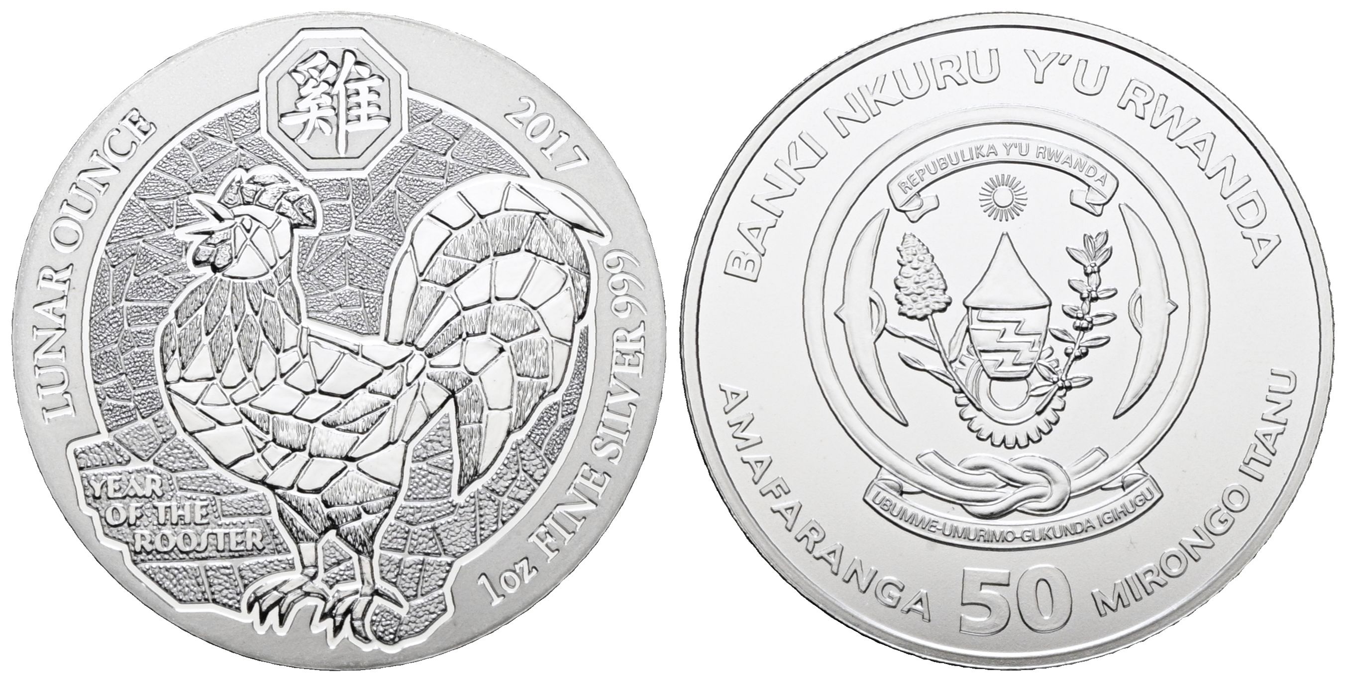 RUANDA. 50 Franc. (Ar. 31,10g/40mm). 2017. Calendario Lunar: Año del Gallo. Plata de 0,999 milésimas. En blister original sin abrir.
