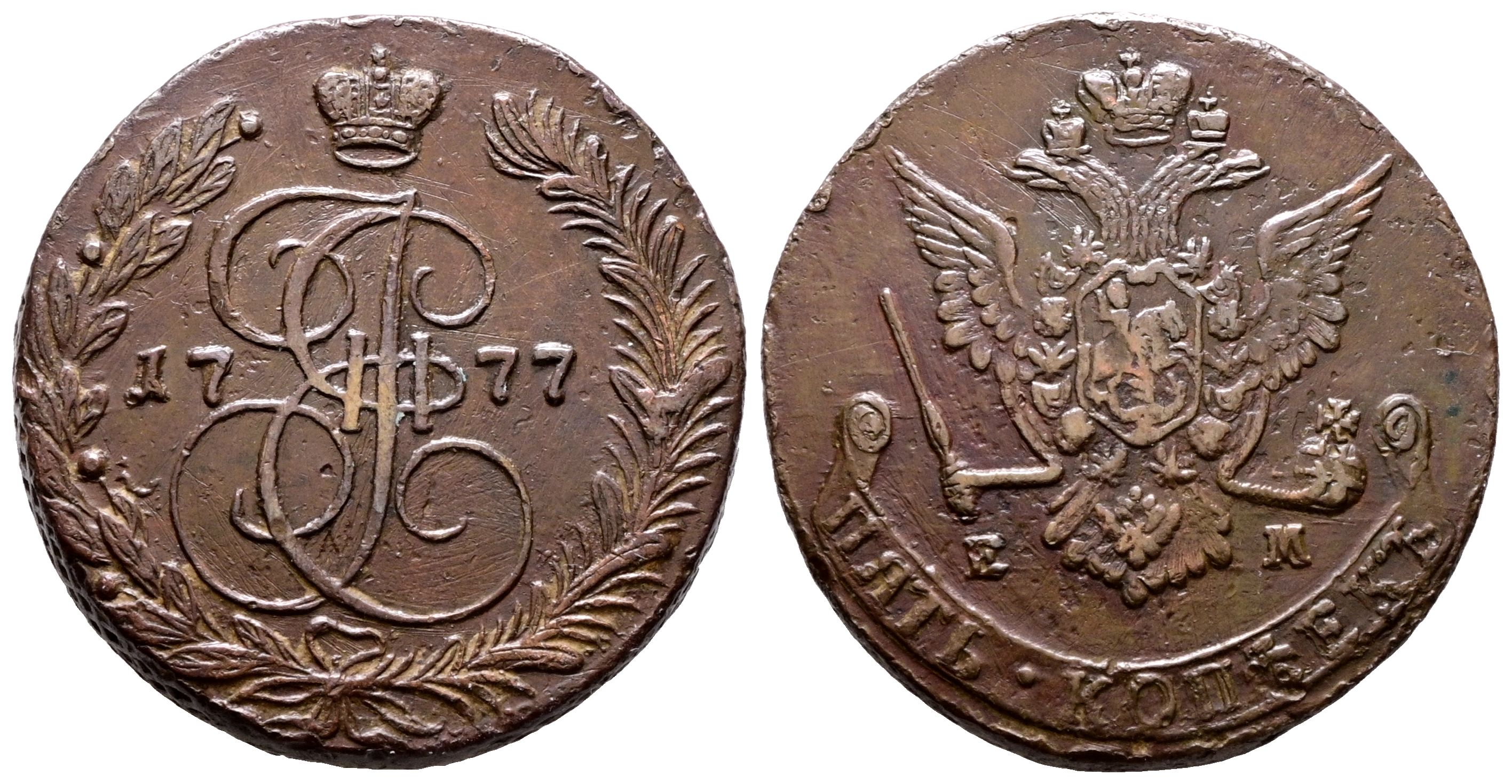 RUSIA, Catalina II (1762-1796). 5 Kopeks. (Ae. 59,07g/42mm). 1777. Ekaterinburgo EM. (Km#59.3). MBC.