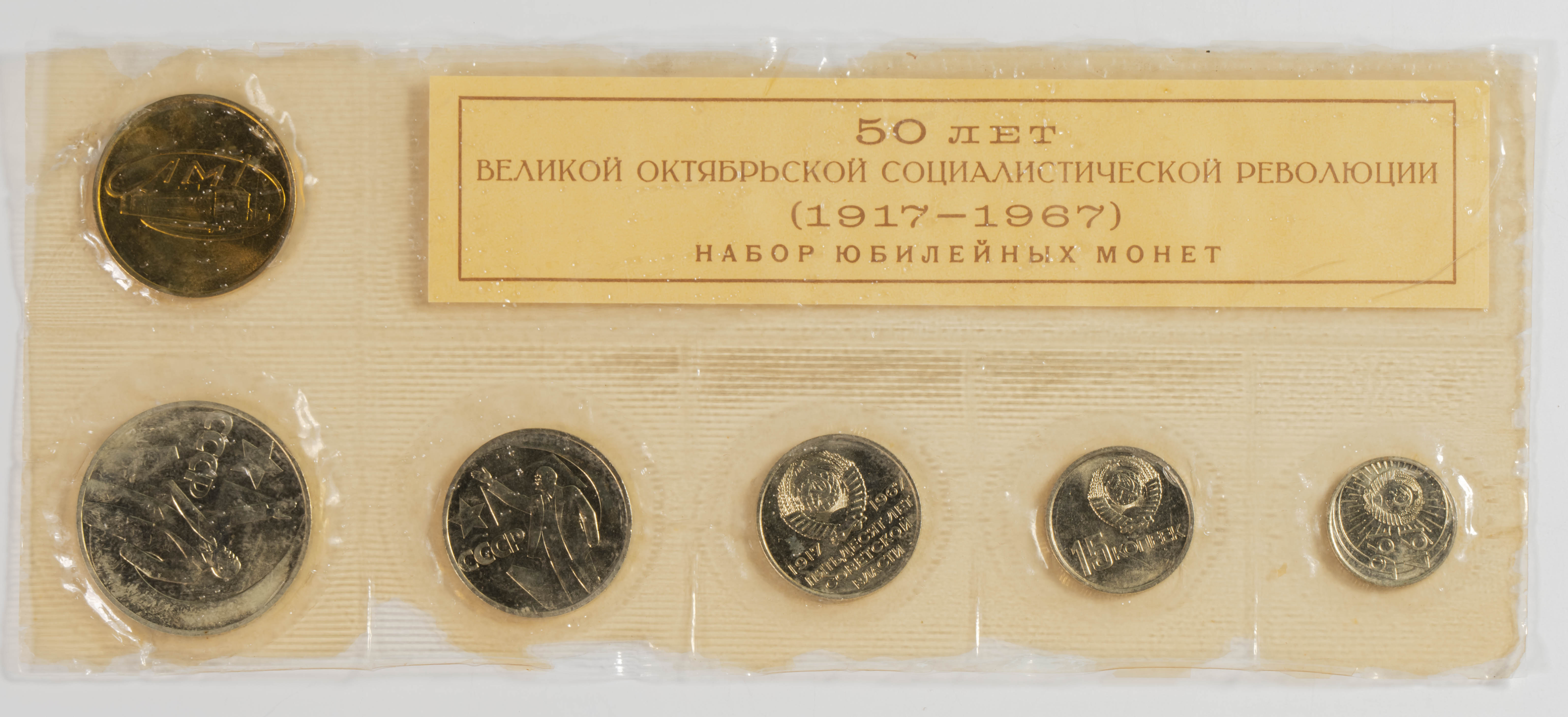 RUSIA. Set completo y compuesto por 6 piezas (5 monedas de diferentes valores más 1 medalla) conmemorativas del 50 Aniversario de la Revolución de Octubre de 1917. SC. En blister original sin abrir.