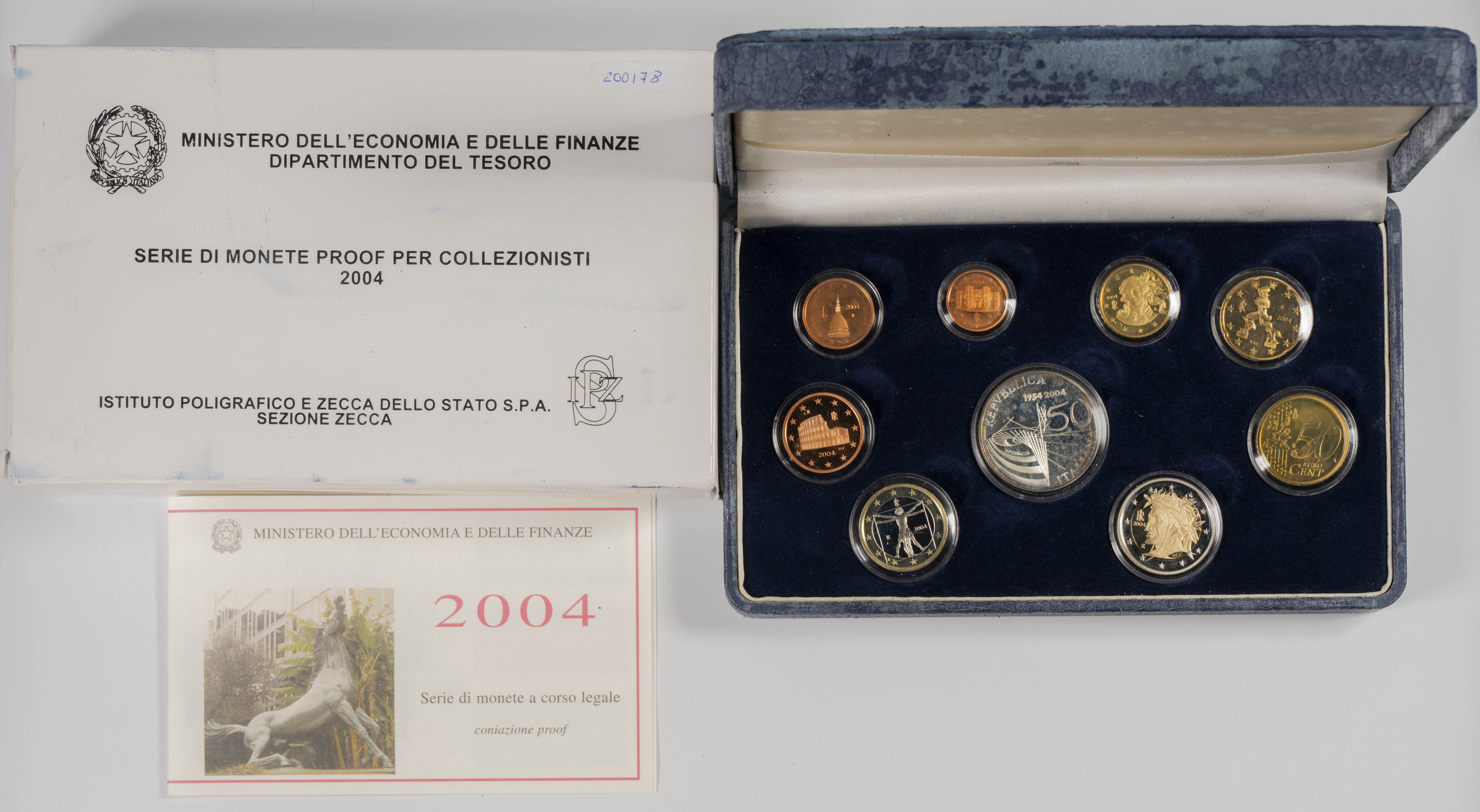 SAN MARINO. Estuche completo con 9 valores comprendidos entre 1 Céntimo y 2 Euros. 2004. Incluye además una medalla en plata con valor de 5 Euros. Estuche completo, aunque algo deteriorado, y certificado de autenticidad. PROOF.