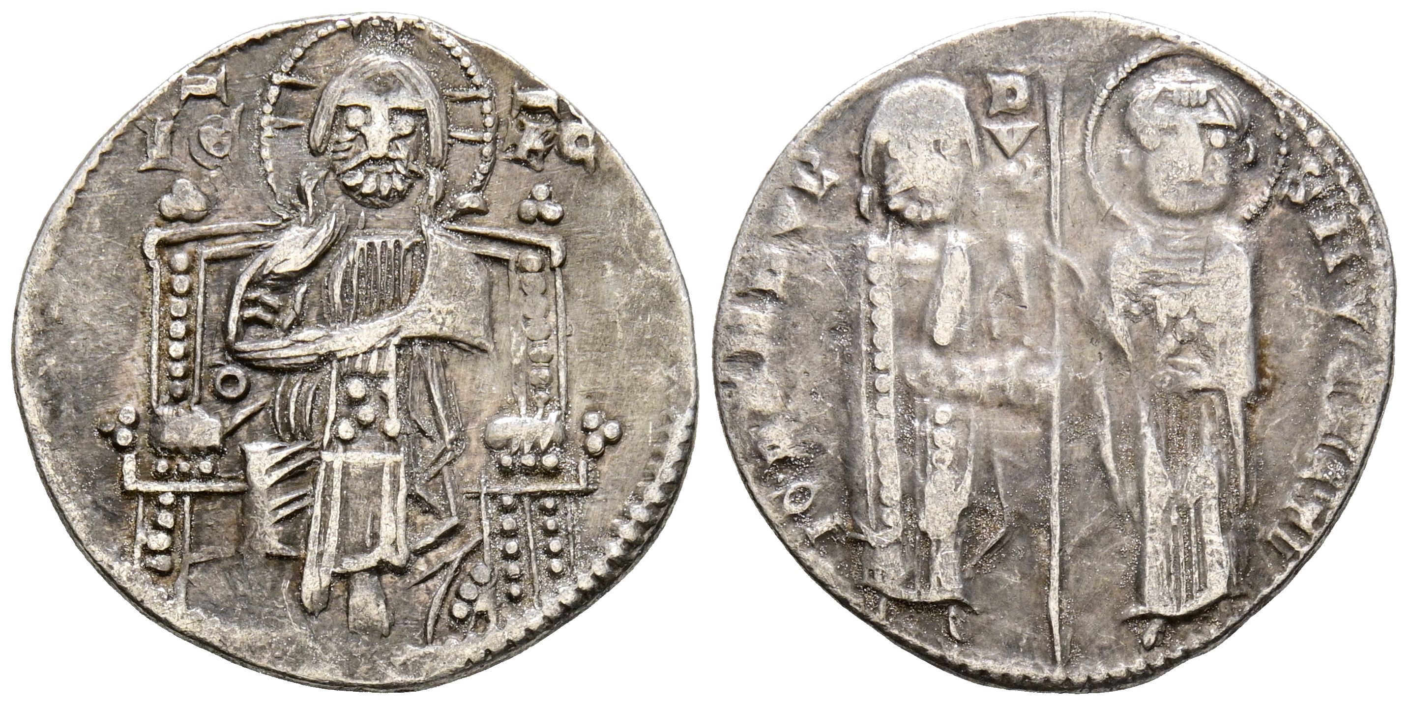 SERBIA. Stefan Uroš II Milutin. Dinar. (Ar. 2,10g/20mm). 1282-1321. (Jovanovic 7). Anv: Cristo pantocrátor entronizado, a los lados: IC-XC. Rev: Stefan Uros y San Stefan estantes y de frente, sosteniendo entre ellos un estandarte con una cruz en el asta, alrededor leyenda: S STЄFAN VROSIVS / RЄX. MBC.