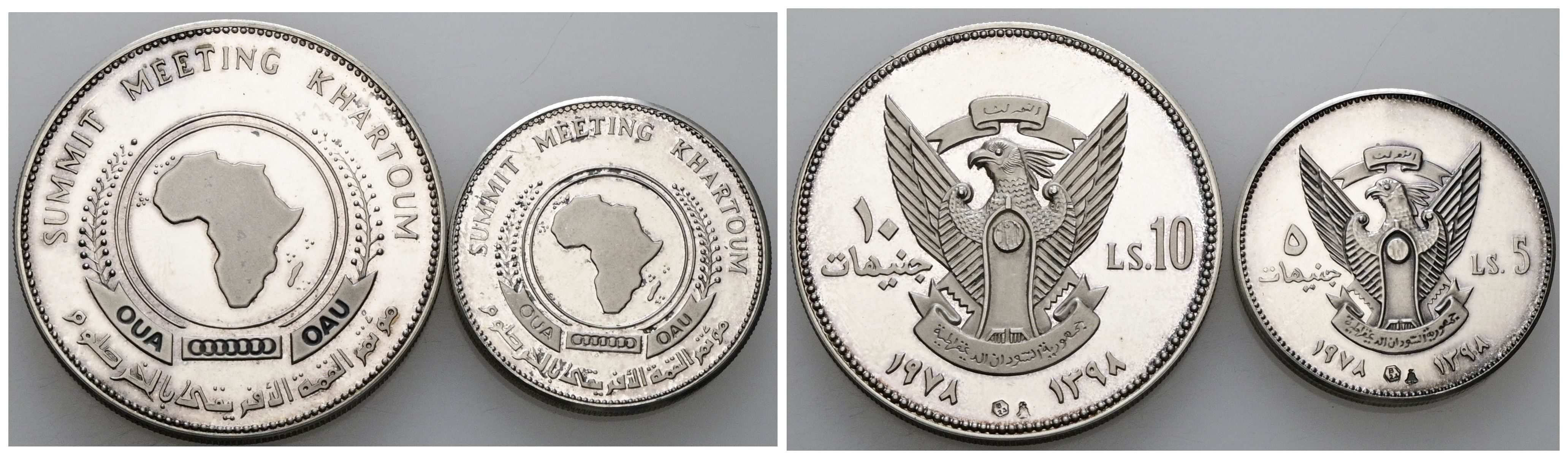 SUDÁN. Pareja de 5 y 10 Libras acuñadas con motivo de la Cumbre de Jartum. 1978. Organización de la Unidad Africana. (Km#76 y 77). Con contramarca entre las fechas. PROOF. Escasas.