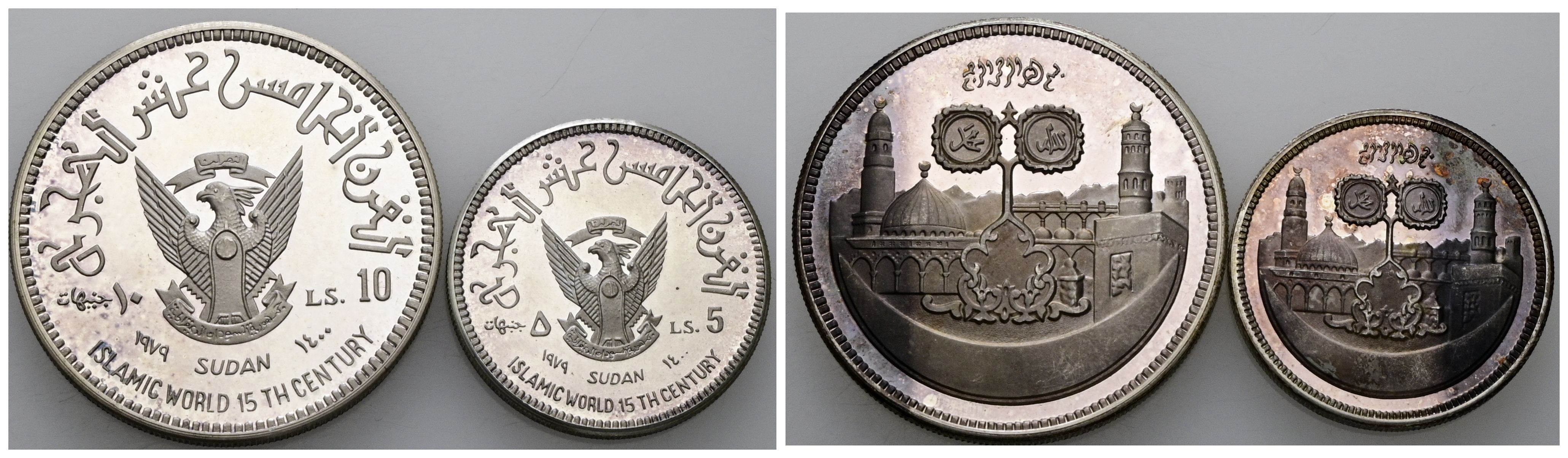 SUDÁN. Pareja de 5 y 10 Libras acuñadas con motivo de los 1400 años del Islam. 1979. (Km#80 y 81). PROOF. Escasas.
