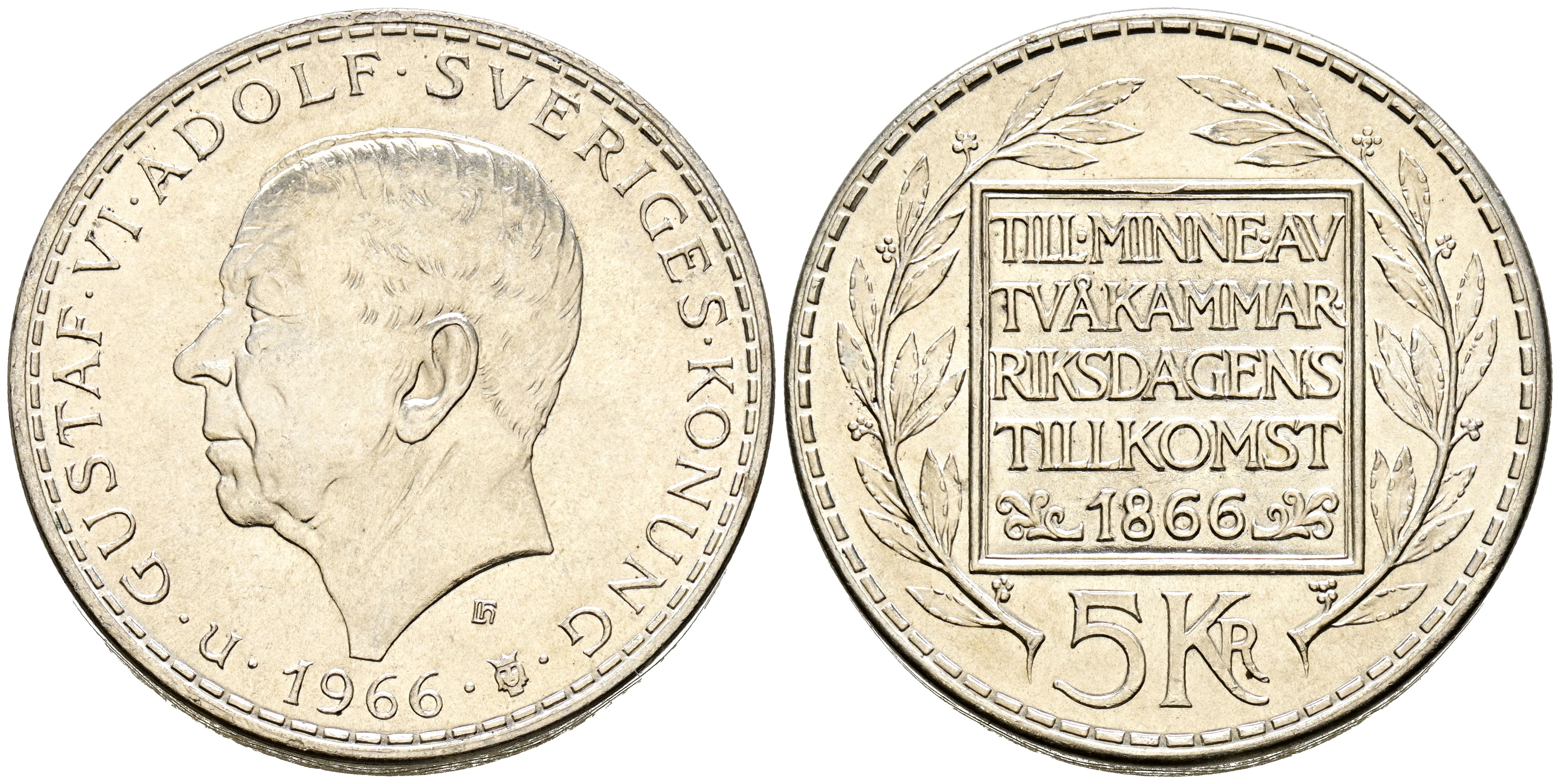 SUECIA. 5 Coronas (Ar. 18.20g/34mm). 1966. Centenario de la Reforma Constitucional. (Km#839). SC-.