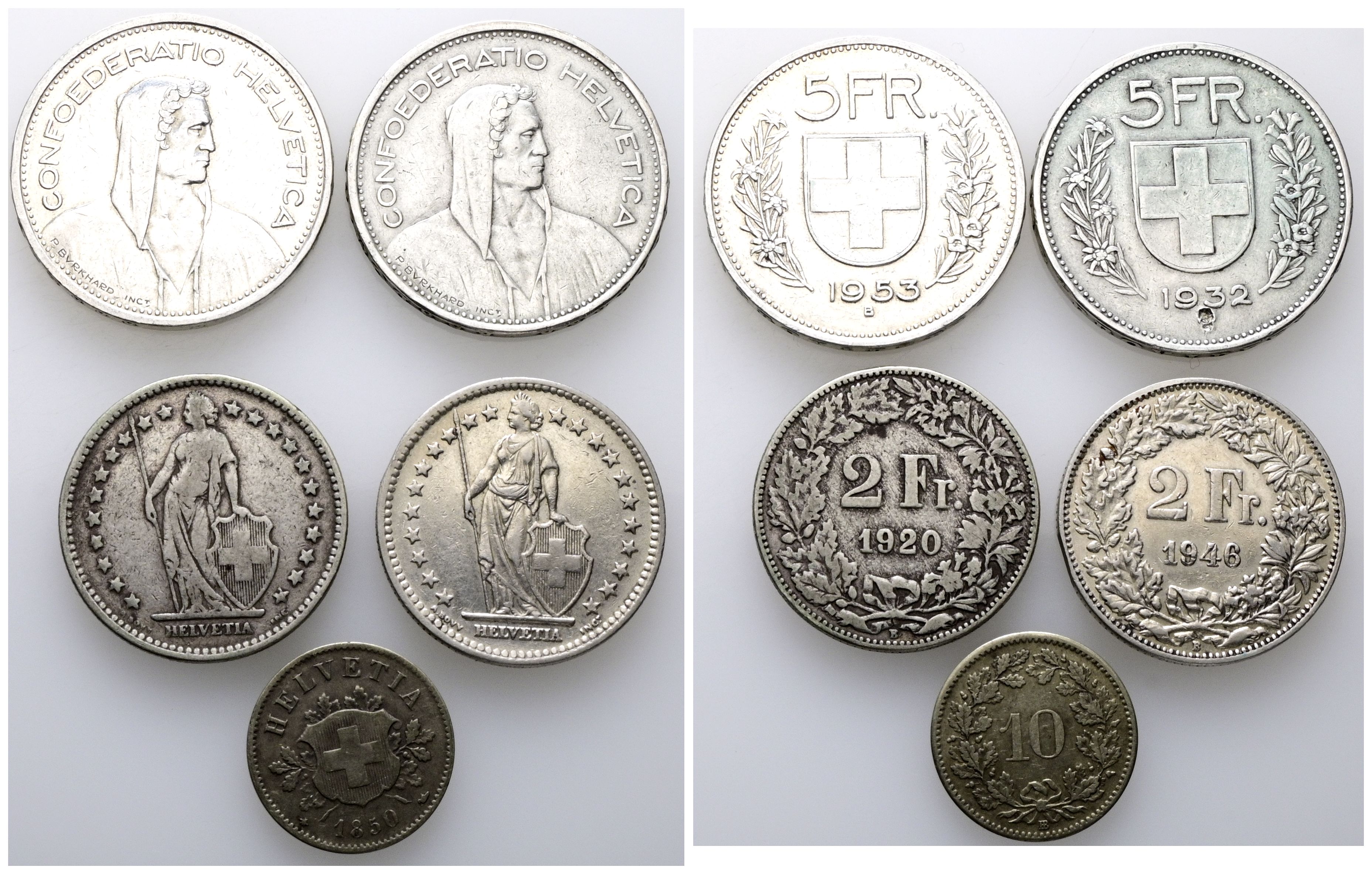 SUIZA. Interesante conjunto de 5 piezas en plata con variedad de módulos y acuñadas entre 1850 y 1953. Diferentes estados de conservación. A EXAMINAR.