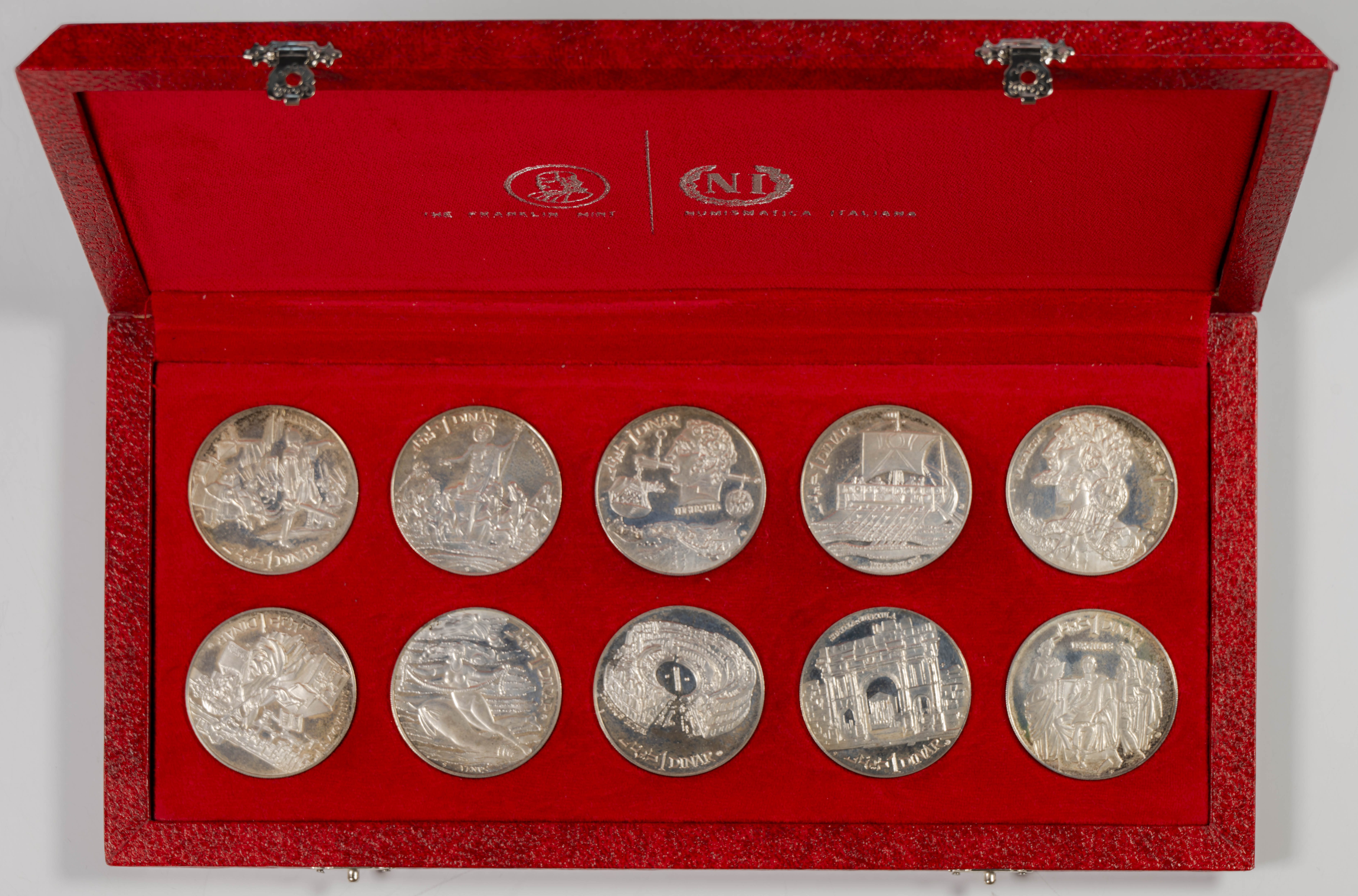 TÚNEZ. Estuche original compuesto por 10 monedas de 1 Dinar en plata. 1969. Serie Historia de Túnez. Franklin Mint y Numismática Italiana. Plata de 0,925 milésima. (Km#292-301). SC.
