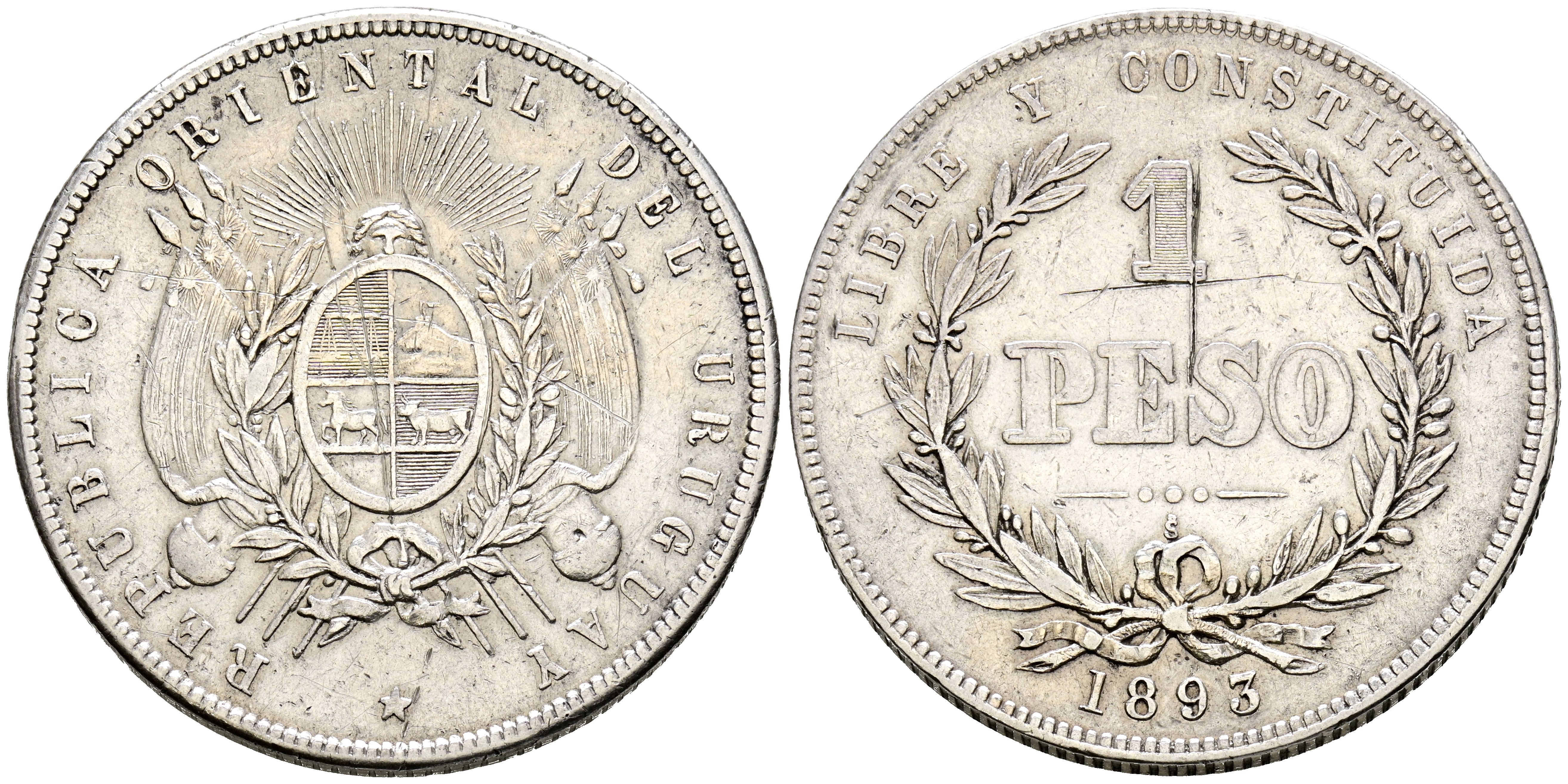 URUGUAY. 1 Peso. (Ar. 24,55g/37mm). 1893. Santiago S. (KM#17a). MBC-.