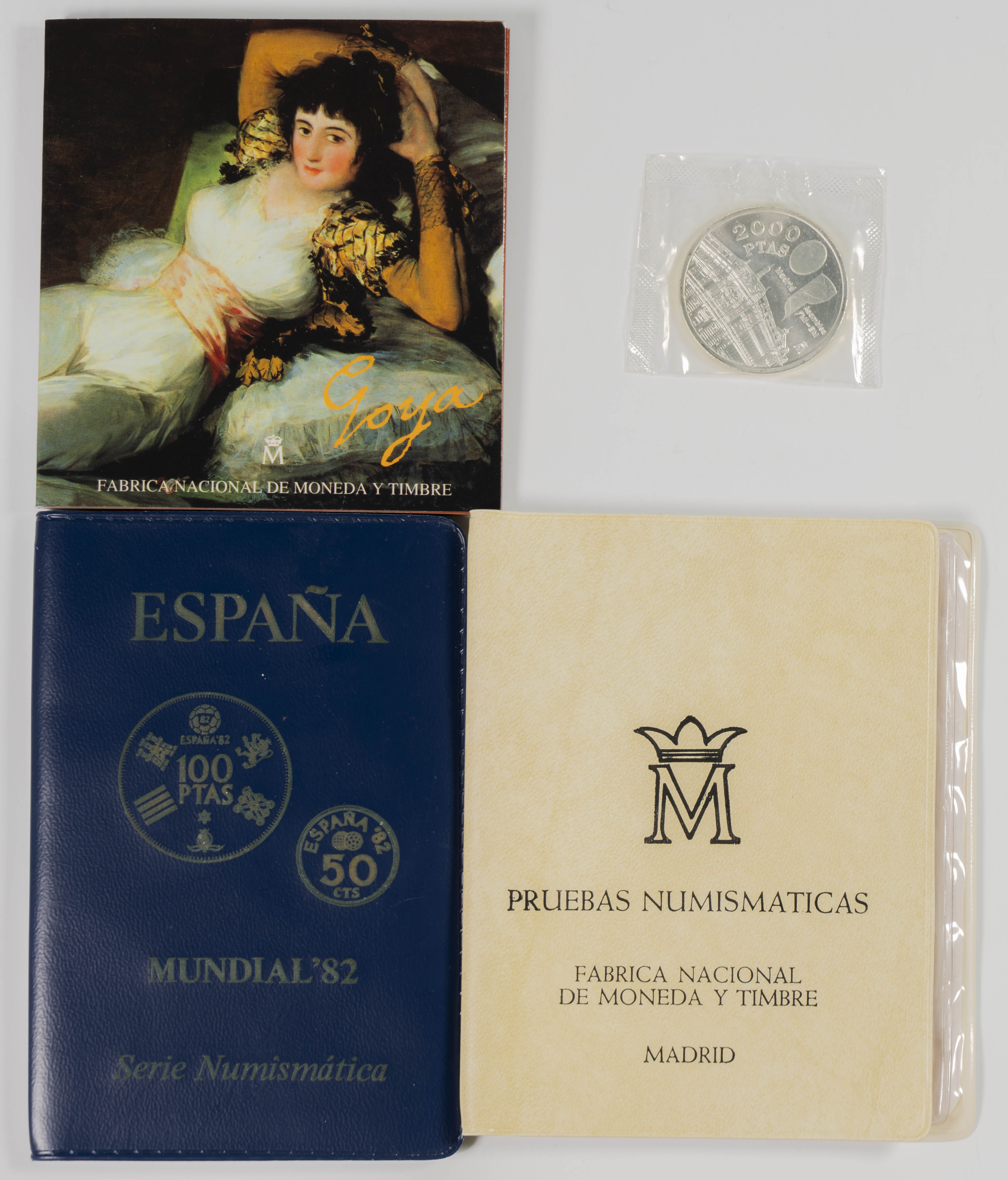 CONTEMPORÁNEO. Conjunto formado 2 piezas de 2000 Pesetas (una en estuche y otra en blister, 1994 y 1996) y 2 carteras de pruebas (1976 y 1980). Todas las piezas SC. A EXAMINAR.