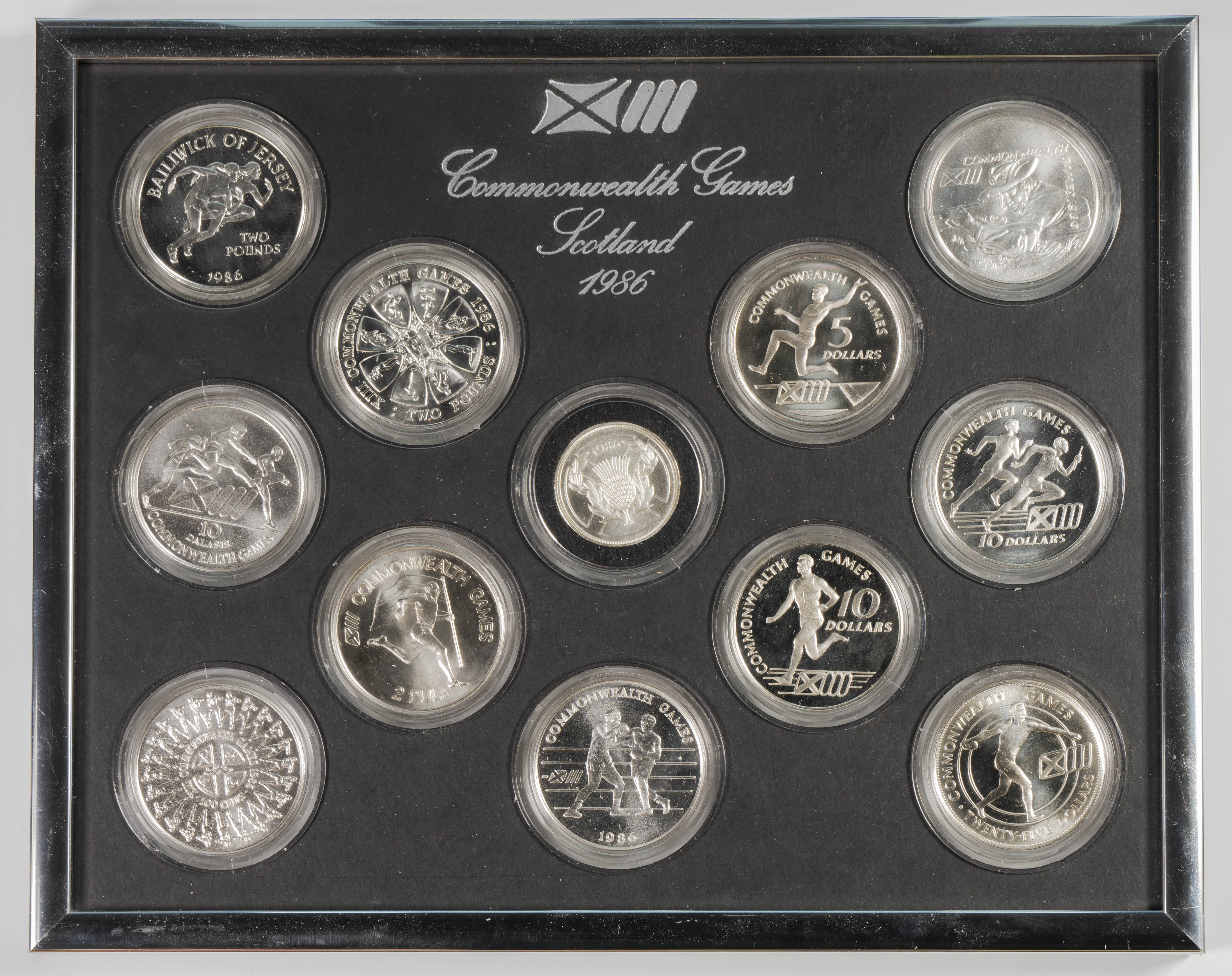 MONEDAS EXTRANJERAS. Set/cuadro formado por 12 monedas en plata de otros tantos países (Bahamas, Barbados, Gambia, Jersey, Reino Unido, Tonga…)conmemorativas de los Juegos de la Commonwealth. 1986. SC.