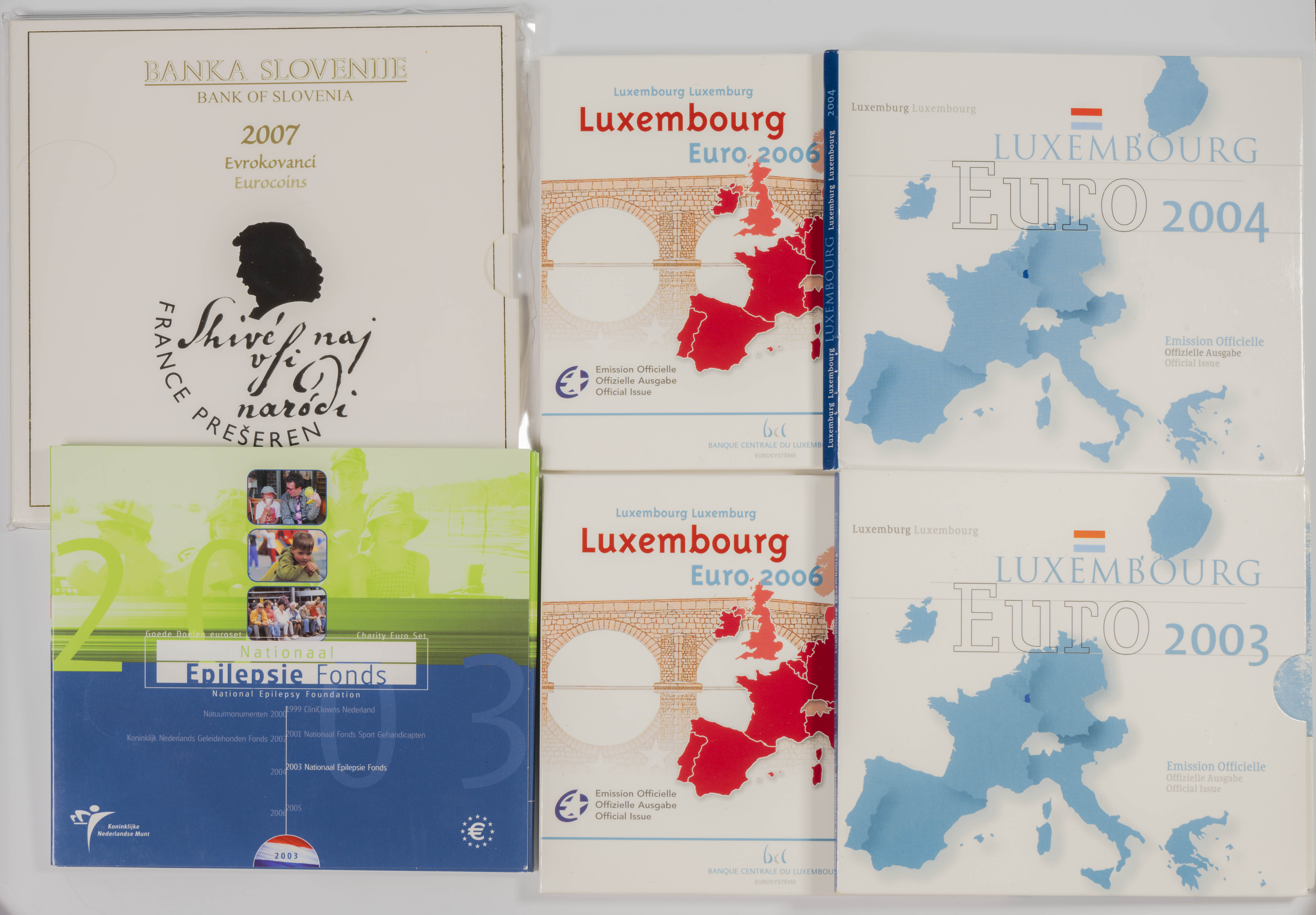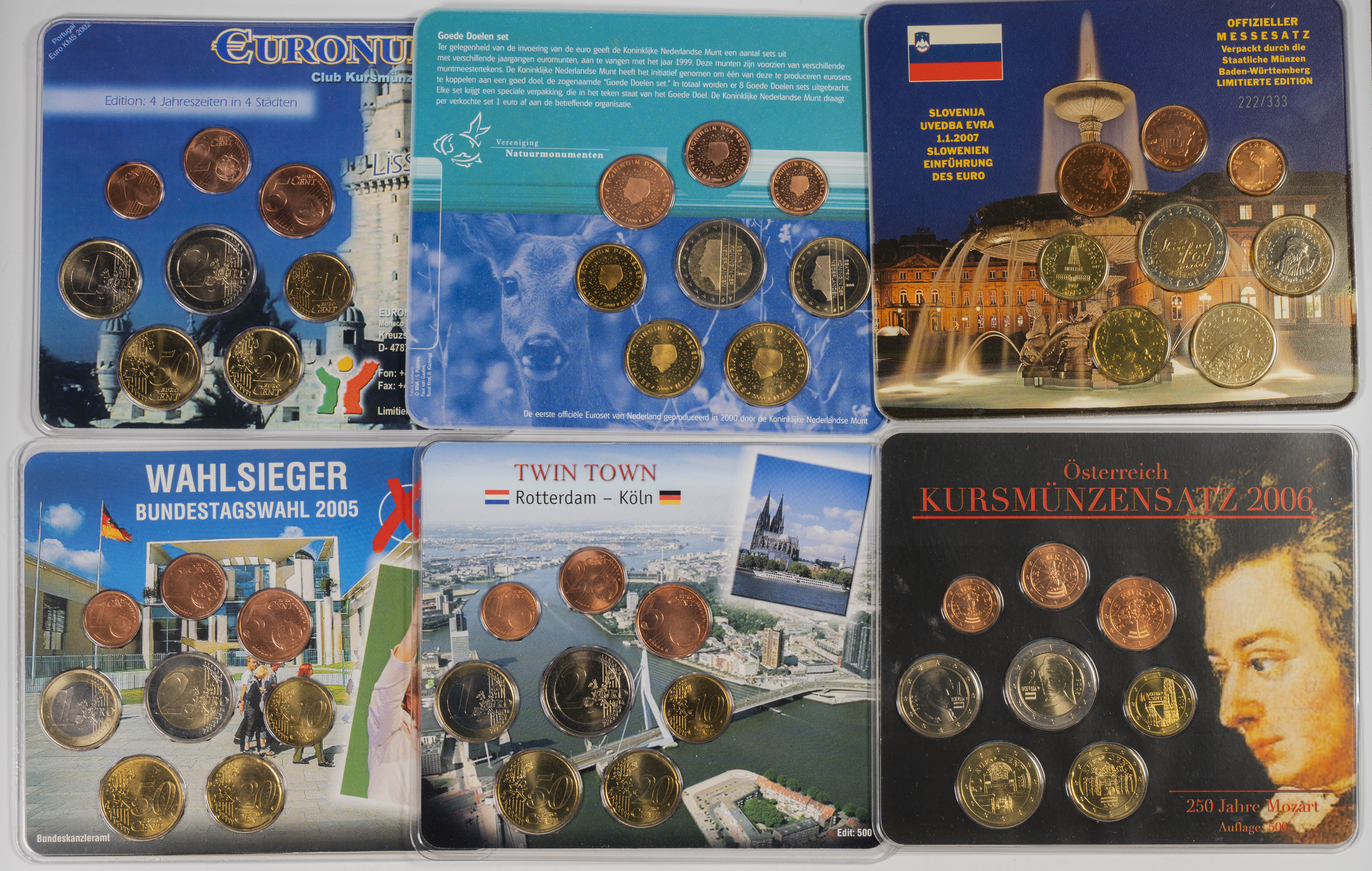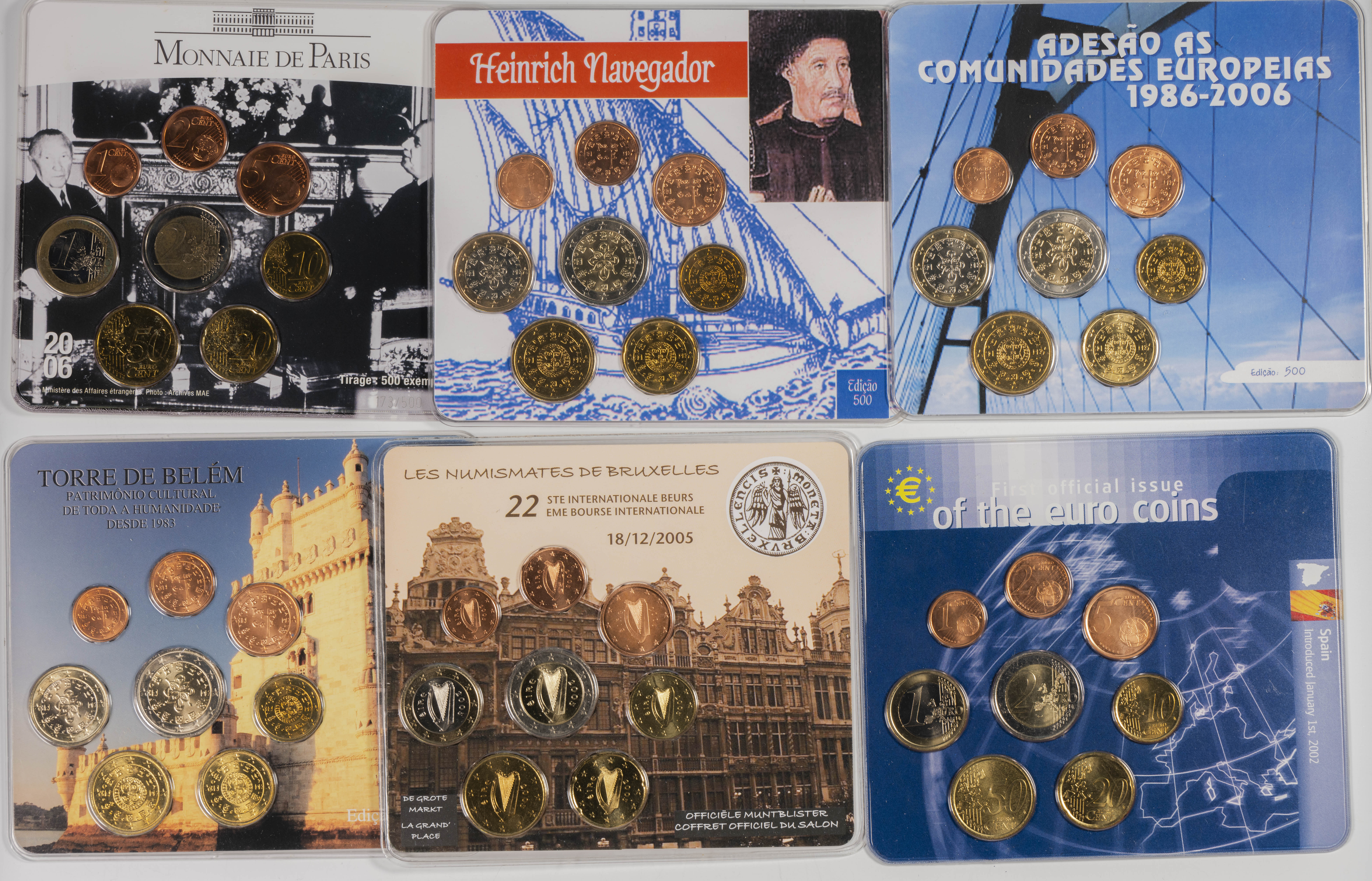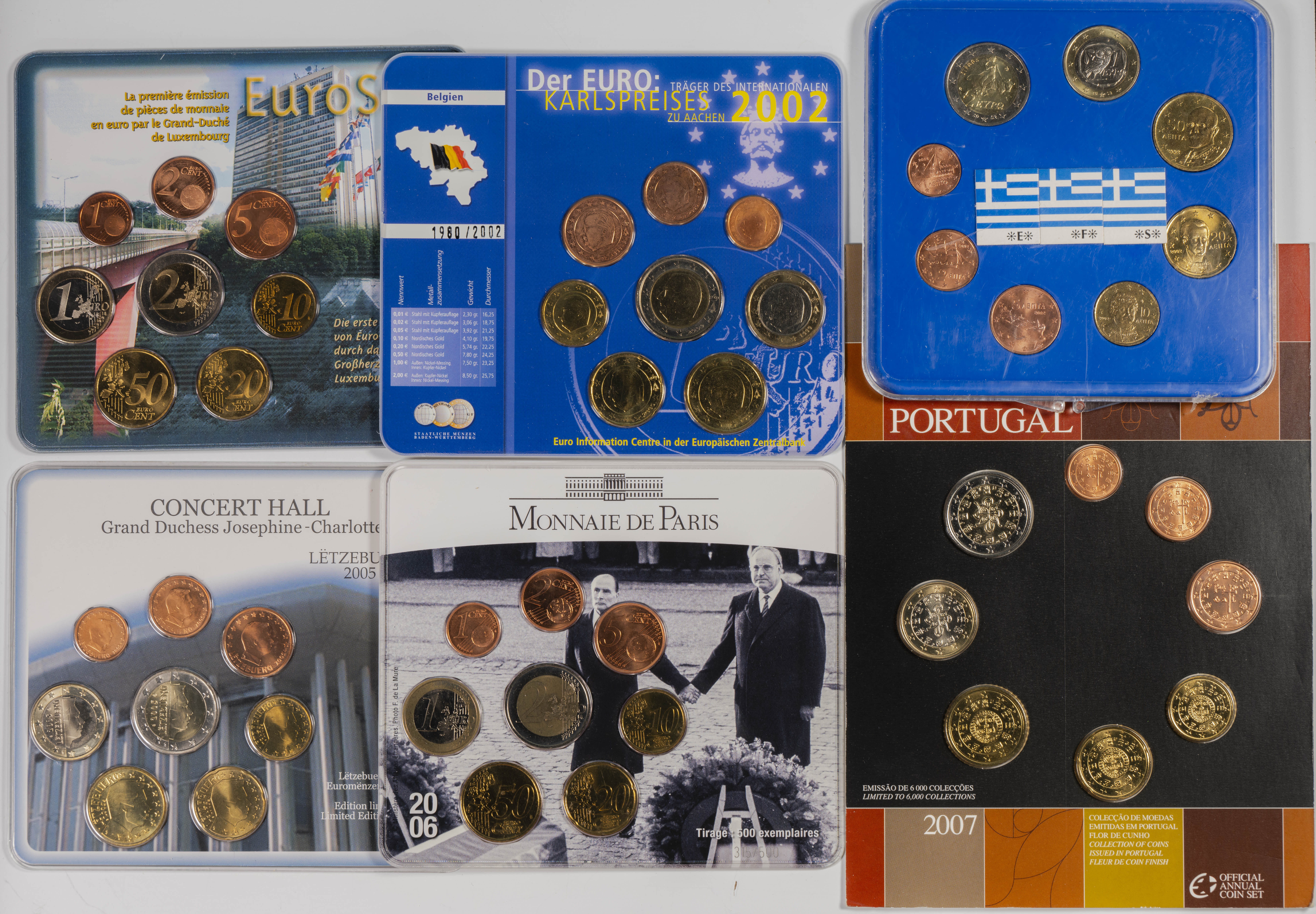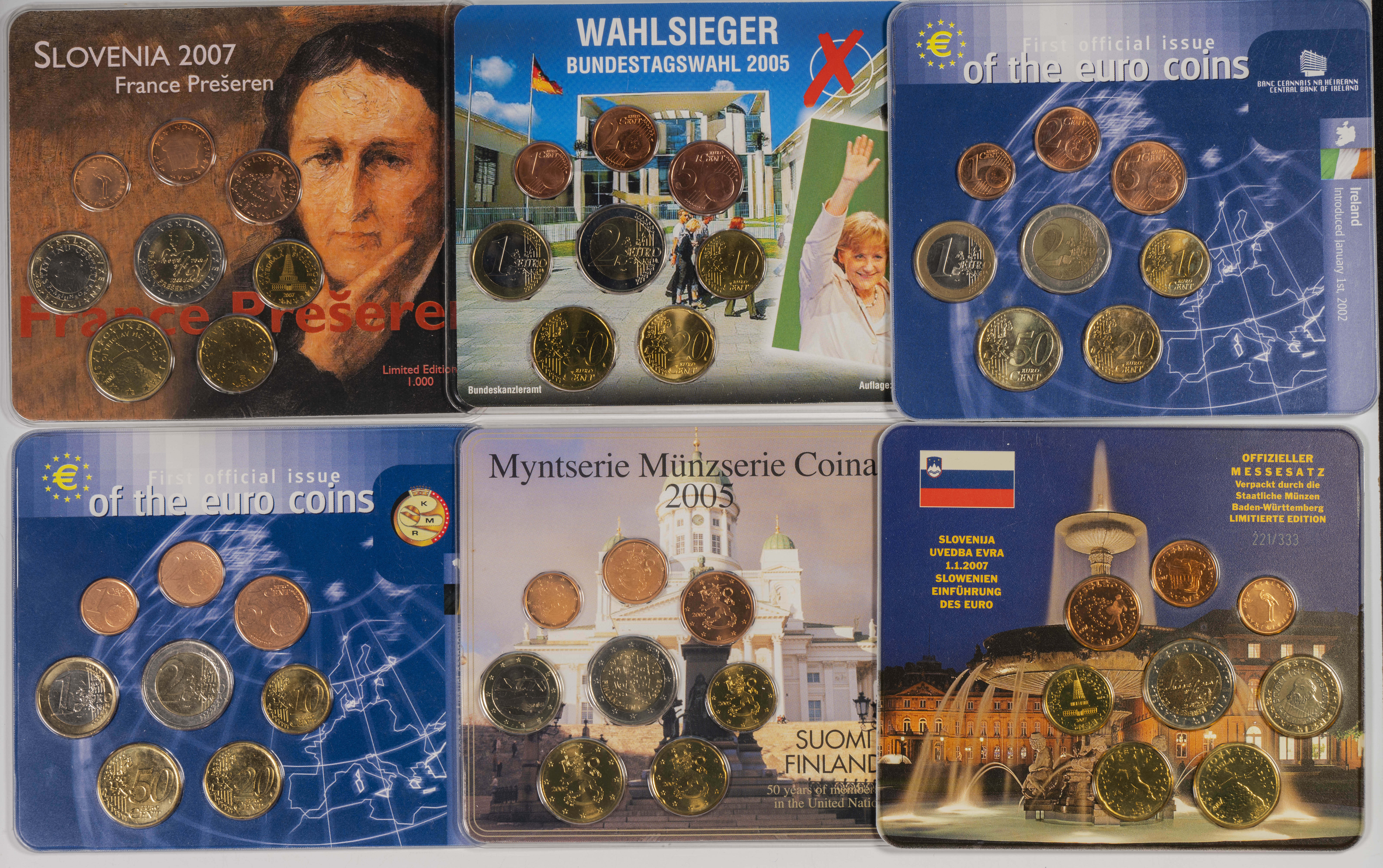 EUROS. Interesante y selecto conjunto de 47 sets conmemorativos y anuales de diferentes fechas y países entre los que encontramos: Finlandia, Grecia, Irlanda, Francia, Italia, Luxenburgo, Países Bajos, Alemania, Eslovenia, Bélgica, Irlanda, Portugal y España. A EXAMINAR.