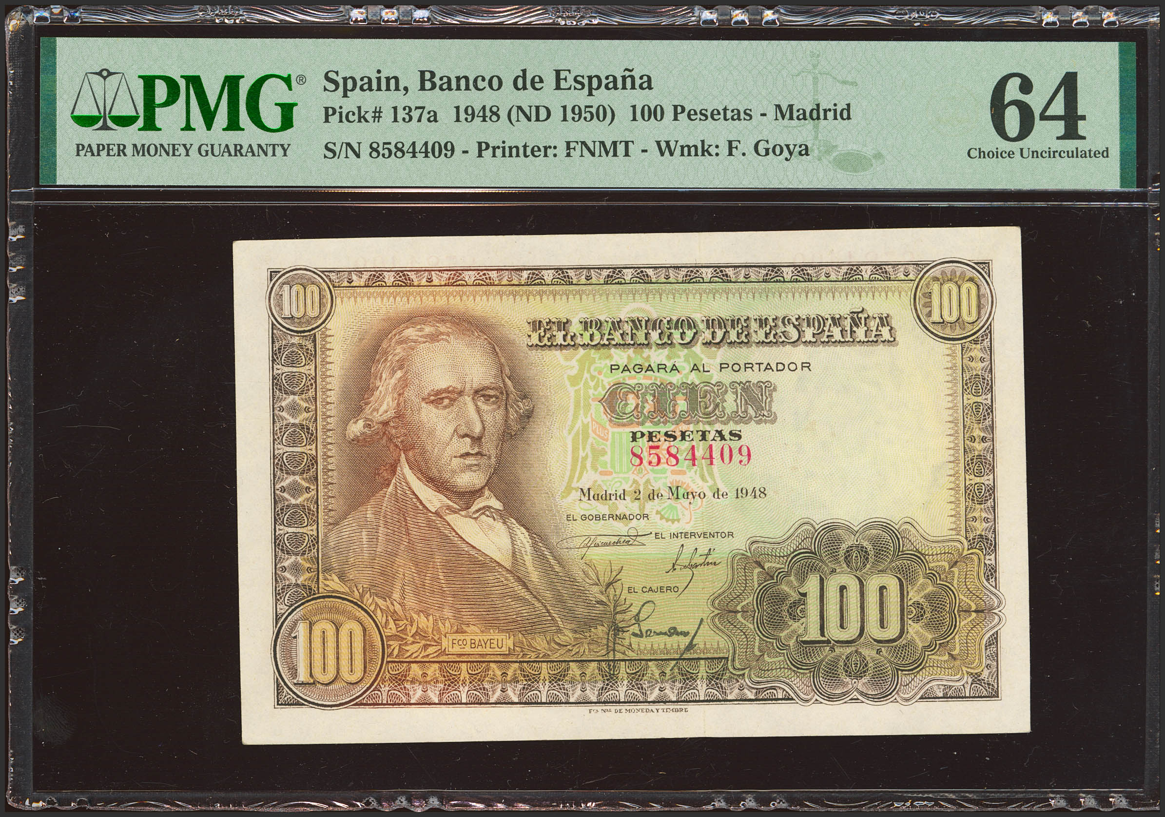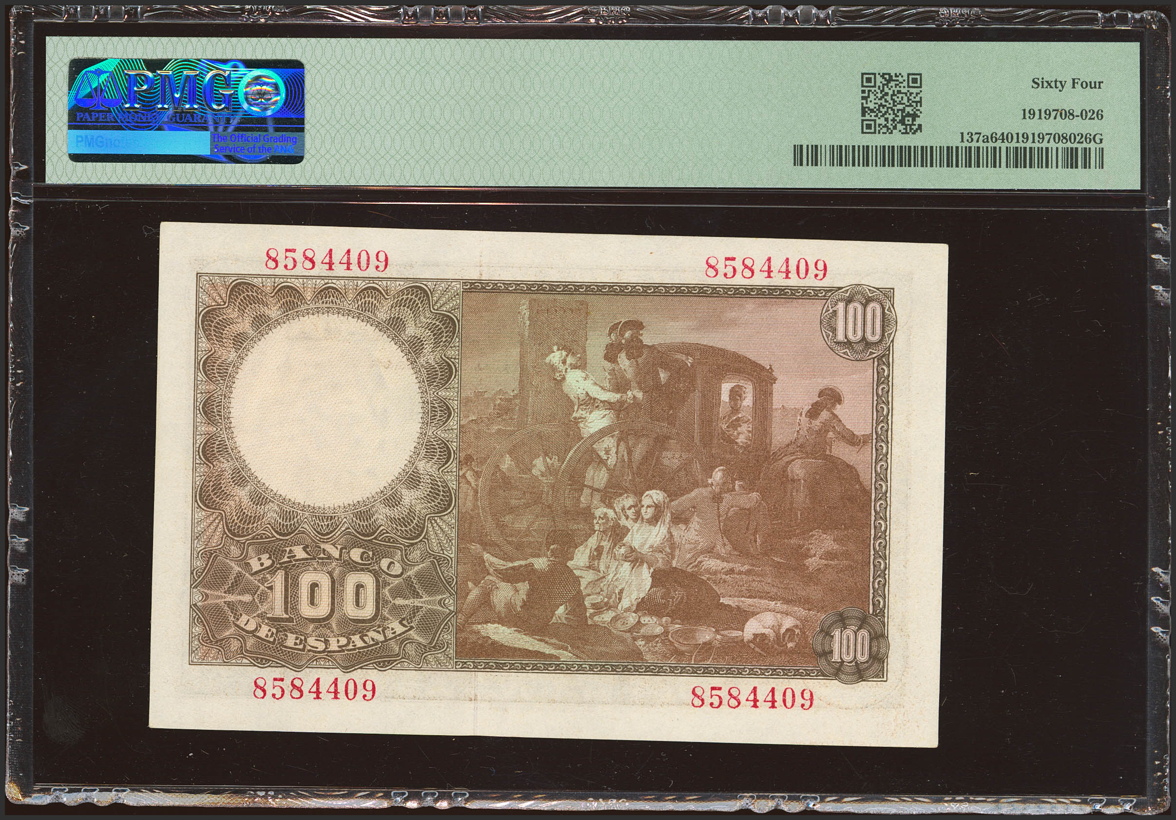 100 Pesetas. 2 de Mayo de 1948. Sin serie. (Edifil 2023: 456, Pick: 137a). Inusual en esta calidad. SC. Encapsulado PMG64.