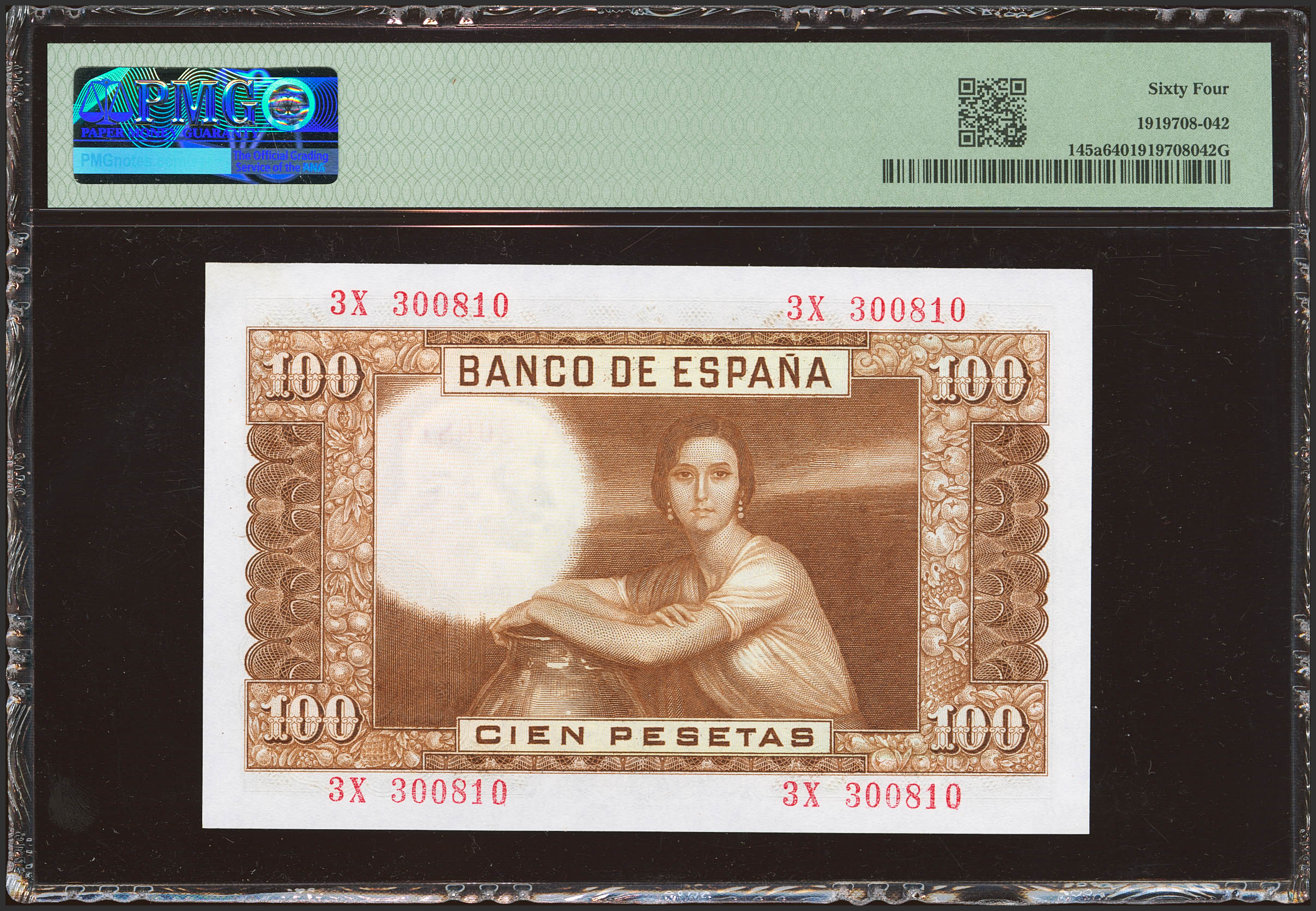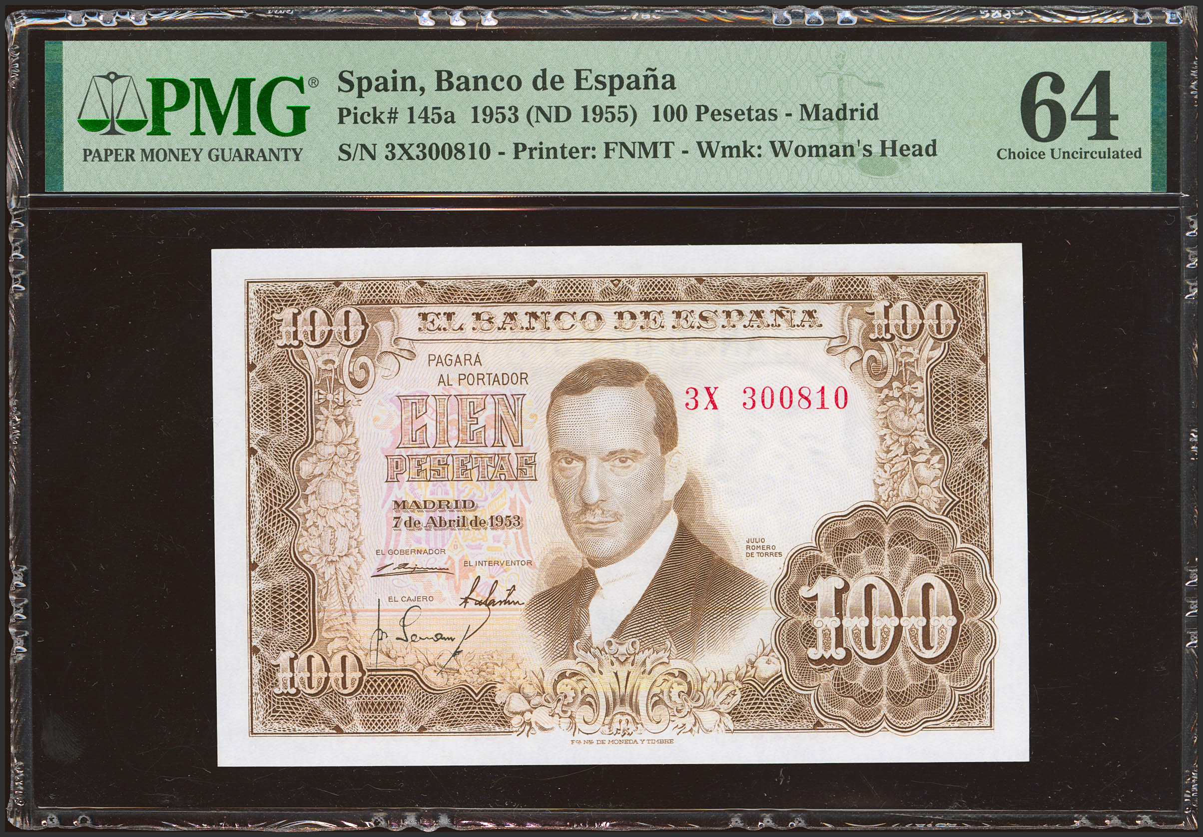 100 Pesetas. 7 de Abril de 1953. Serie 3X, última serie emitida. (Edifil 2023: 464e, Pick: 145a). Inusual. SC. Encapsulado PMG64.