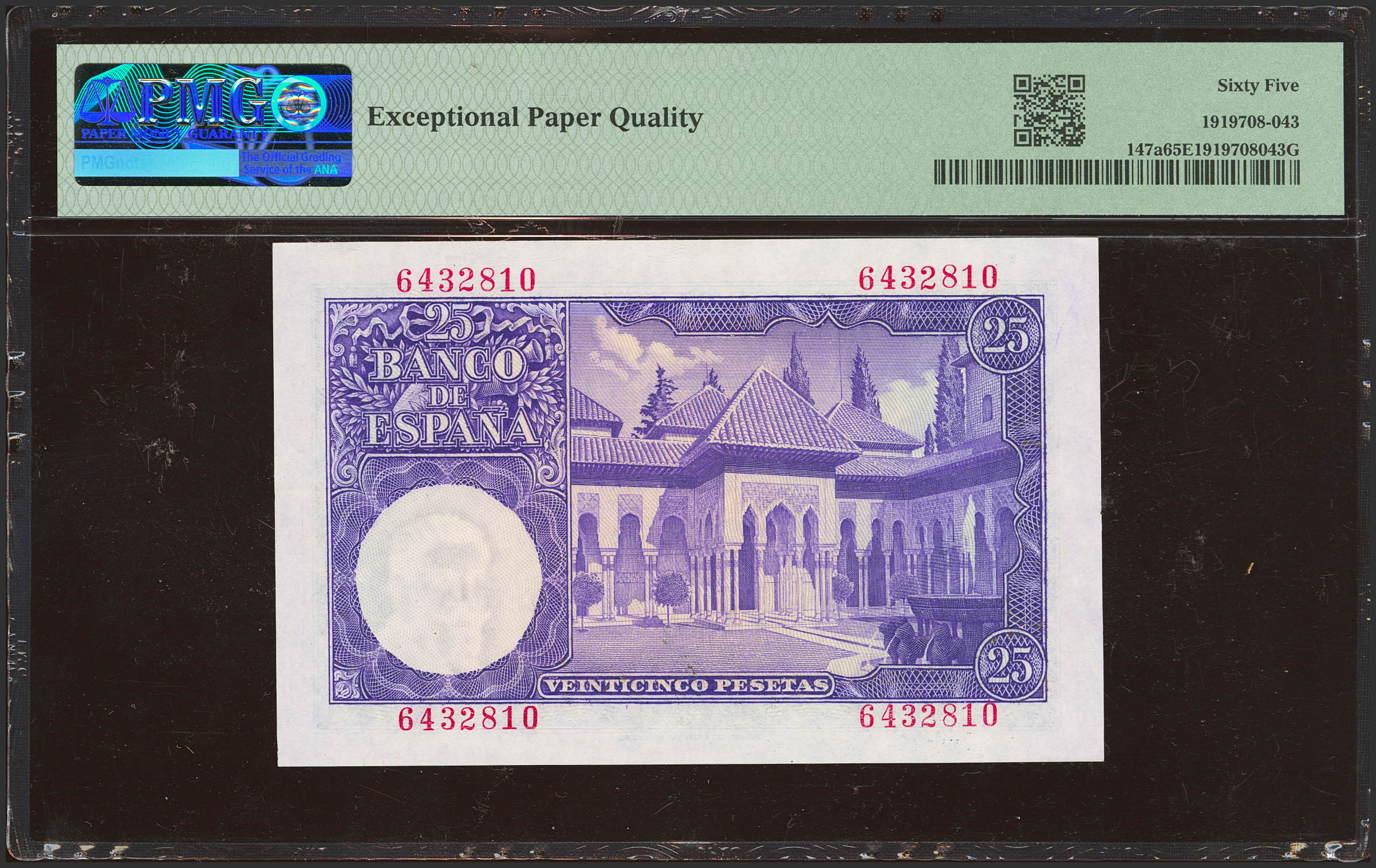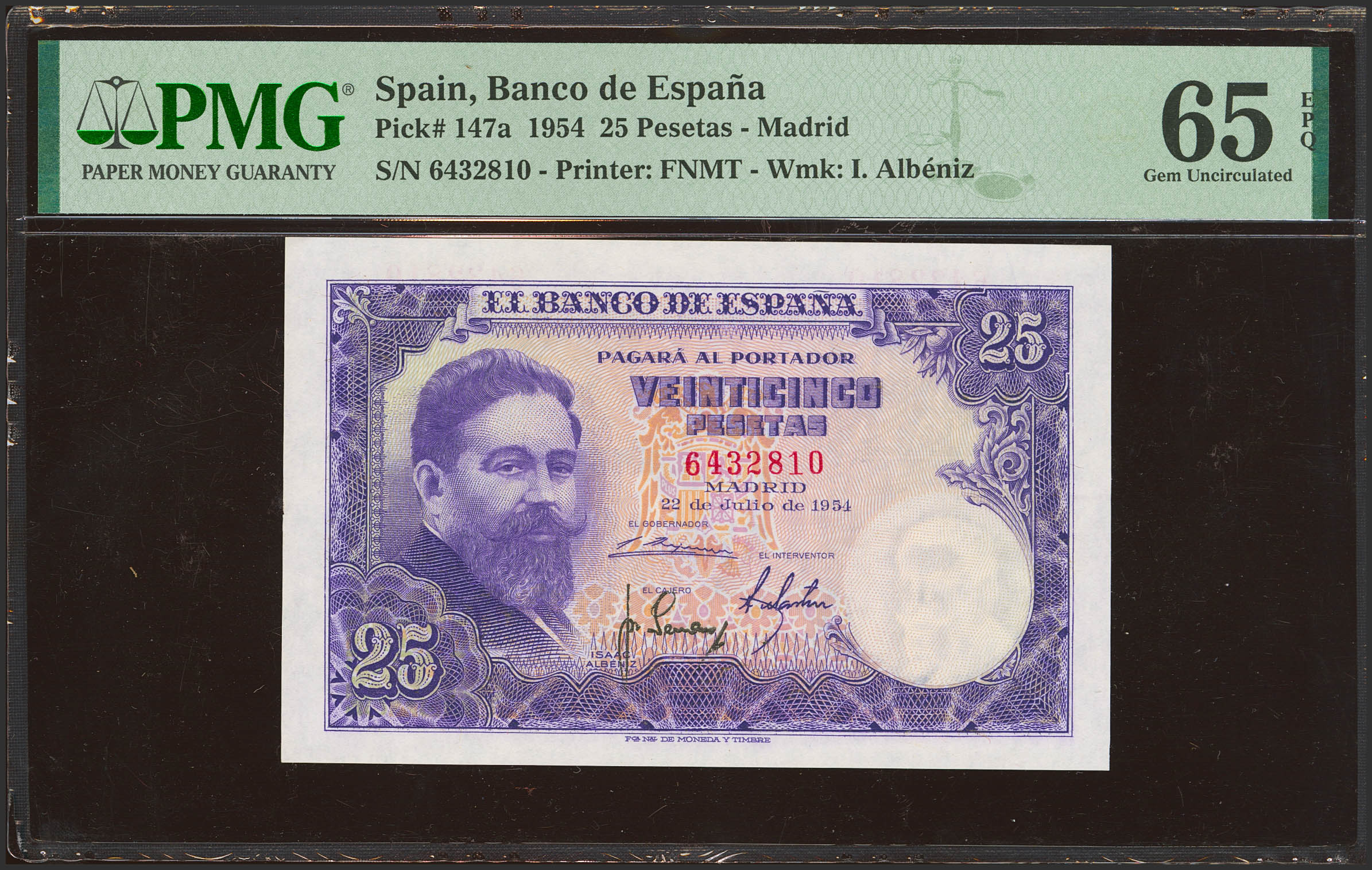 25 Pesetas. 22 de Julio de 1954. Sin serie. (Edifil 2023: 467, Pick: 147a). Raro en esta excepcional calidad, apresto original. SC. Encapsulado PMG65EPQ.