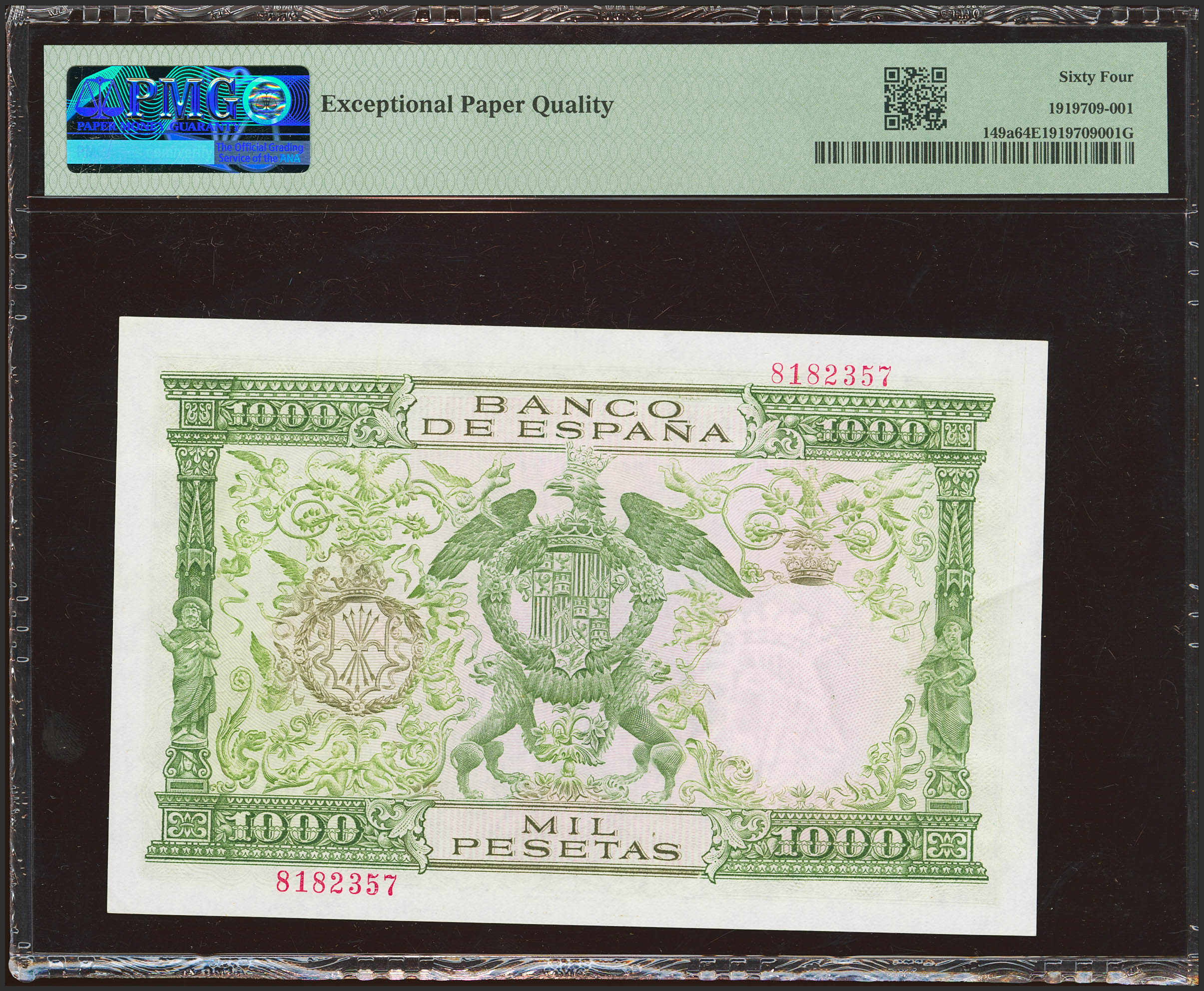 1000 Pesetas. 29 de Noviembre de 1957. Sin serie. (Edifil 2023: 469, Pick: 149a). Rarísimo en esta excepcional calidad, apresto original. SC. Encapsulado PMG64EPQ.