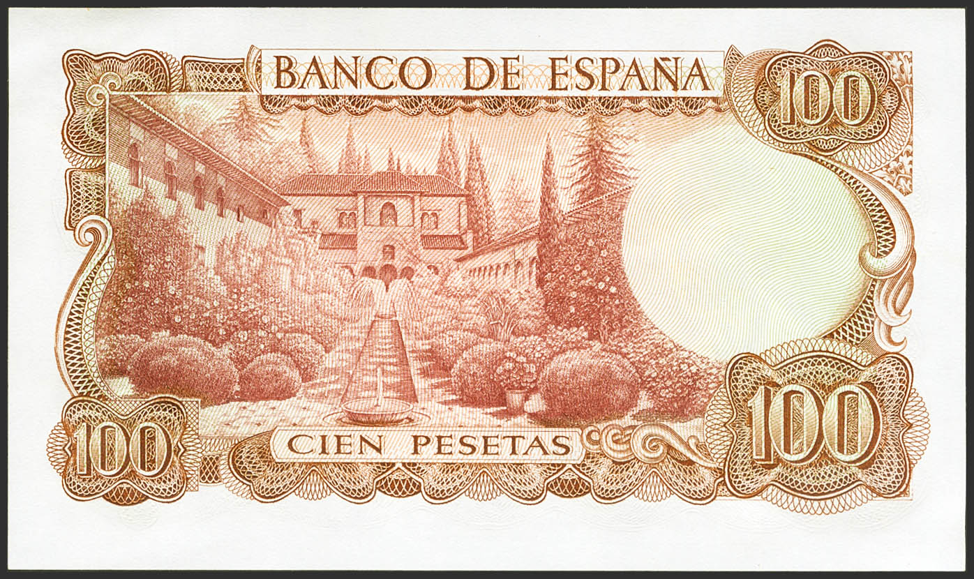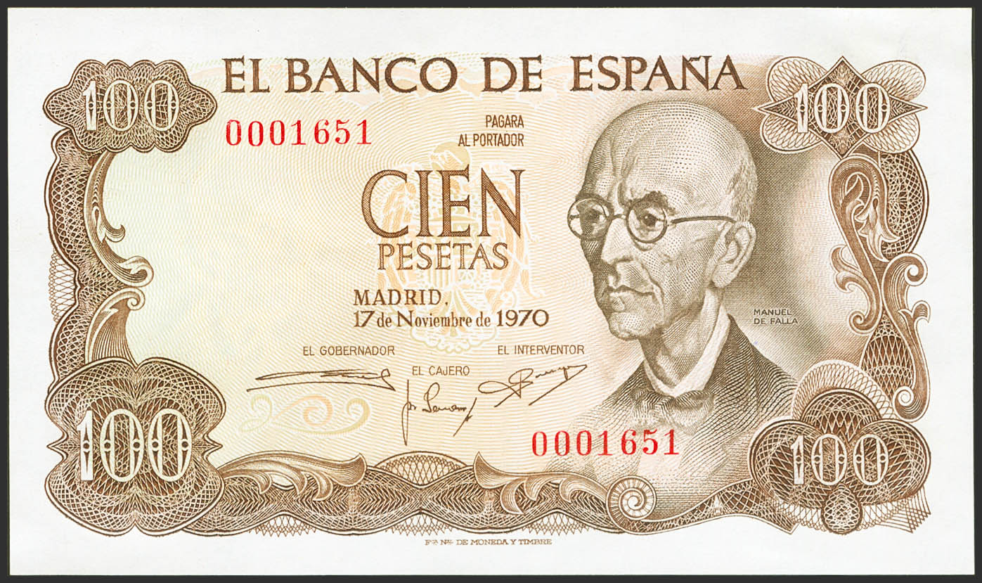 100 Pesetas. 17 de Noviembre de 1970. Sin serie y numeración bajísima. (Edifil 2023: 472, Pick: 152a). Raro en esta excepcional calidad, apresto original. SC.
