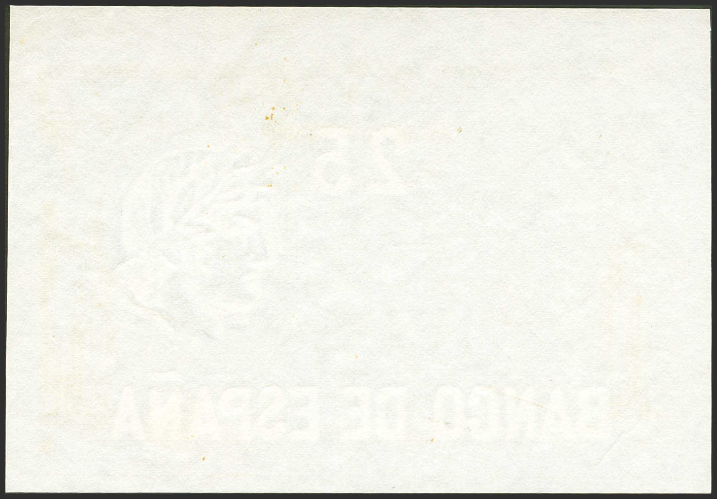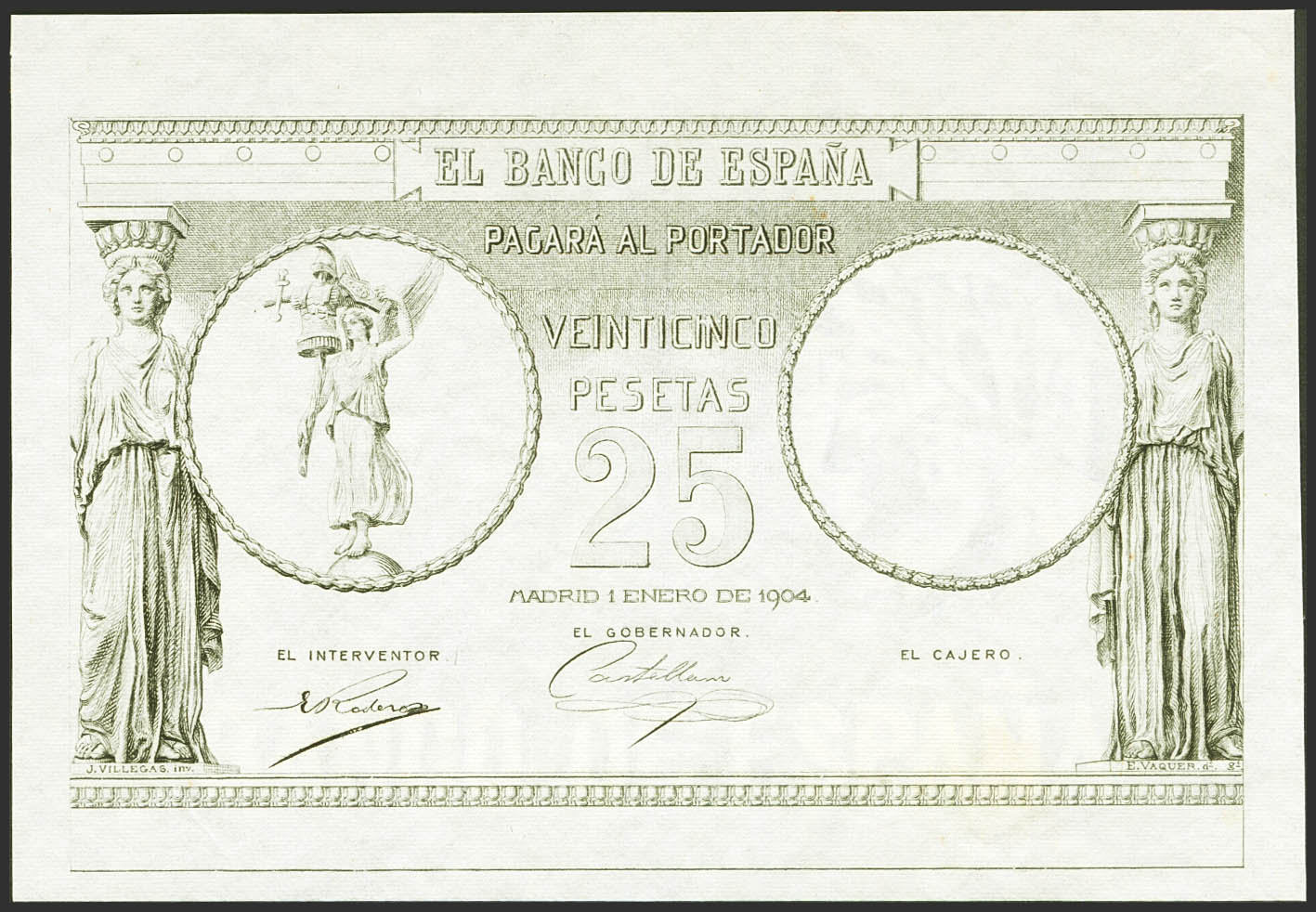 25 Pesetas. 1 de Enero de 1904. Prueba del anverso, sin numeración y sin firma del cajero. (Edifil 2023: NE11P). Muy rara. SC-.