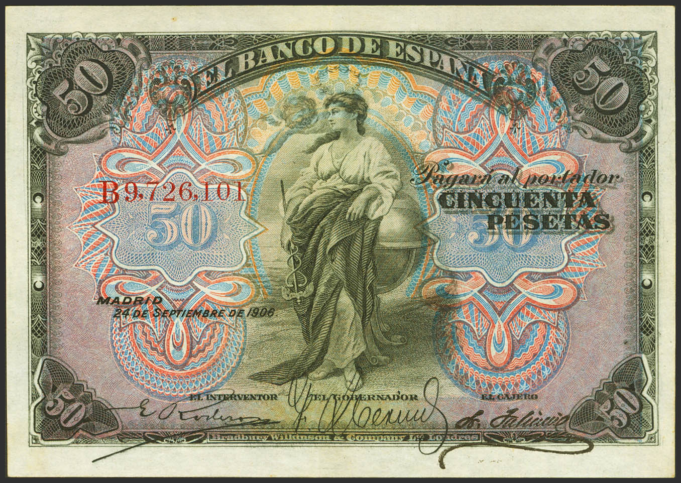 50 Pesetas. 24 de Septiembre de 1906. Serie B. (Edifil 2023: 315a, Pick: 58a). Conserva parte de su apresto original. EBC.