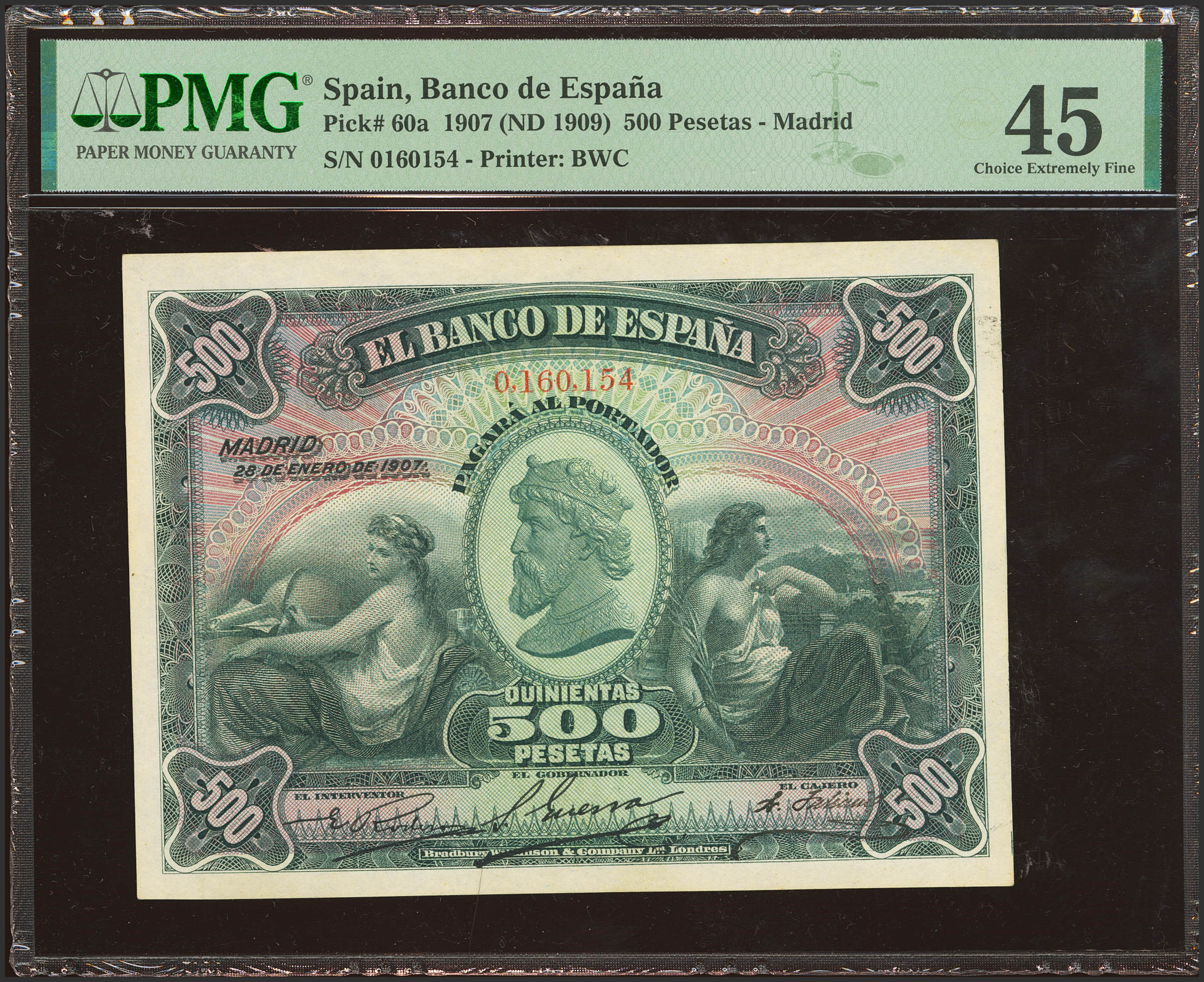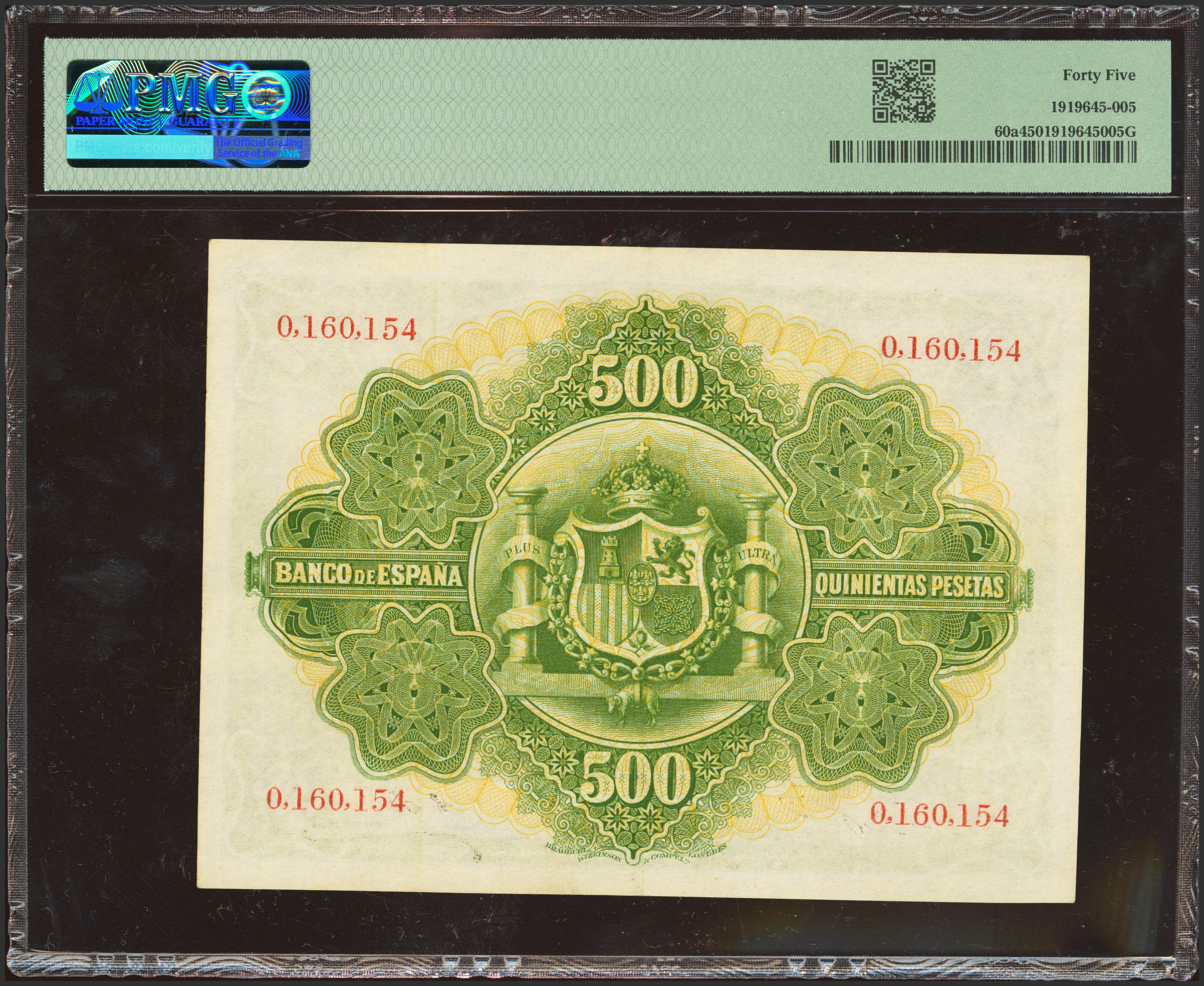 500 Pesetas. 28 de Enero de 1907. Sin serie. (Edifil 2023: 316, Pick: 60a). Rarísimo, especialmente en esta calidad y sin ninguna reparación. EBC-. Encapsulado PMG45.