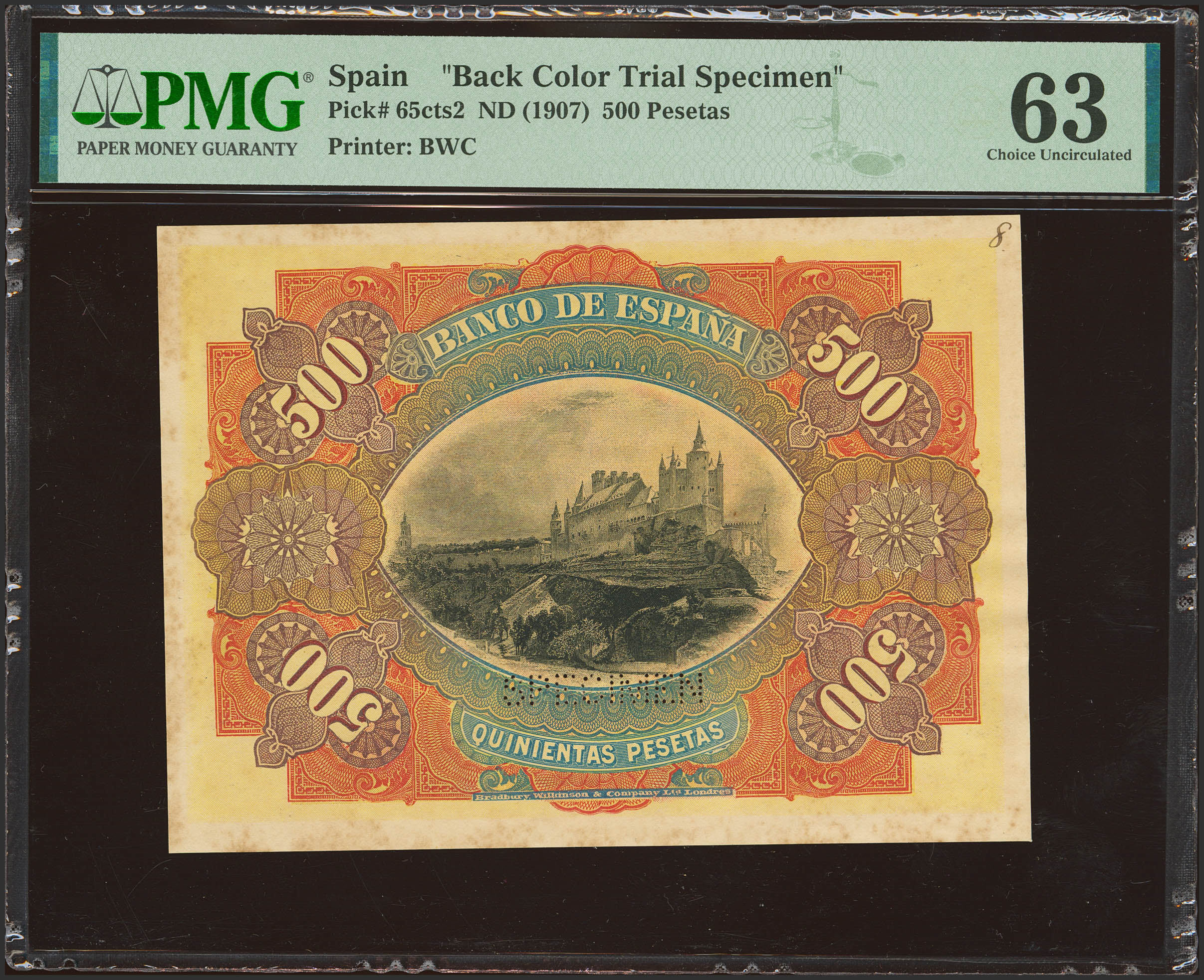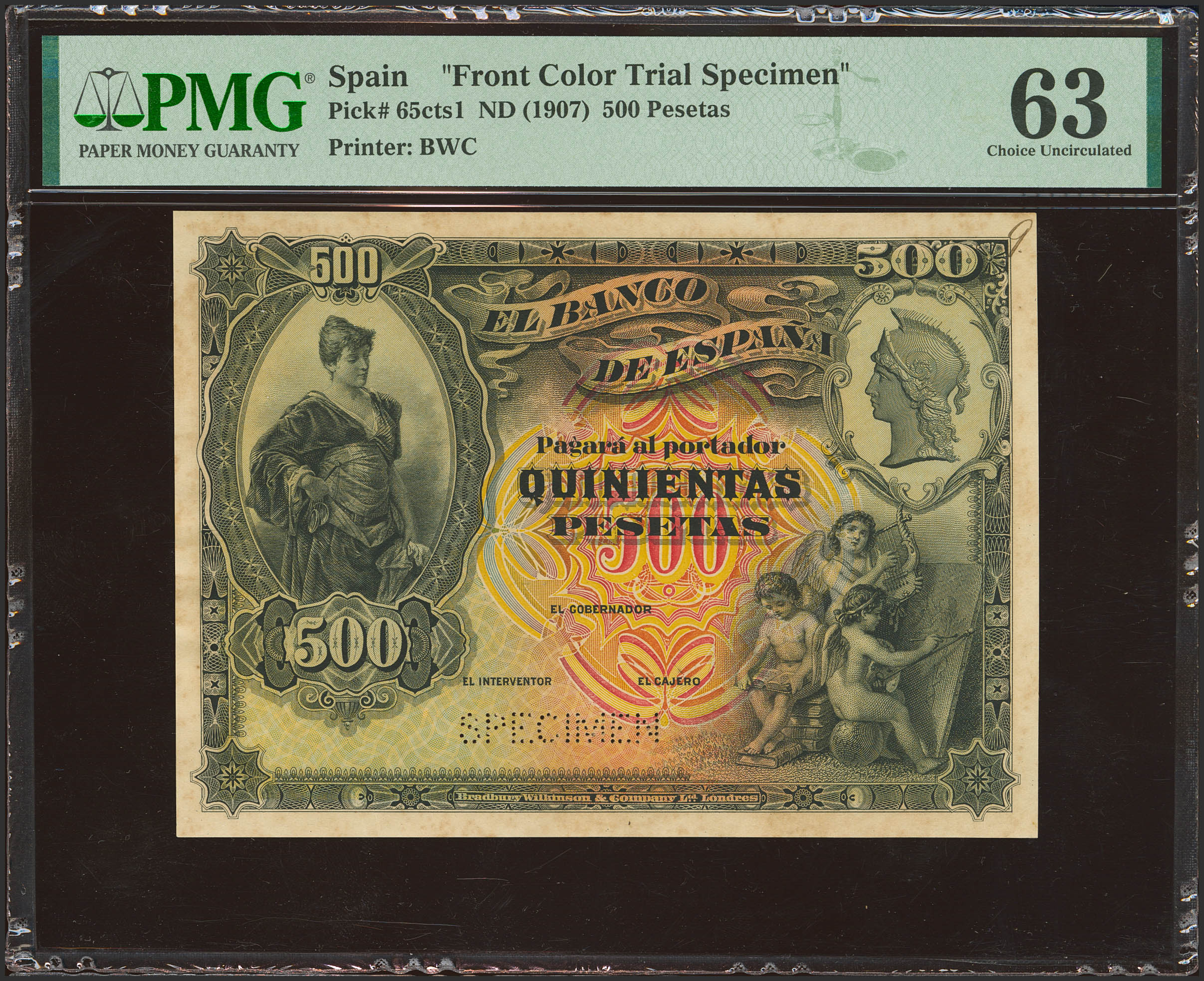 500 Pesetas. 15 de Julio de 1907. Prueba de color de anverso y reverso, sin numeración y taladrado SPECIMEN. (Edifil 2023: 321Pa, Pick: 65cts1, 65cts2). Rarísimo y espectacular. SC. Encapsulado PMG63 (printer's annotation, previously mounted), ambos.