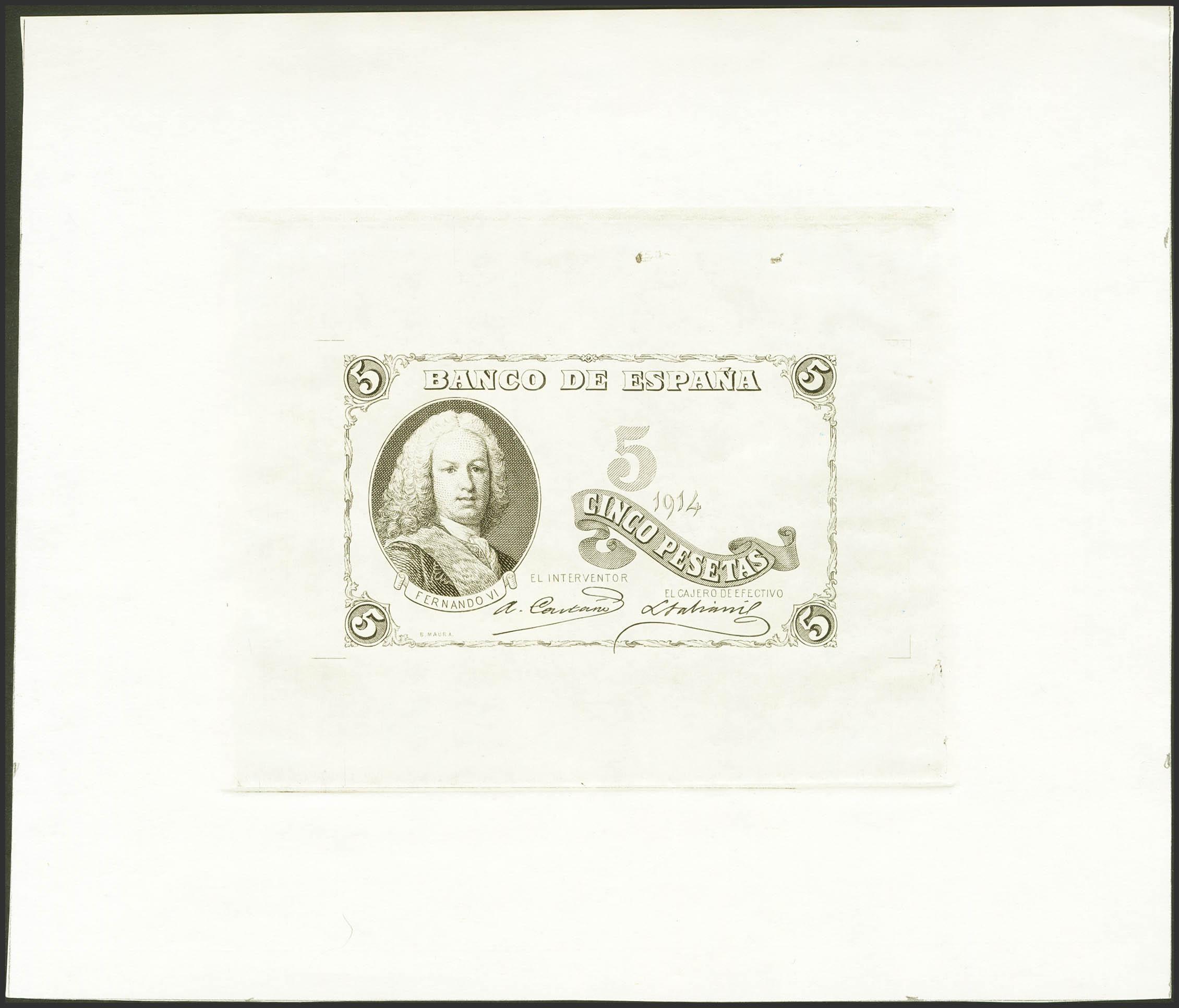 5 Pesetas. 1914. Prueba de Anverso en cartulina. (Edifil 2023: NE16Pa). Raro. SC.