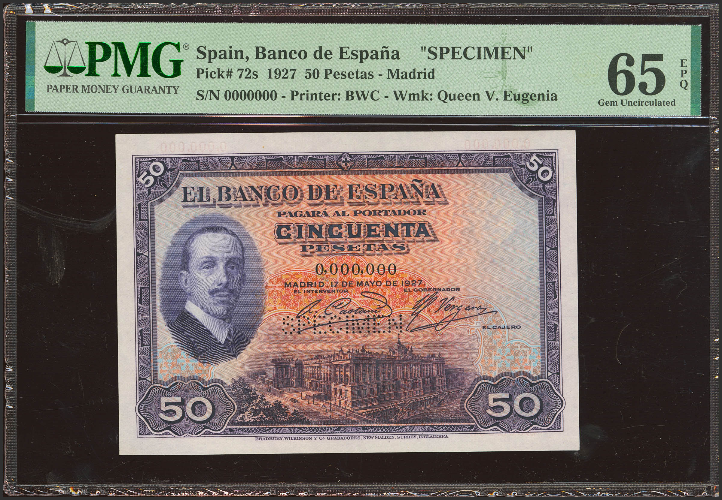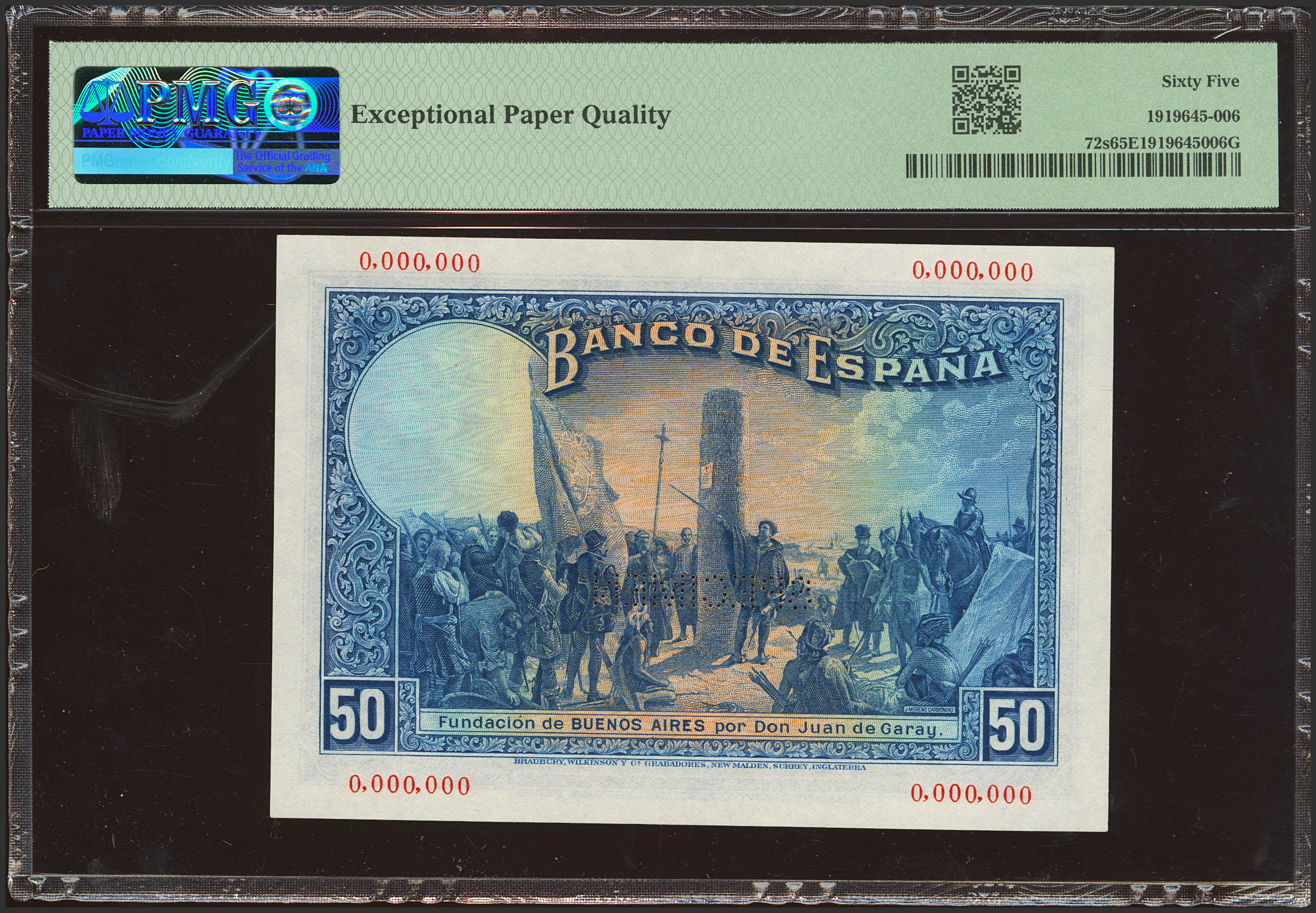 50 Pesetas. 17 de Mayo de 1927. SPECIMEN y numeración 0,000,000. (Edifil 202: 326M, Pick: 72s). Rarísimo, conserva todo su apresto original. SC. Encapsulado PMG65EPQ.