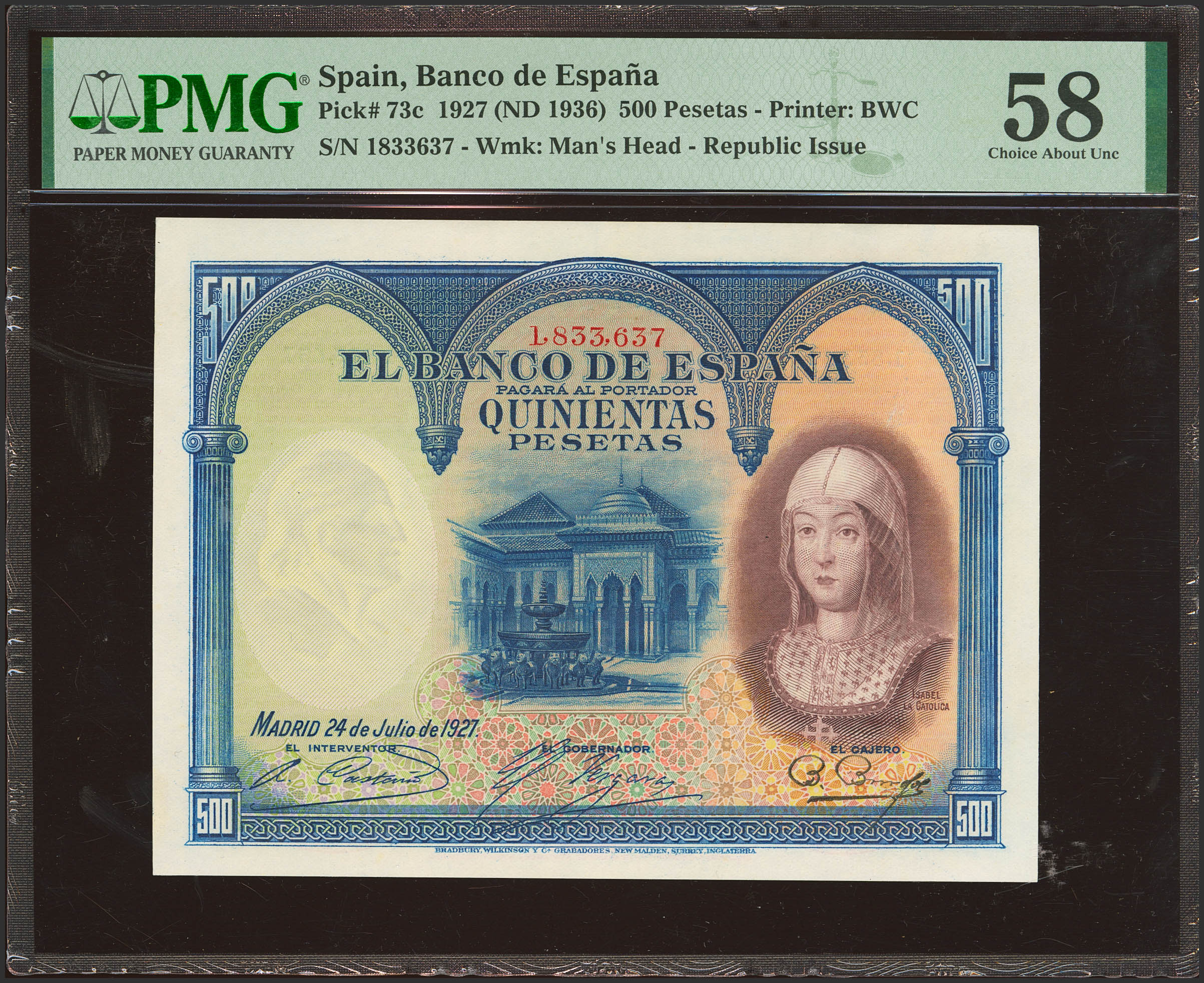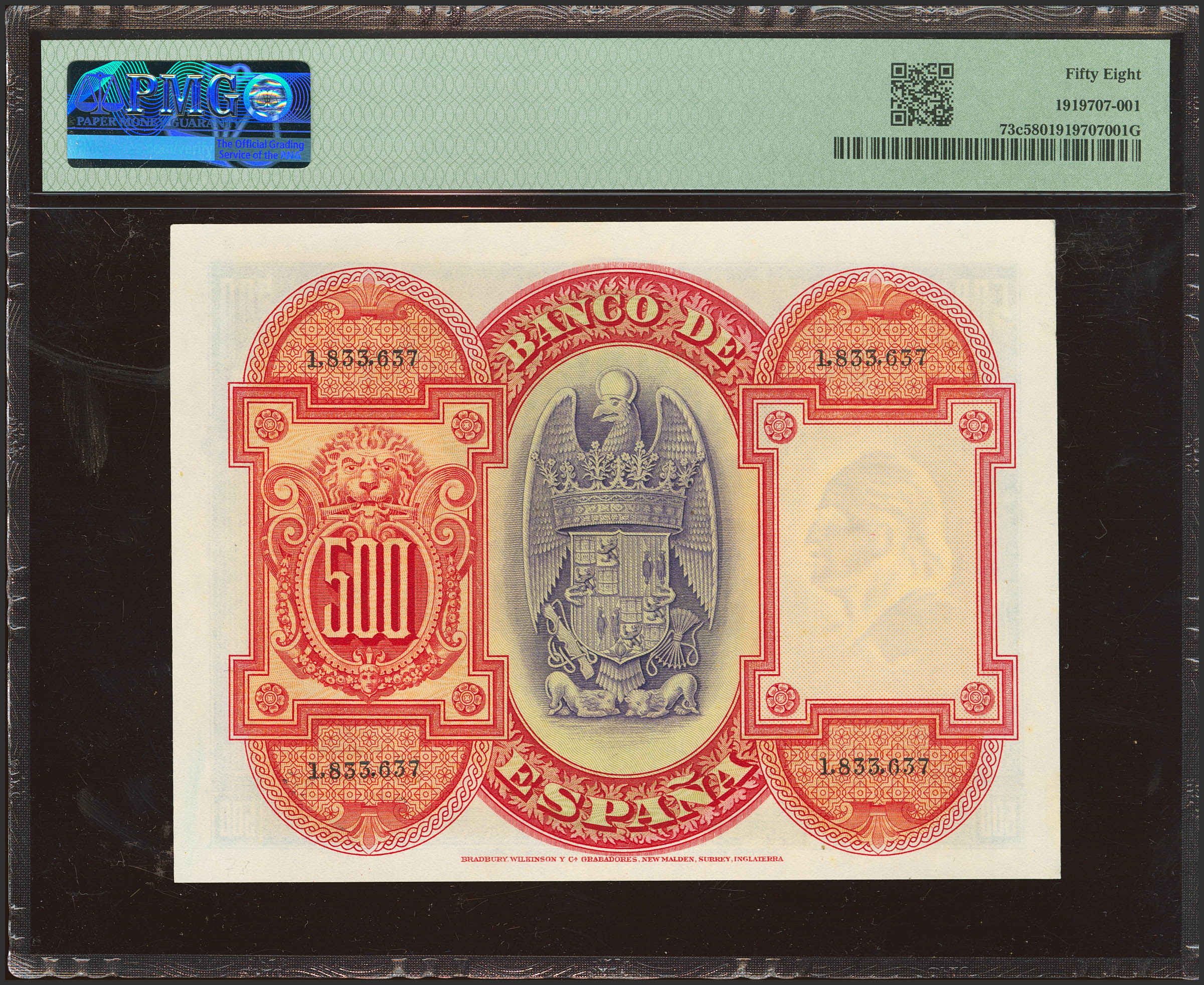 500 Pesetas. 24 de Julio de 1927. Sin serie y numeración posterior 1602000. (Edifil 2023: 352, Pick: 73c). Inusual en esta calidad. EBC++. Encapsulado PMG58.