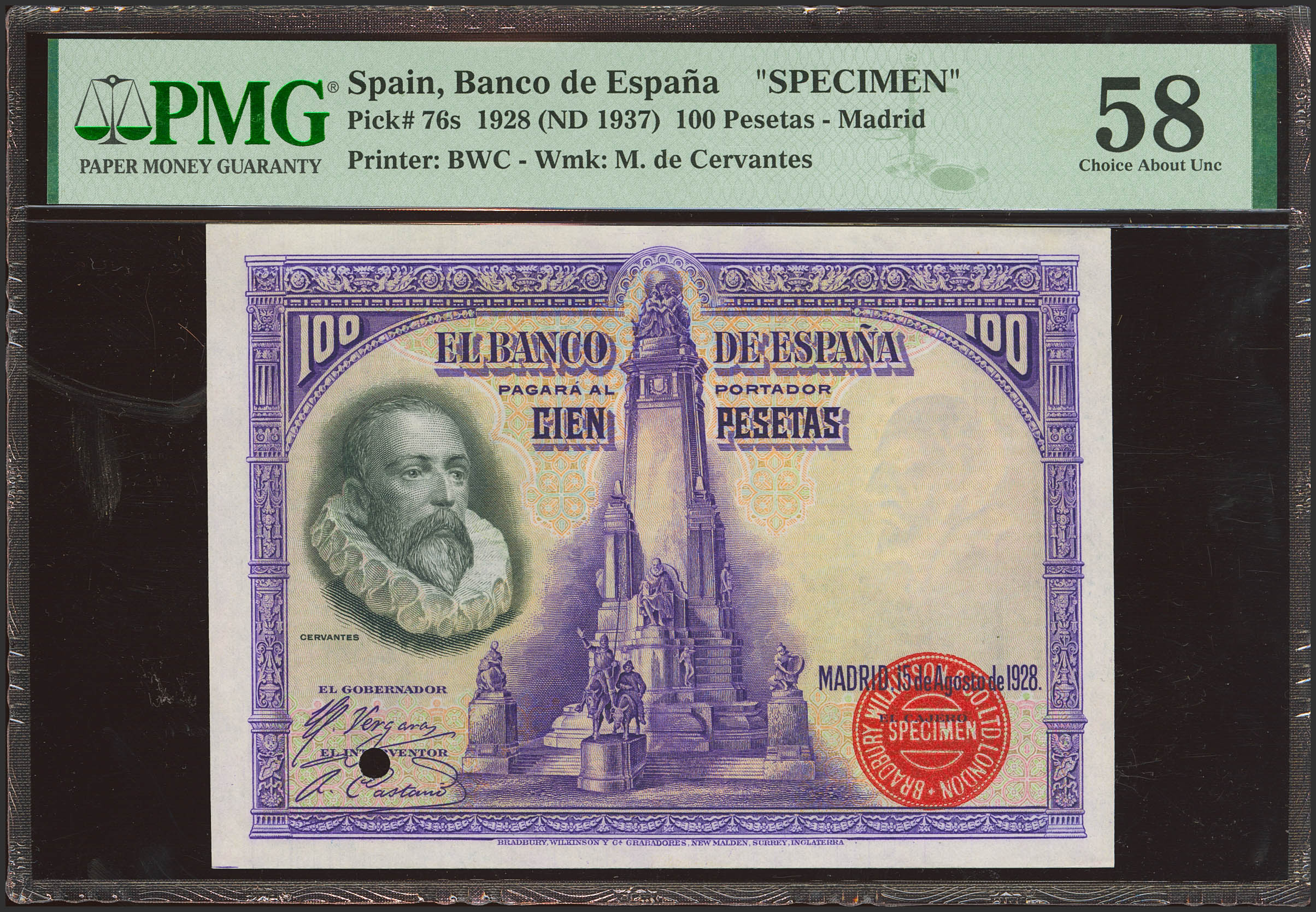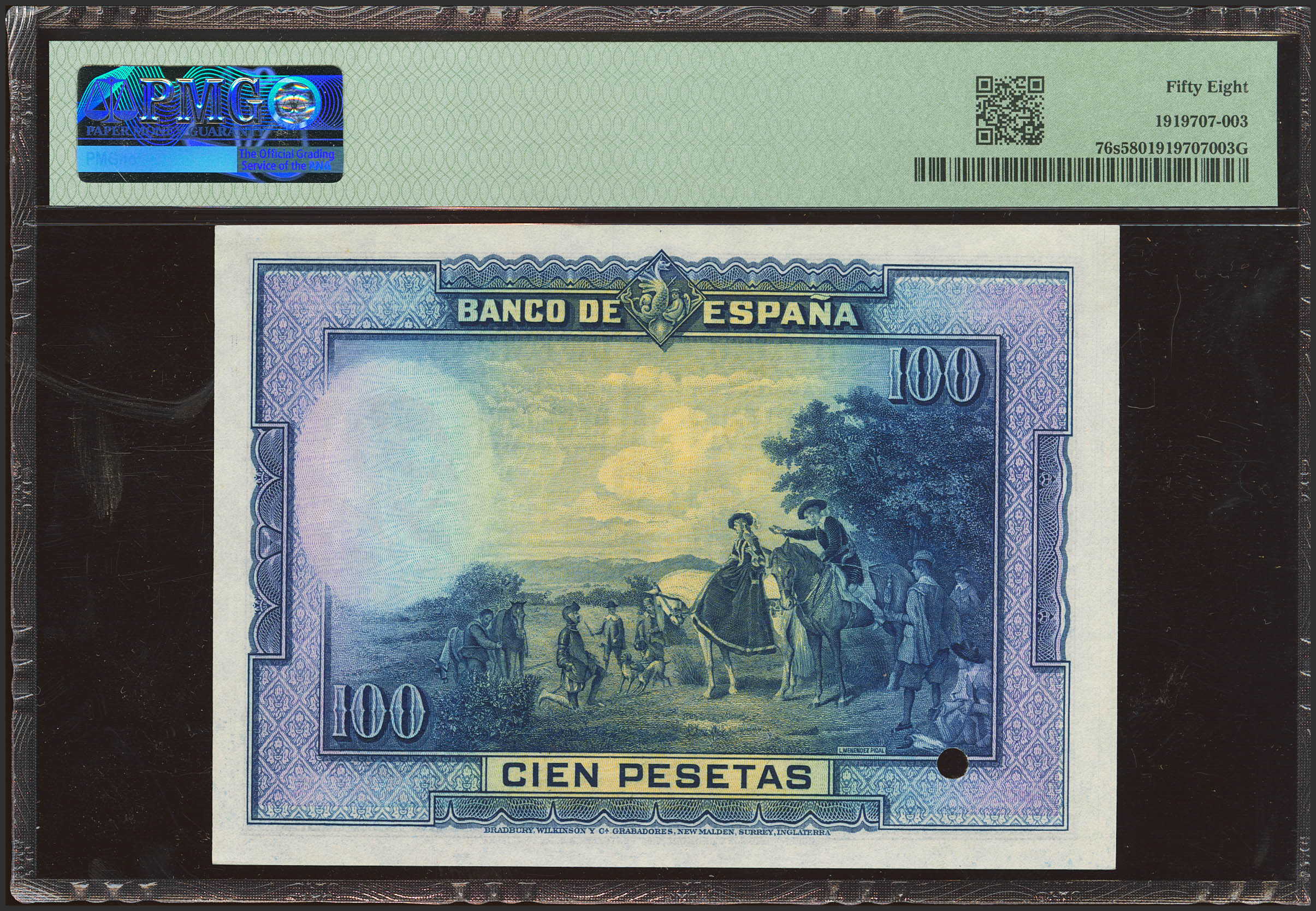 100 Pesetas. 15 de Agosto de 1928. Sin numeración, sello en rojo de Bradbury y sin firma del cajero. (Edifil 2023: 355Mb, Pick: 76s). Rarísimo. EBC++. Encapsulado PMG58.