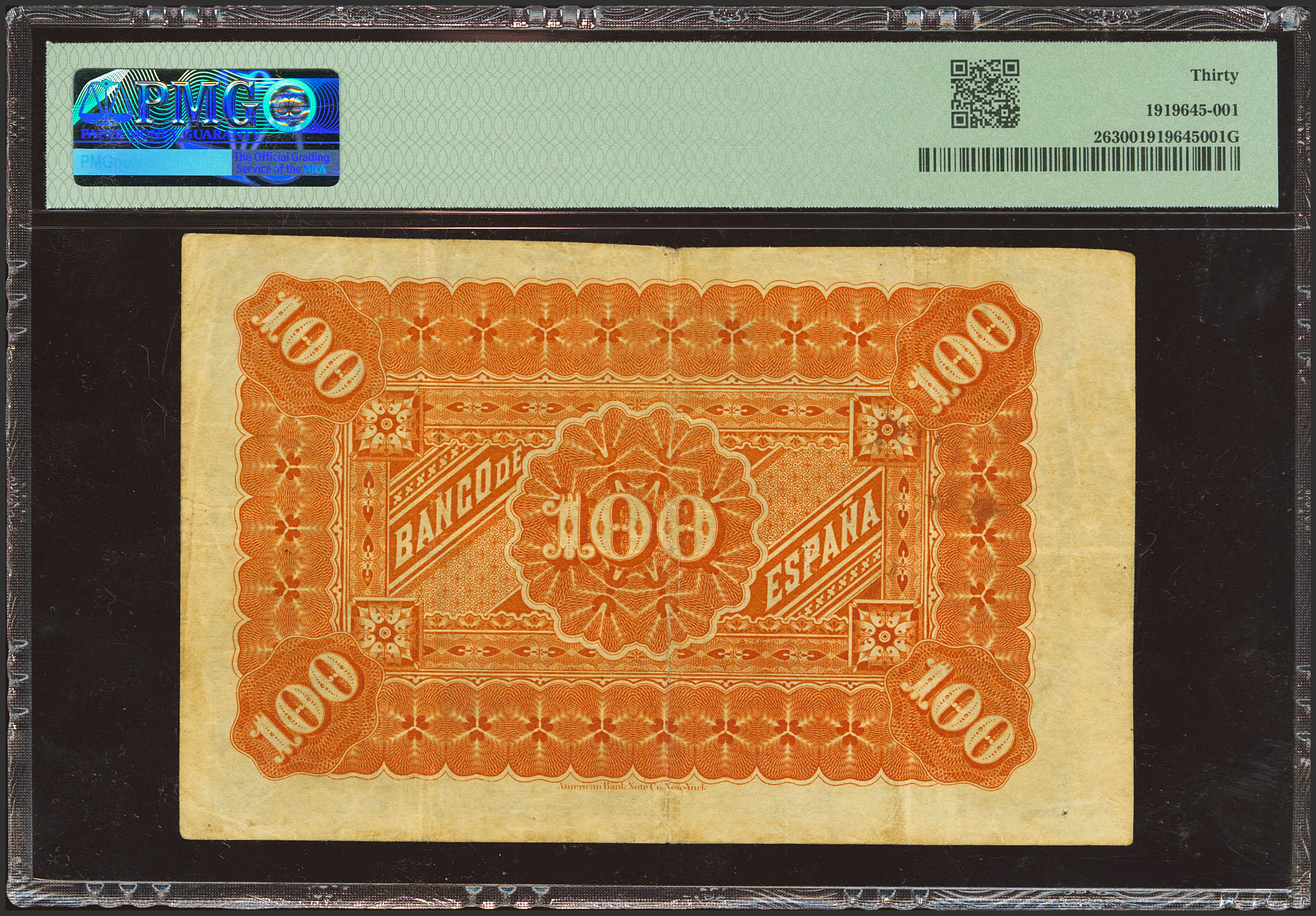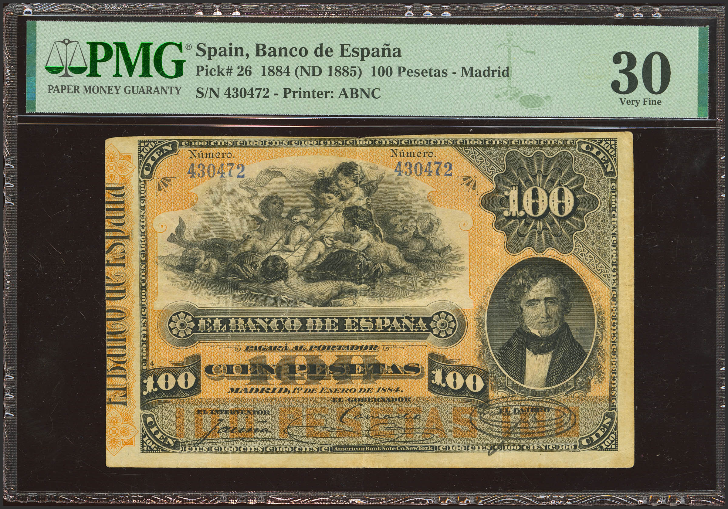 100 Pesetas. 1 de Enero de 1884. Sin serie. (Edifil 2023: 284, Pick: 26). Muy raro, especialmente sin reparaciones y en esta calidad. MBC+. Encapsulado PMG30.