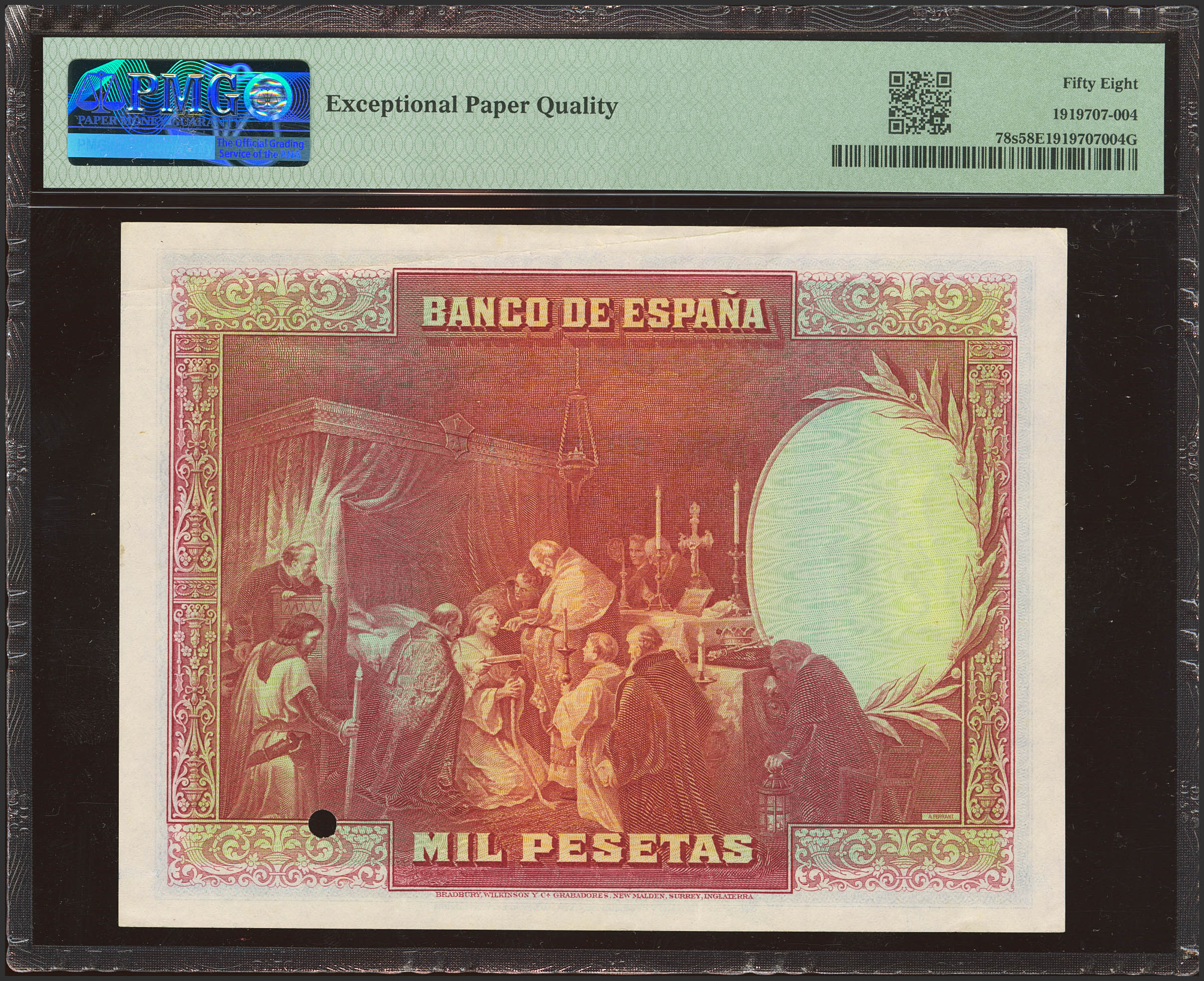 1000 Pesetas. 15 de Agosto de 1928. Sin numeración, sello en rojo de Bradbury y sin firma del cajero. (Edifil 2023: 357Mb, Pick: 78s). Rarísimo, apresto original. EBC++. Encapsulado PMG58EPQ.