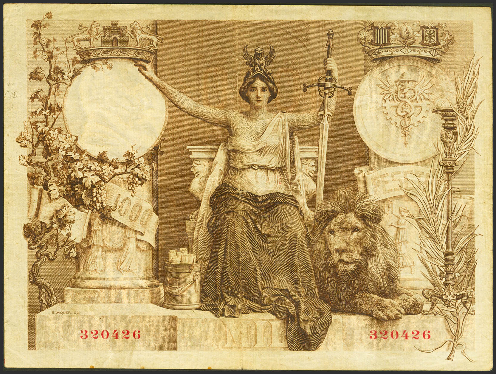 1000 Pesetas. 10 de Mayo de 1907. Sin serie y con el sello GOBIERNO PROVISIONAL DE LA REPUBLICA / 14 ABRIL 1931. (Edifil 2023: 347, Pick 61). Raro, sin ninguna reparación. MBC.