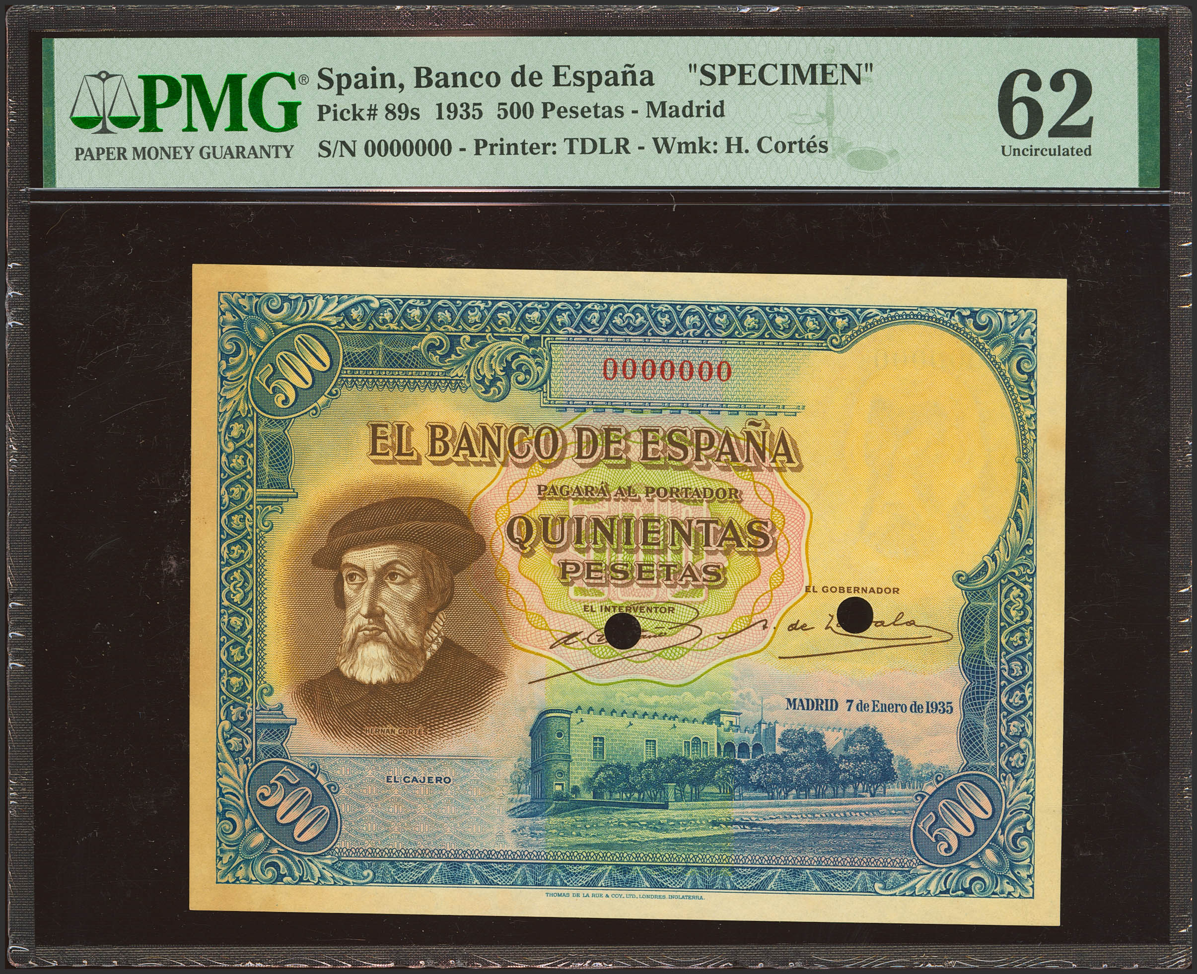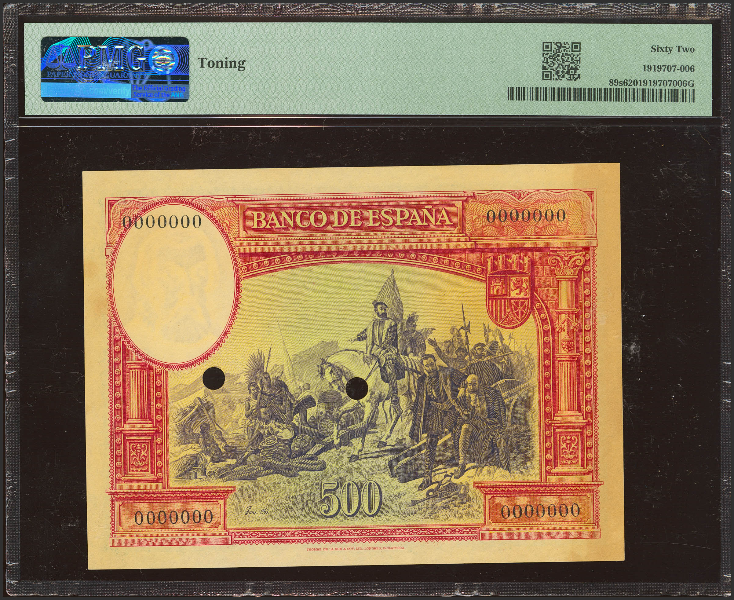 500 Pesetas. 7 de Enero de 1935. Numeración 0000000, taladro en las firmas y sin firma del cajero. (Edifil 2023: 365M, Pick: 89s). Rarísimo, tonalizado. SC-. Encapsulado PMG62 (toning).