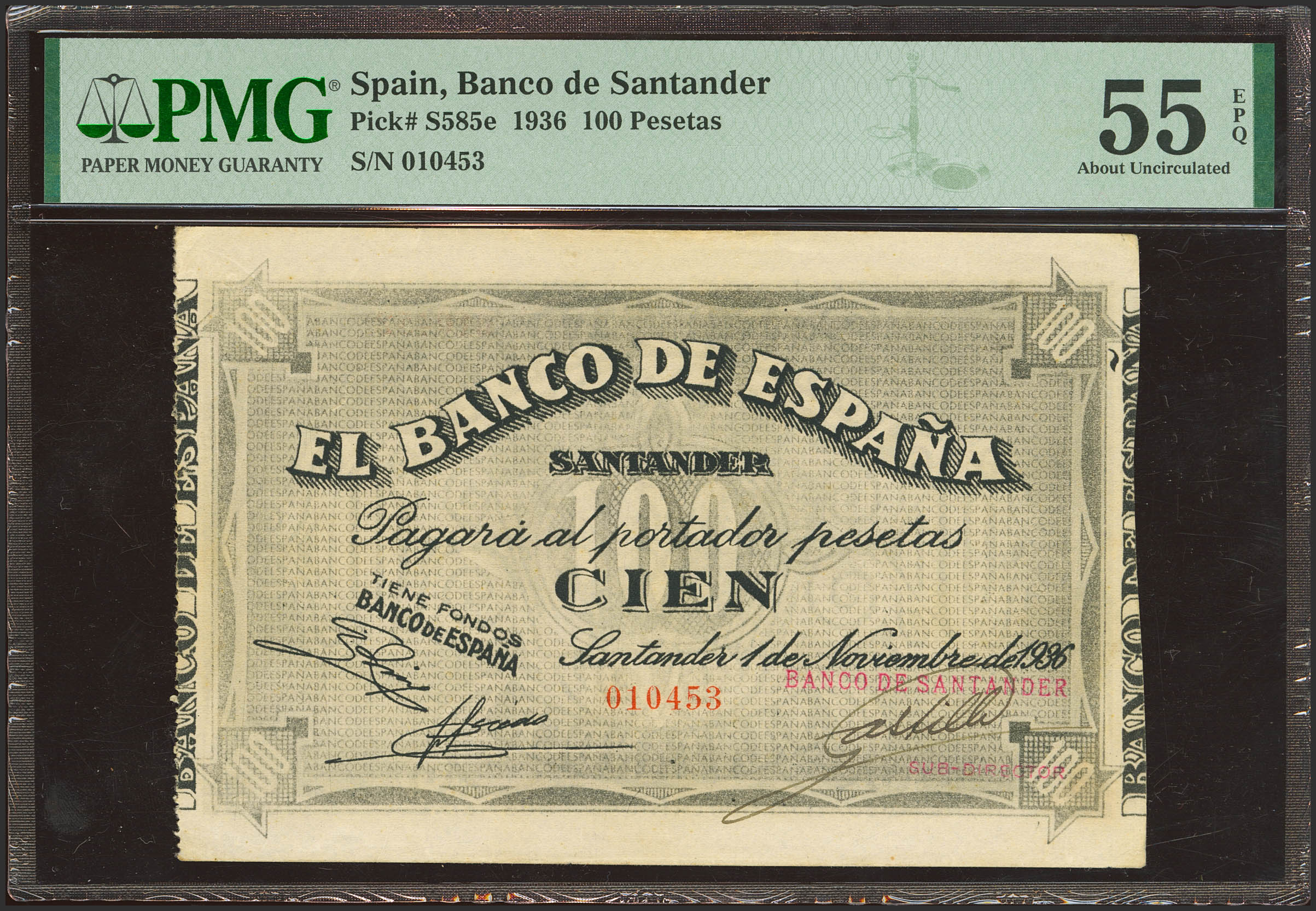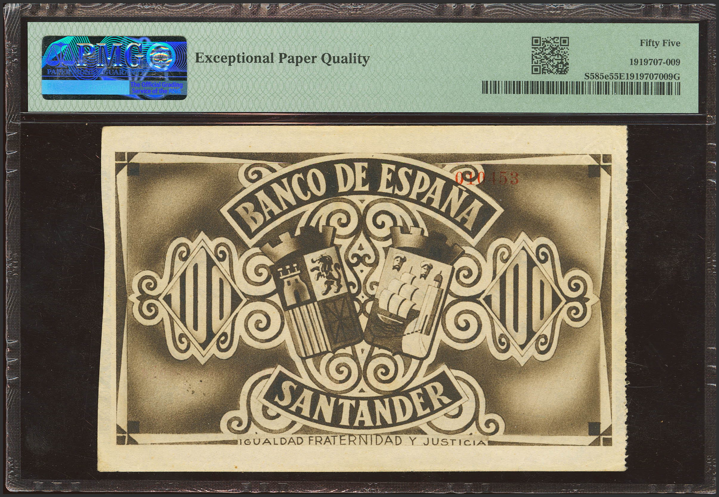 100 Pesetas. 1 de Noviembre de 1936. Sucursal de Santander, antefirma del Banco de Santander. Sin Serie. (Edifil 2023: 379g, Pick: S585e). Muy raro en esta excepcional calidad, apresto original. EBC+. Encapsulado PMG55EPQ (para hacernos idea de la rareza, a fecha 1 de Noviembre de 2024, se trata del billete mejor calificado en PMG, con esta antefirma).