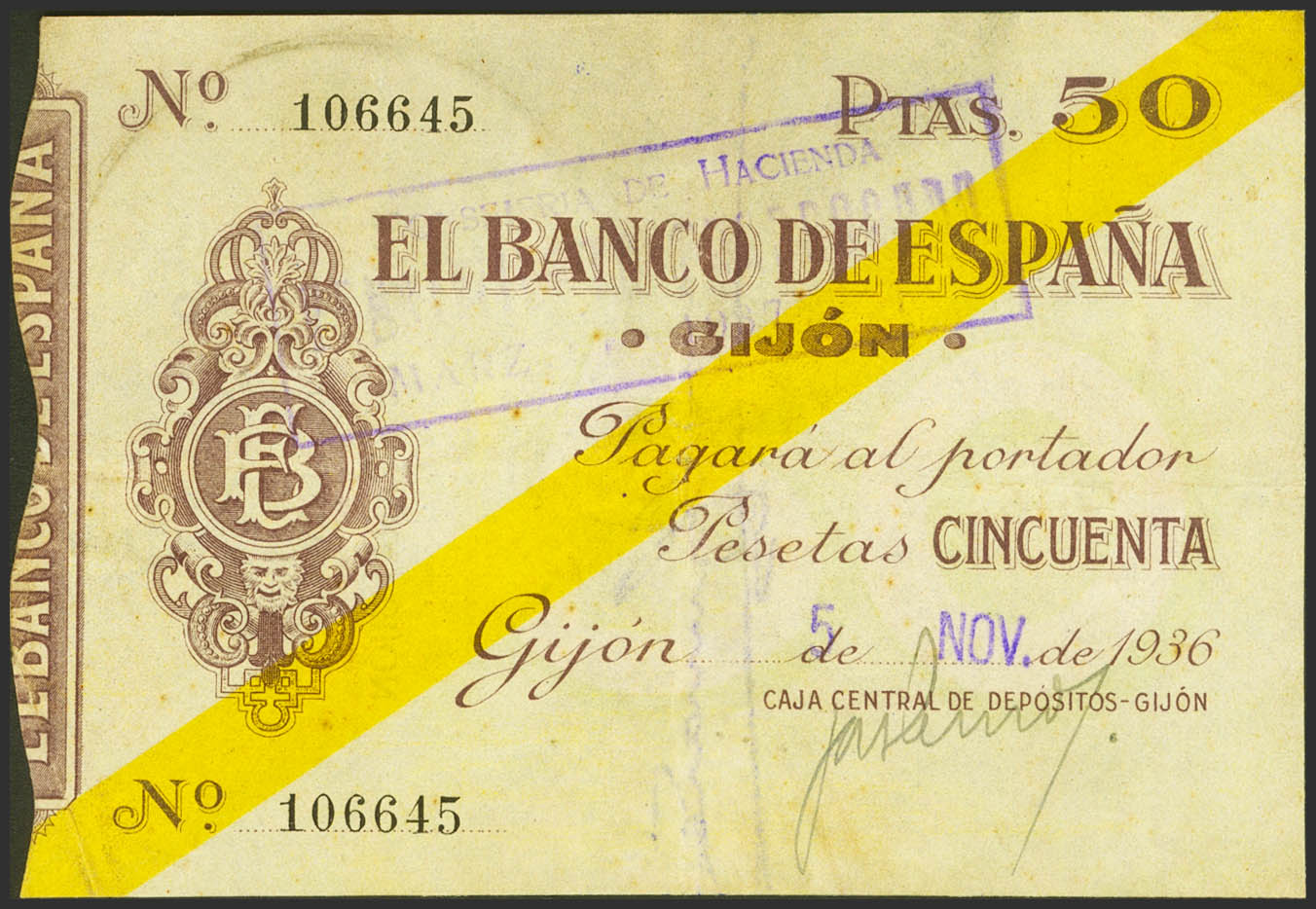 50 Pesetas. 5 de Noviembre de 1936. Sucursal de Gijón. Sin serie. (Edifil 2023: 383, Pick: S574). Inusual en esta calidad. EBC-.