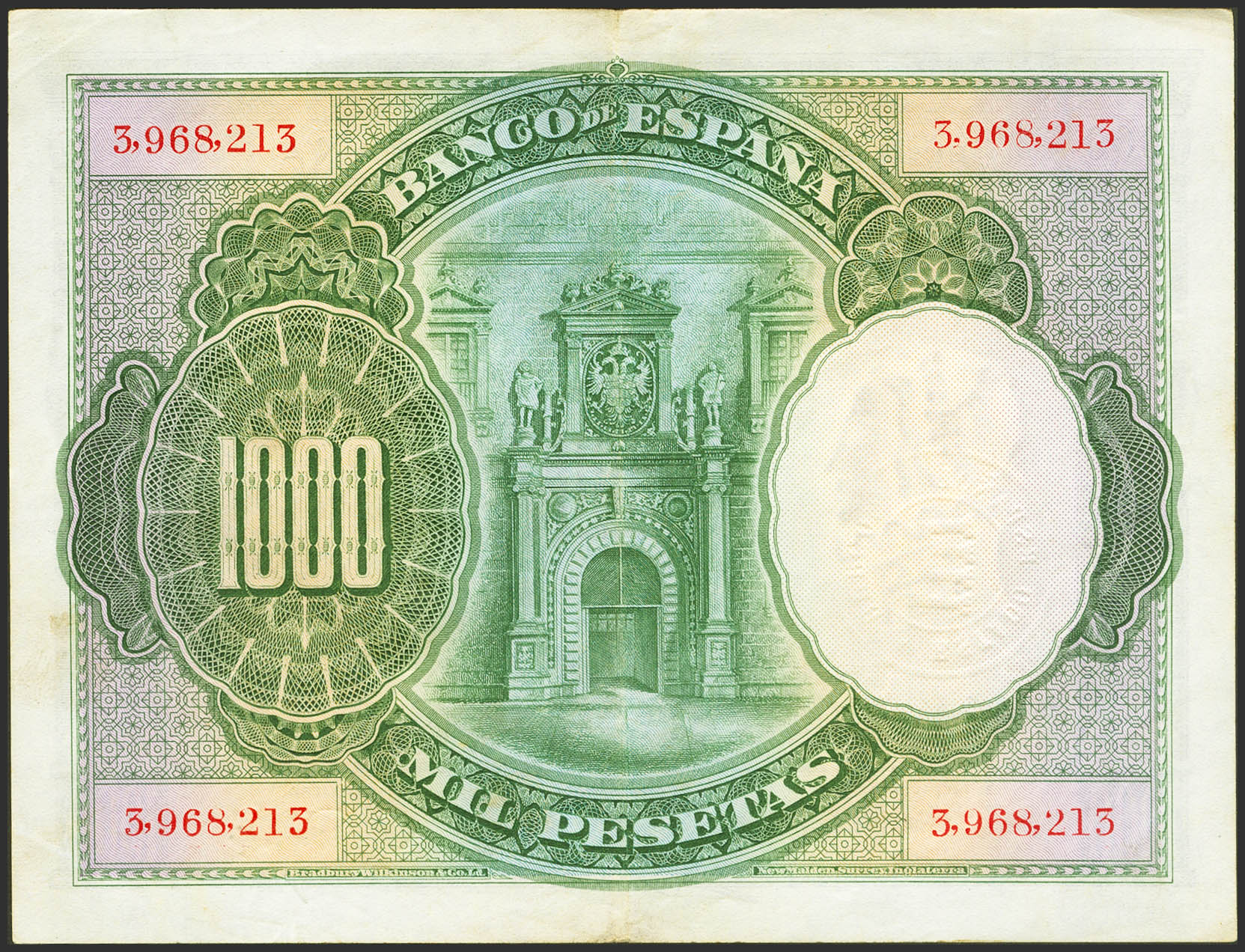 1000 Pesetas. 1 de Julio de 1925. Sin serie, numeración anterior a 3646000 y sello en seco "Estado Español / Burgos". (Edifil 2023: 416). MBC+.