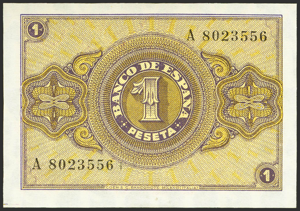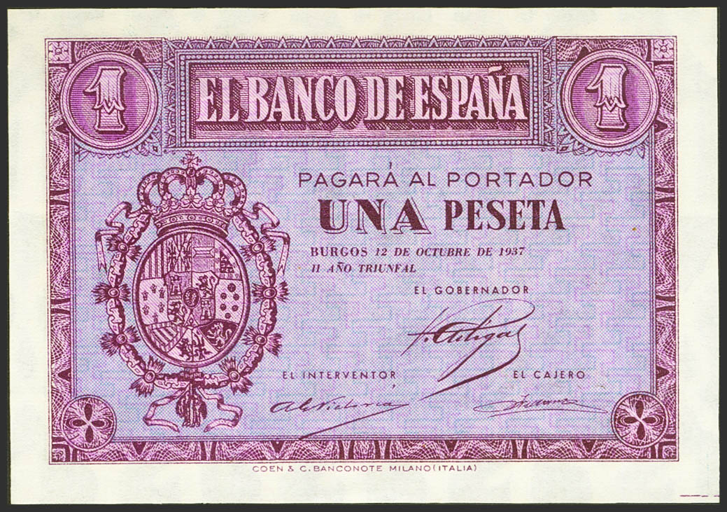 1 Peseta. 12 de Octubre de 1937. Serie A. (Edifil 2023: 425a, Pick: 104a). Conserva todo su apresto original. SC-.