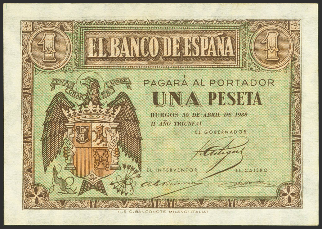 1 Peseta. 30 de Abril de 1938. Serie A. (Edifil 2023: 428, Pick: 108a). Conserva parte de su apresto original. EBC+++.