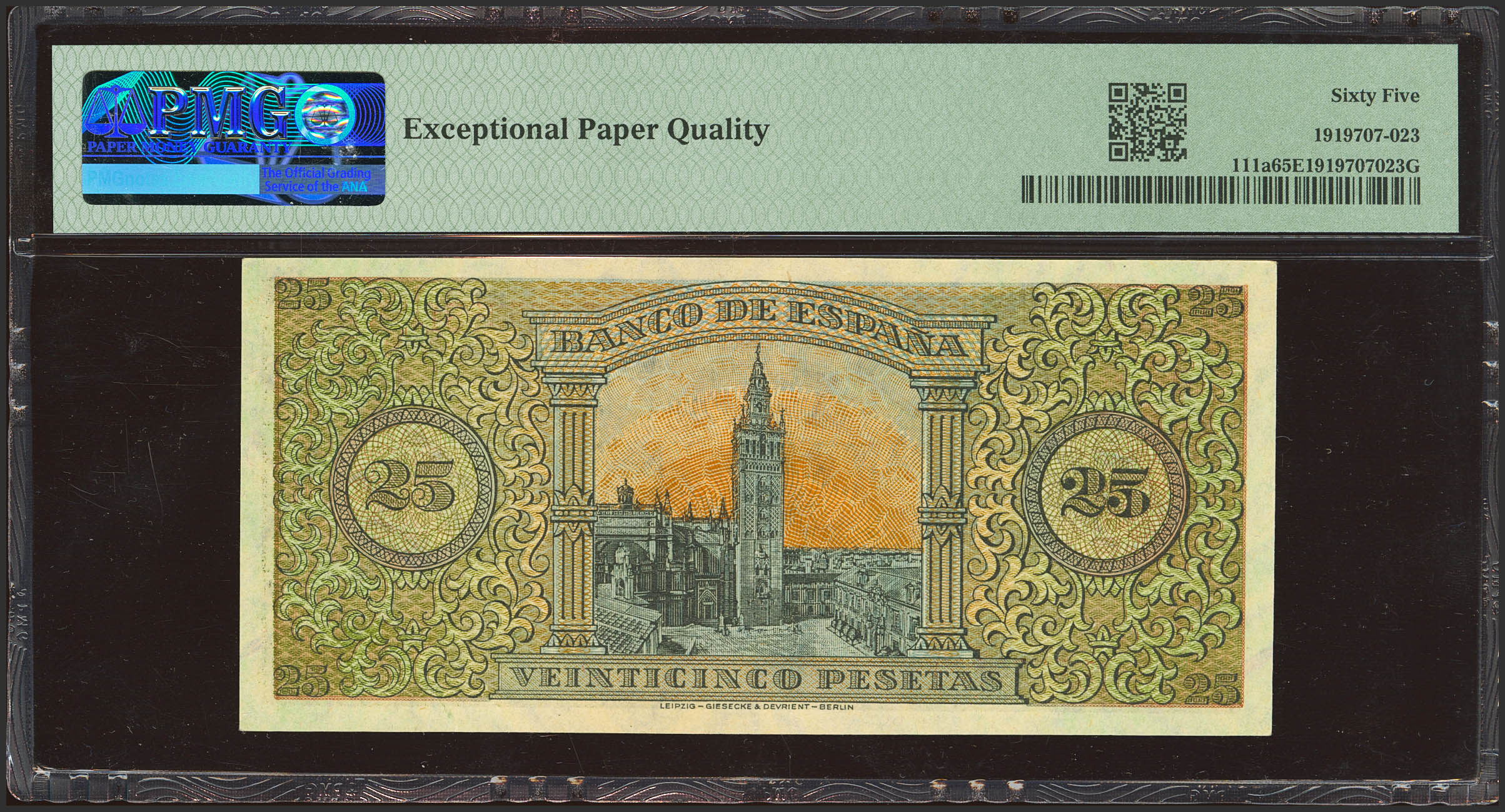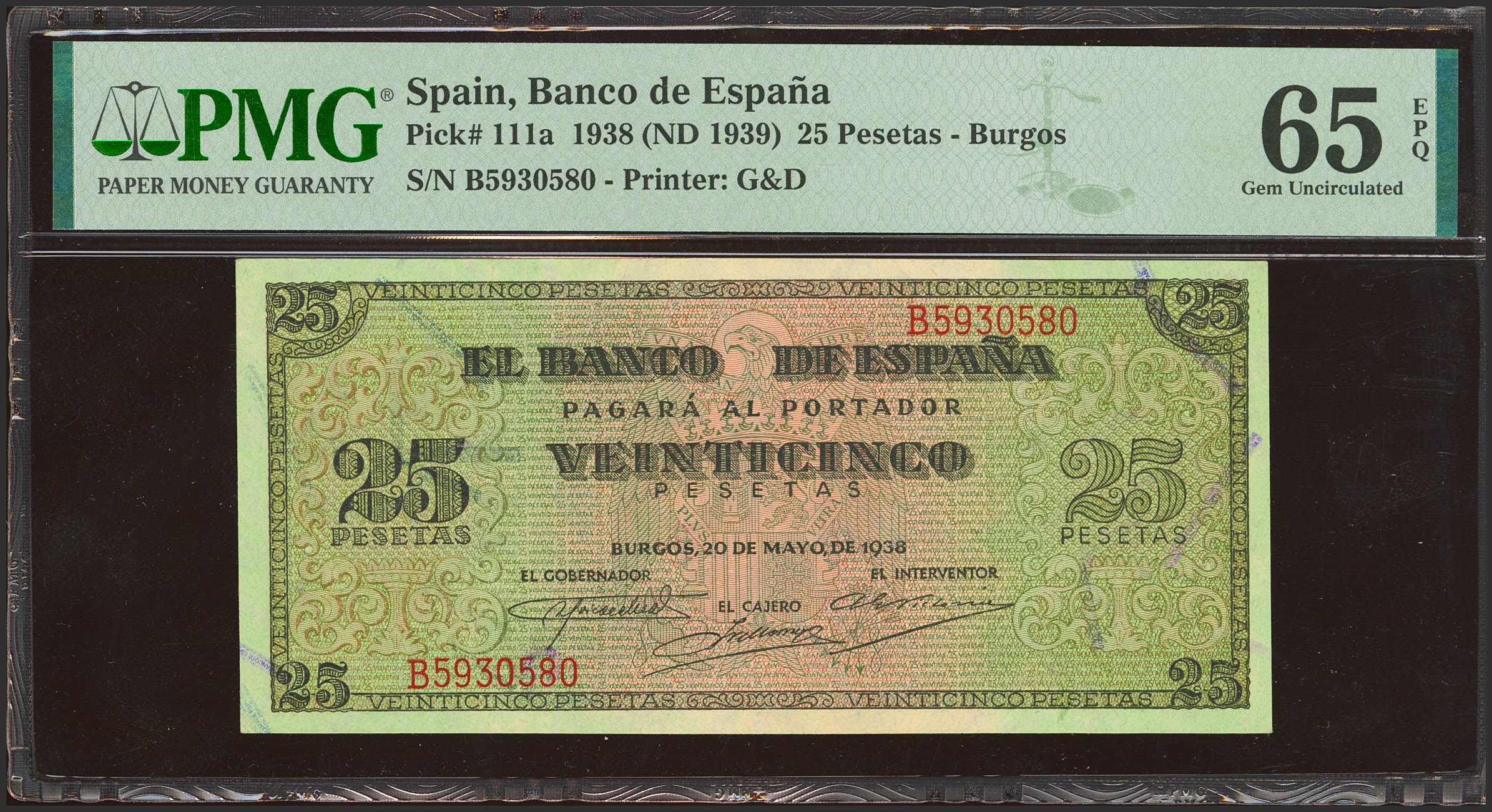 25 Pesetas. 20 de Mayo de 1938. Serie B. (Edifil 2023: 430a, Pick: 111a). Inusual en esta excepcional calidad, apresto original. SC. Encapsulado PMG65EPQ.