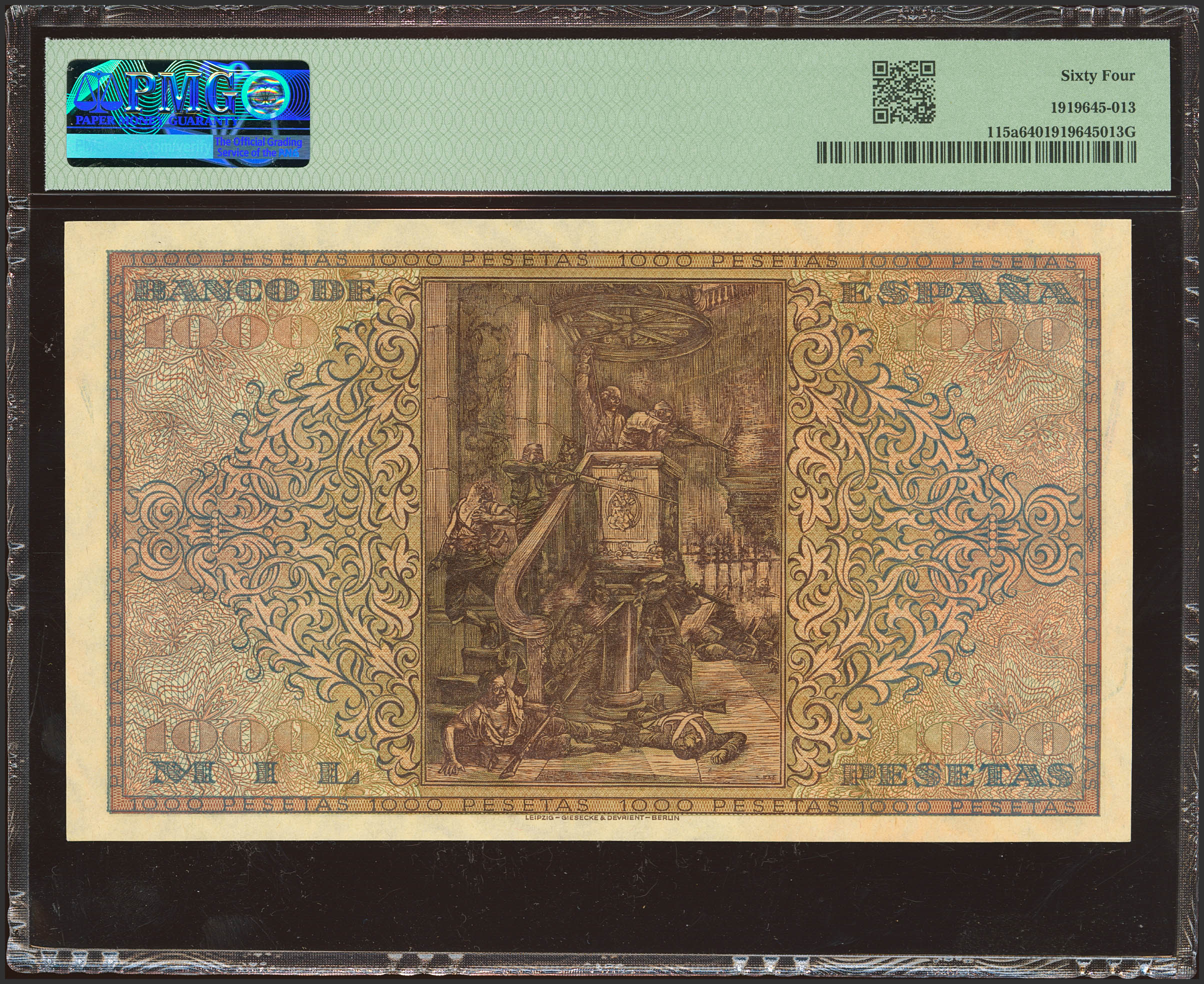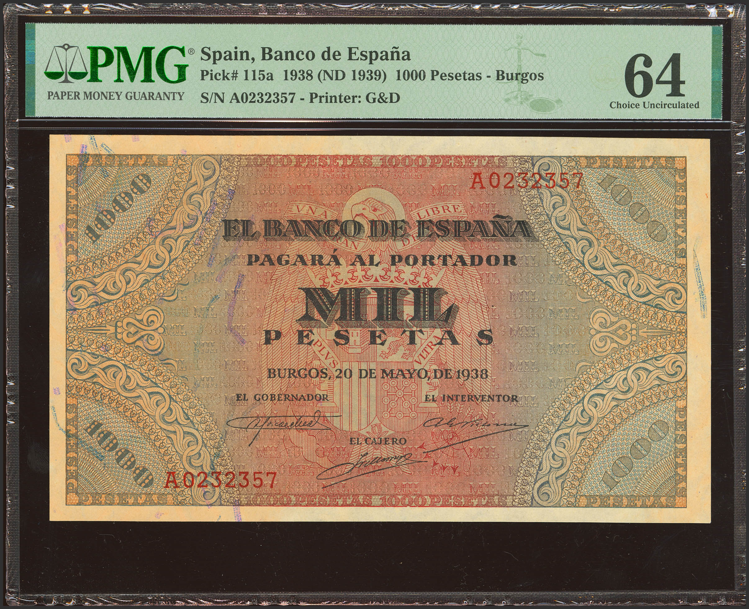 1000 Pesetas. 20 de Mayo de 1938. Serie A. (Edifil 2023: 434, Pick: 115a). Rarísimo, especialmente en esta calidad. SC. Encapsulado PMG64.