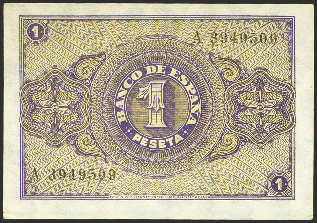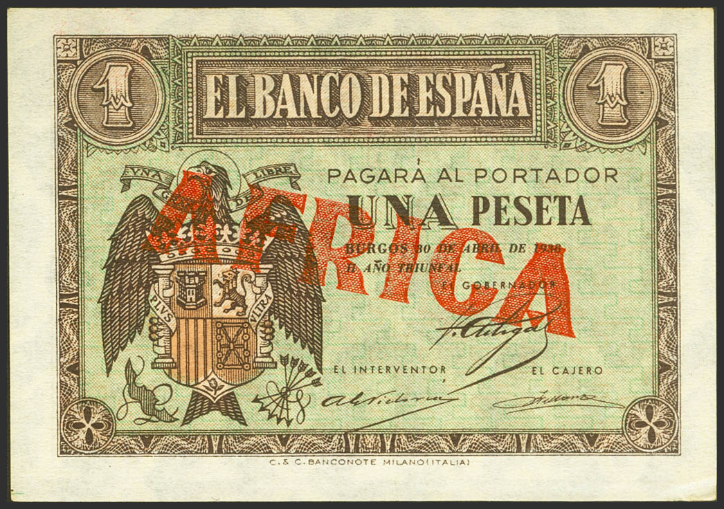 1 Peseta. 30 de Abril de 1938. Serie A. (Edifil 2023: 428A). Sobrecarga AFRICA, en rojo. Extremadamente raro, conserva todo su apresto original, coincide con el fotografiado en el catálogo Edifil y el subastado en la Subasta de Caja Madrid. SC-.La diferenciación del dinero circulante en algunos territorios de un país es un mecanismo ideado originalmente para evitar la fuga de capitales y mantener suficiente numerario en esa zona. Un mecanismo simple para realizar esta tarea es la utilización de sellos, húmedos o secos. Una Orden Ministerial de 22 de Abril de 1939 instó a estampillar la palabra “AFRICA” sobre las emisiones franquistas de 1938, en teoría con la justificación de prevenir el contrabando en el Protectorado de Marruecos, cifrado en unos 300 millones de pesetas. Sólo esos podrían circular en la región, evitándose su entrada ilegal en el resto del territorio español. La idea de este proyecto fue de Juan Beigbeder Atienza, por entonces Alto Comisario de España en Marruecos. Nunca existió una reglamentación oficial sobre el asunto, tan sólo dos propuestas del Ministerio de Hacienda, y no se llegaron a poner en circulación por miedo a la bajada de la cotización de la peseta en la zona de Tánger. Sí se grabaron unos cuños con la estampilla y se procedió a la estampación tipográfica en diagonal en el anverso de una serie de billetes. No está claro si se limitaron a crear una serie de muestra o si efectivamente se estampillaron millones de pesetas, porque los supervivientes son mínimos.Existen también falsificaciones de estos sellos realizadas mediante tampones húmedos en tiempos modernos. Las planchas originales, como se ha mencionado para impresión tipográfica, cuentan con un sutil entramado en el interior de cada letra precisamente para dificultar las falsificaciones; los tampones modernos no la pueden reproducir.Huelga decir que estos billetes, auténticos, son extraordinariamente raros, si no únicos.