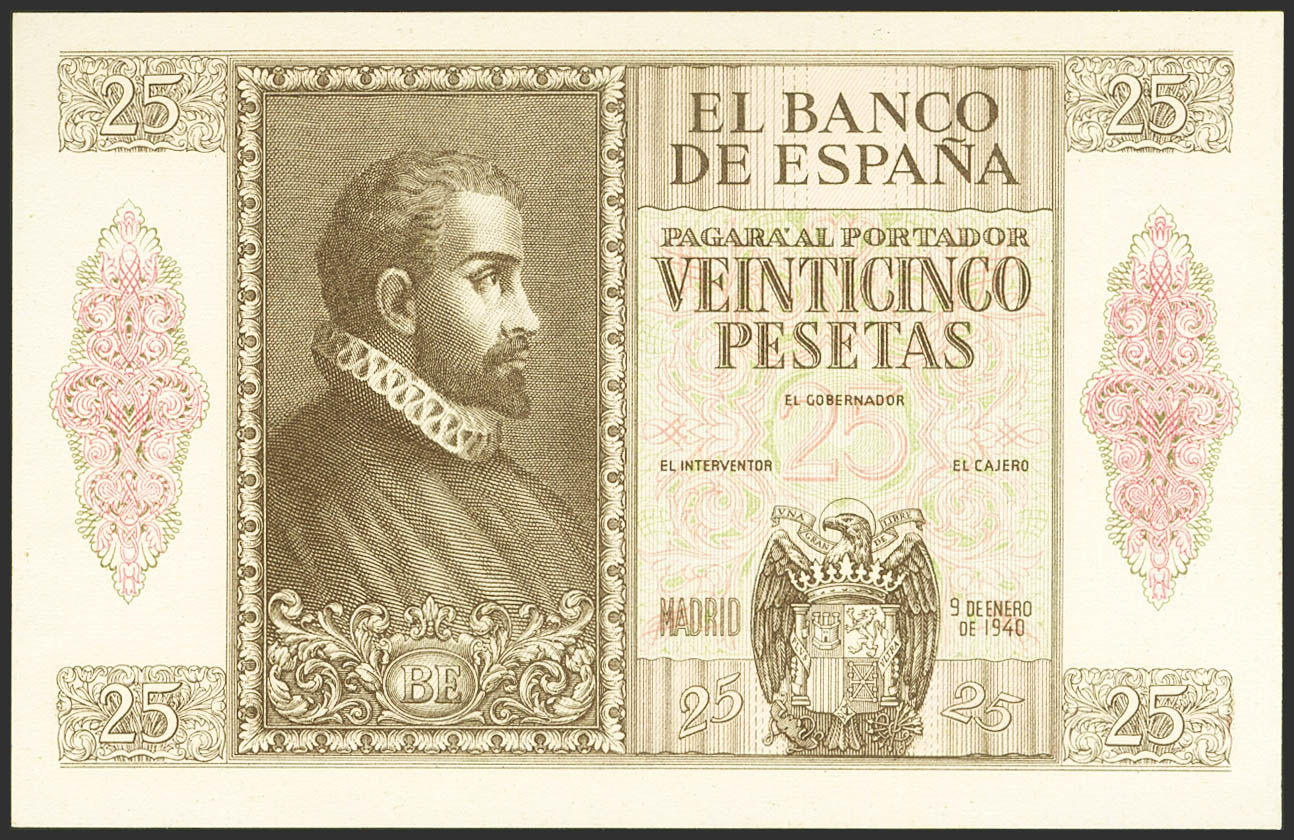 25 Pesetas. 9 de Enero de 1940. NO EMITIDO. Prueba del anverso en un color no definitivo y sin numeración. (Edifil 2023: NE49P). Extraordinariamente rara, previamente montado sobre cartulina. SC-.