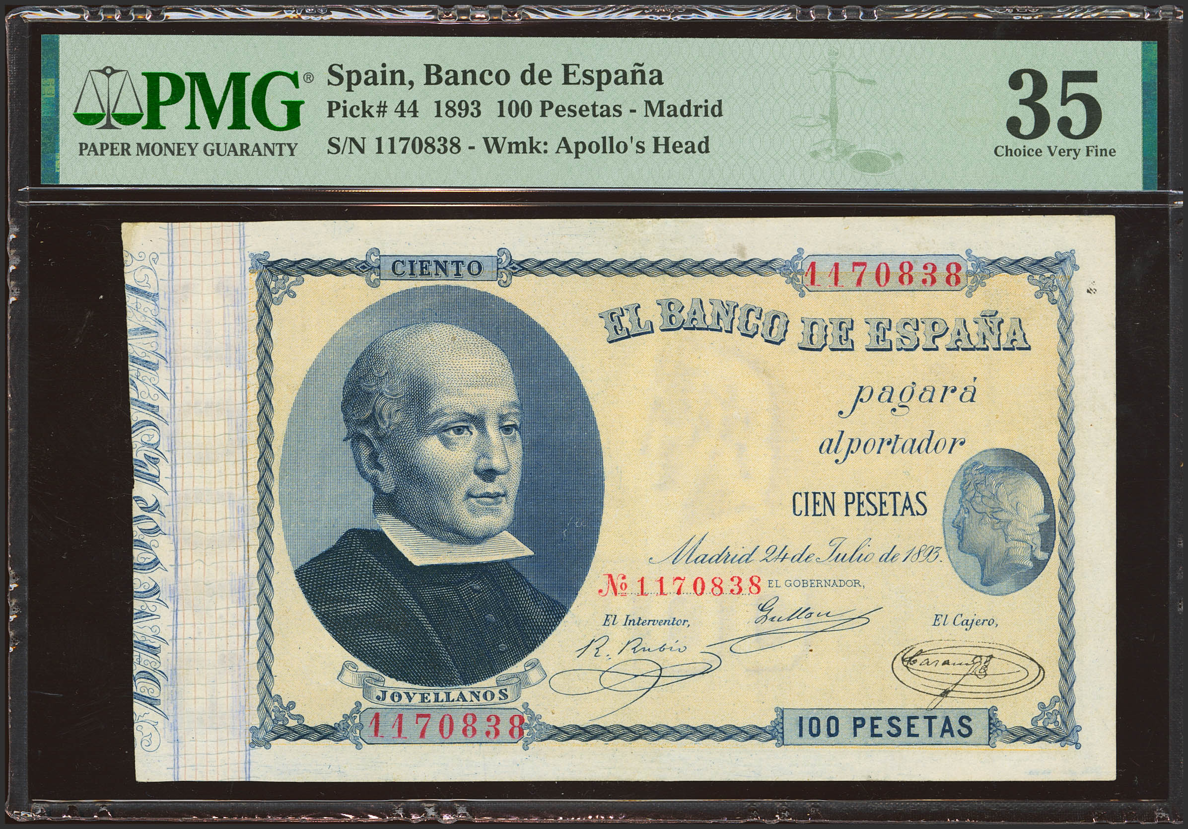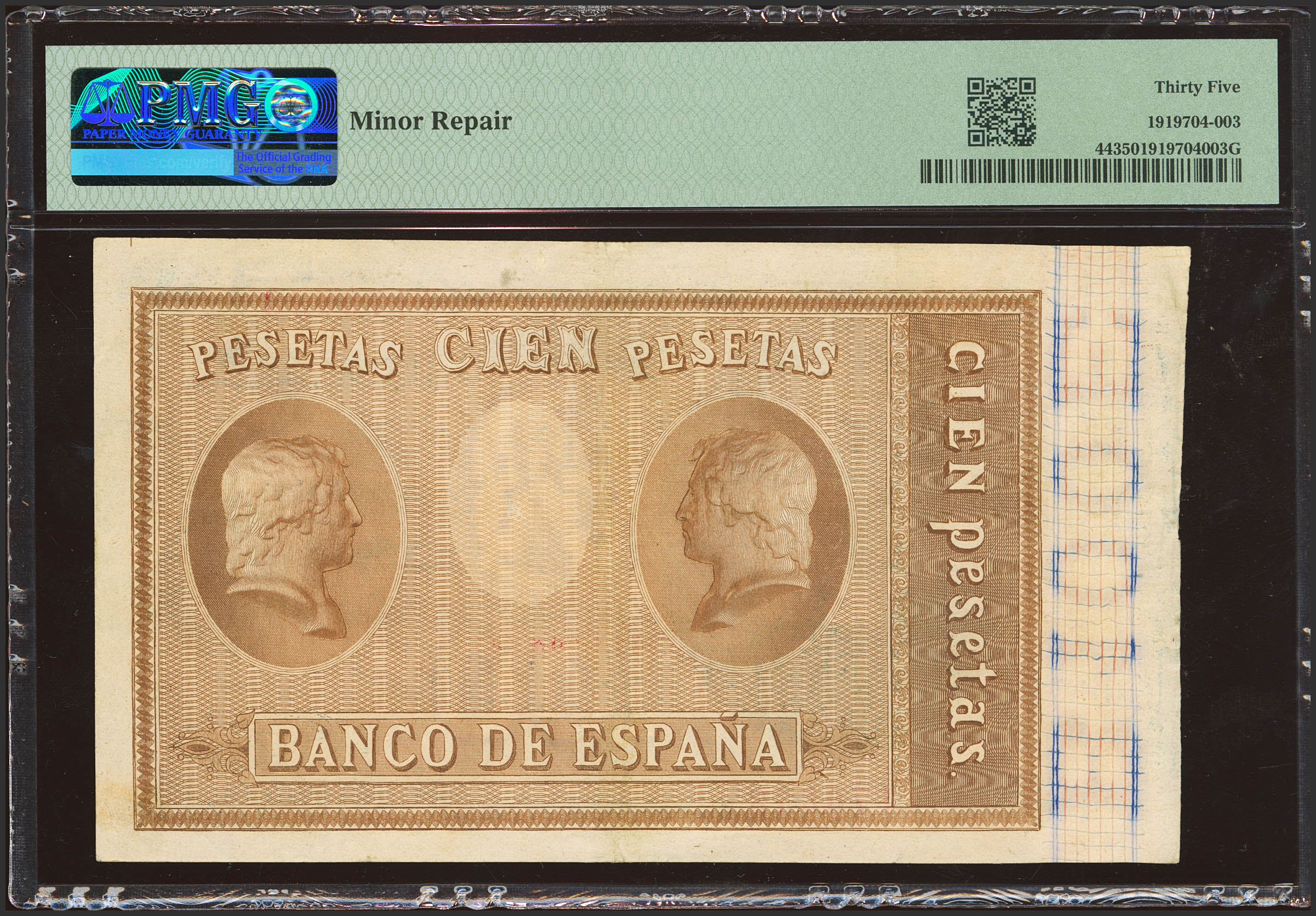 100 Pesetas. 24 de Julio de 1893. Sin serie. (Edifil 2023: 302, Pick: 44). Raro, mínimamente reparado. MBC+. Encapsulado PMG35 (minor repair).