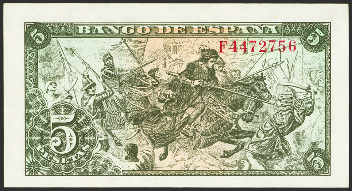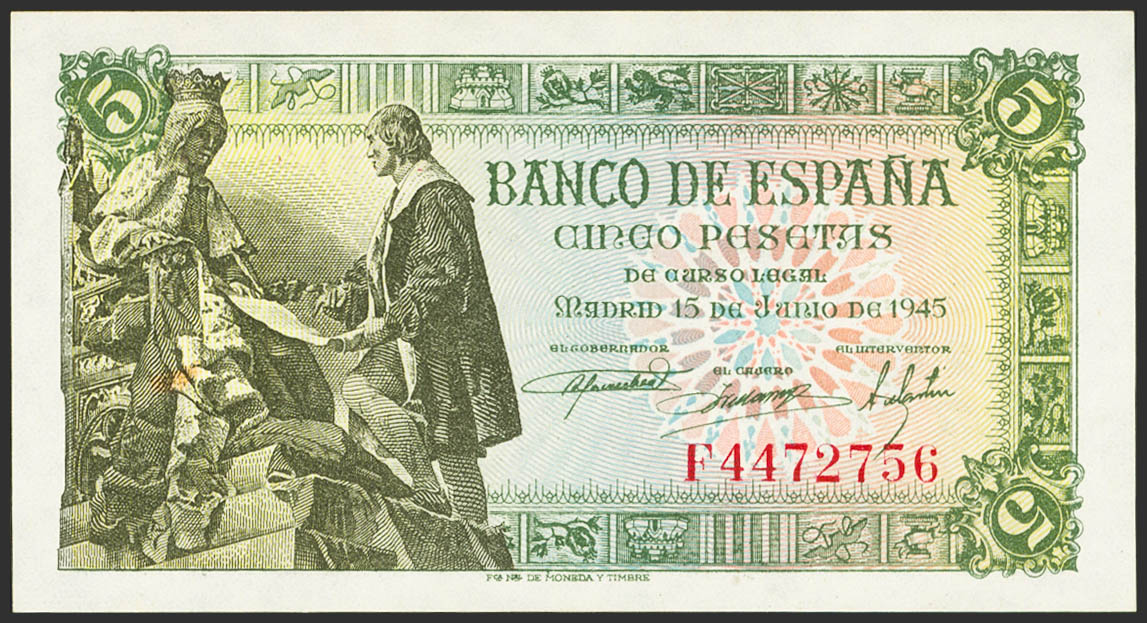 5 Pesetas. 15 de Julio de 1945. Serie F. (Edifil 2023: 449a, Pick: 129a). Apresto original. SC.