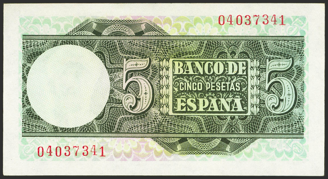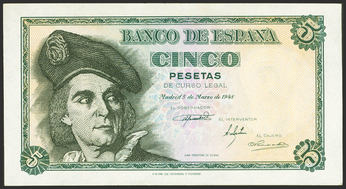 5 Pesetas. 5 de Marzo de 1948. Sin serie. (Edifil 2023: 455, Pick: 136a). Apresto original. SC.