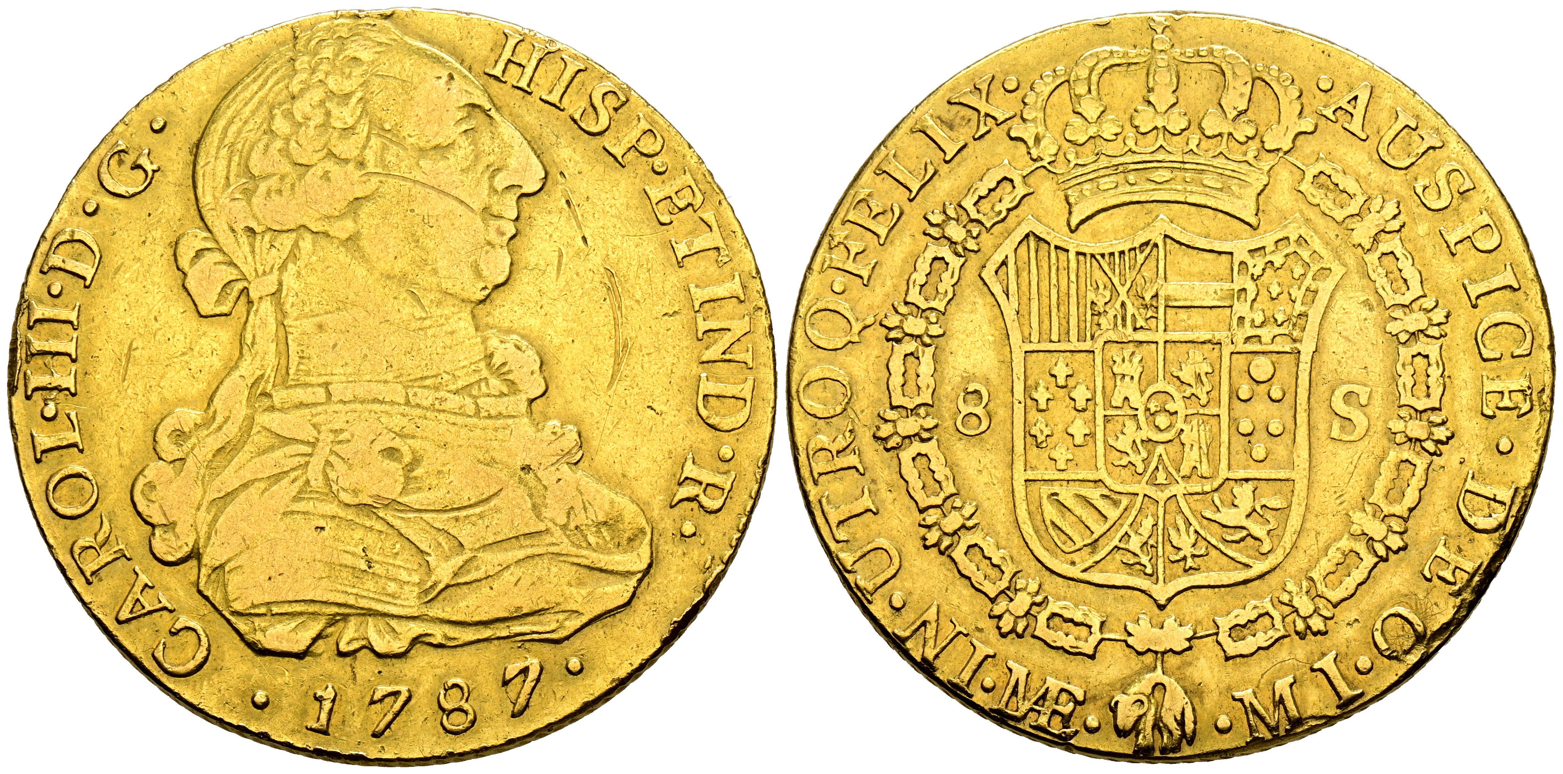 CARLOS III (1759-1788). 8 Escudos (Au. 23,71g/35mm). 1787/6. Lima MI. (Cal-2019-1950). MBC-/MBC. Recortada.