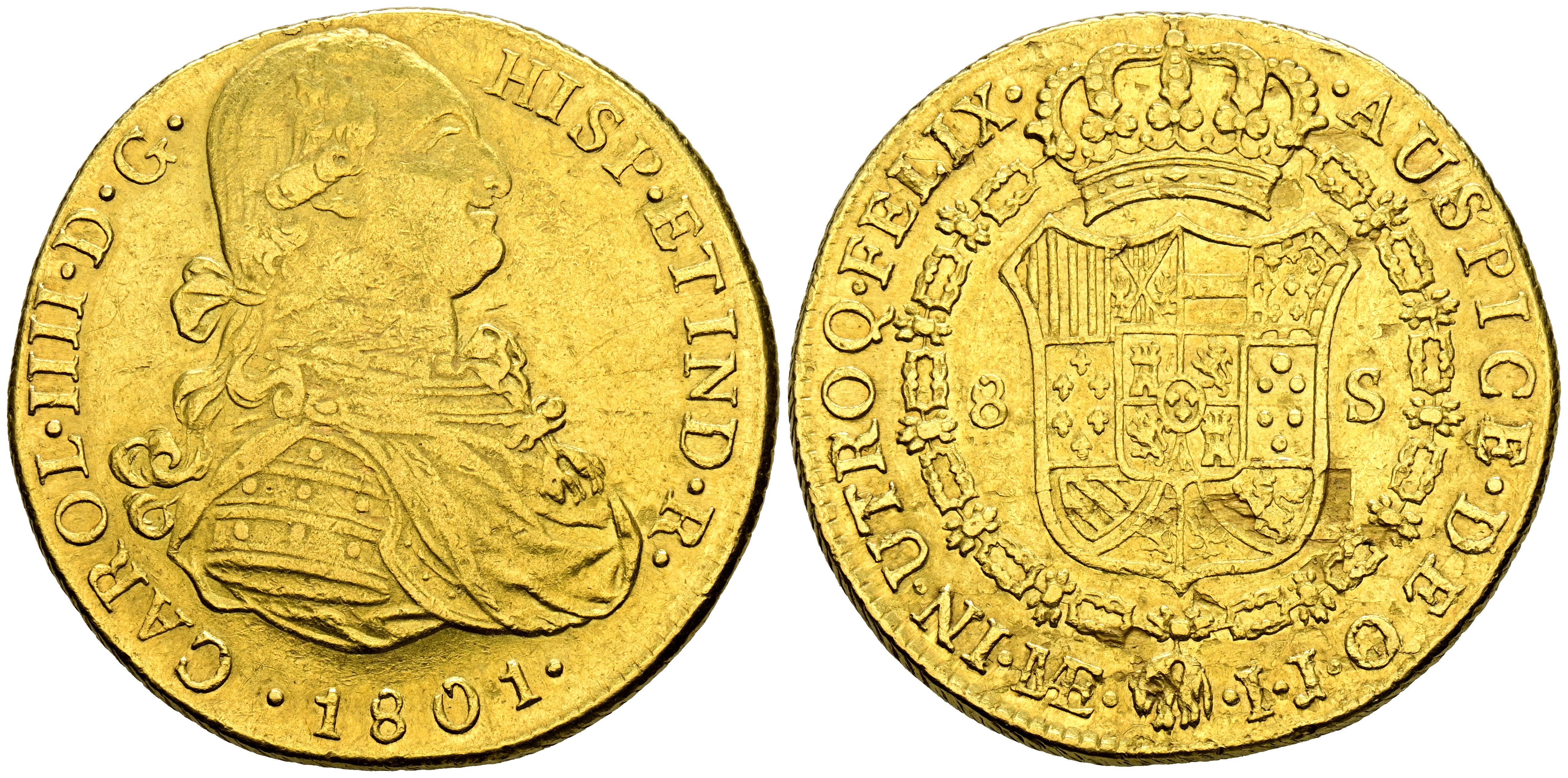 CARLOS IV (1788-1808). 8 Escudos. (Au. 26,78g/36mm). 1801. Lima IJ. (Cal-2019-1602). MBC.
