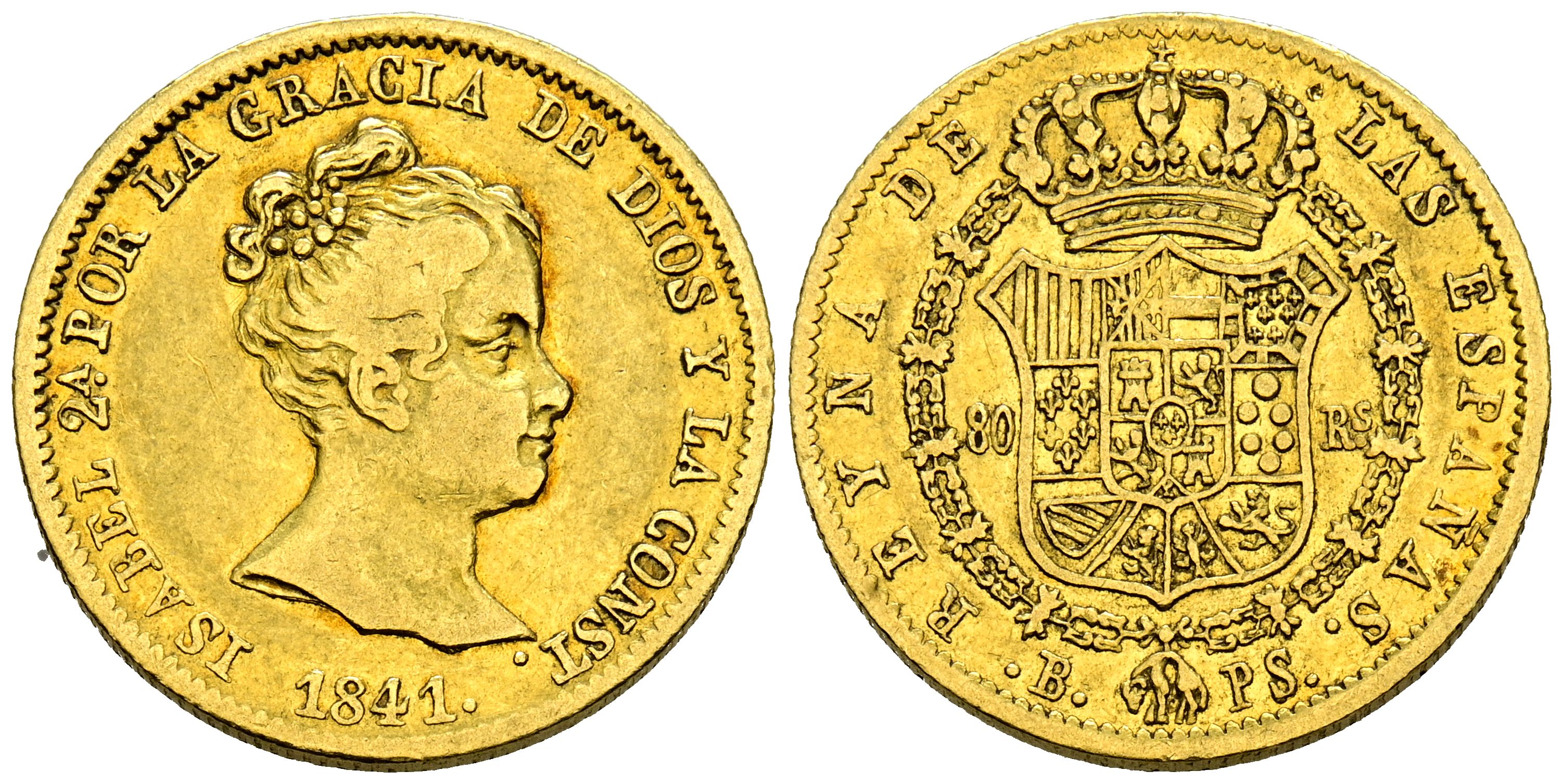 ISABEL II (1833-1868). 80 Reales. (Au. 6,71g/21mm). 1841. Barcelona PS. (Cal-2019-707). MBC.