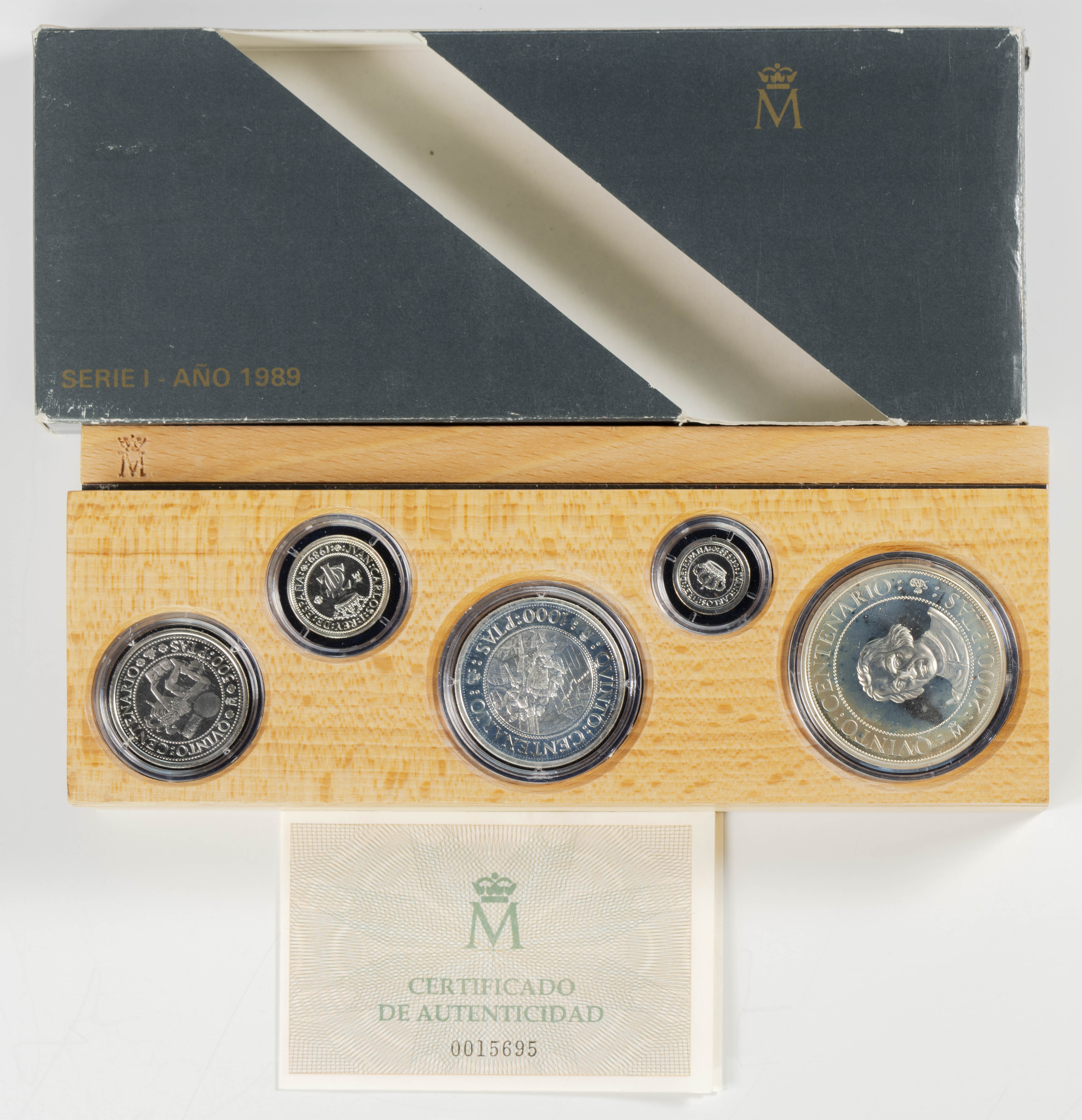 JUAN CARLOS I (1975-2014). Estuche completo compuesto por 5 monedas en plata de valores comprendidos entre 100 y 2000 Pesetas. Quinto Centenario. 1989. Serie I. FNMT. FDC Brillo. Incluye estuche original y certificado de autenticidad.